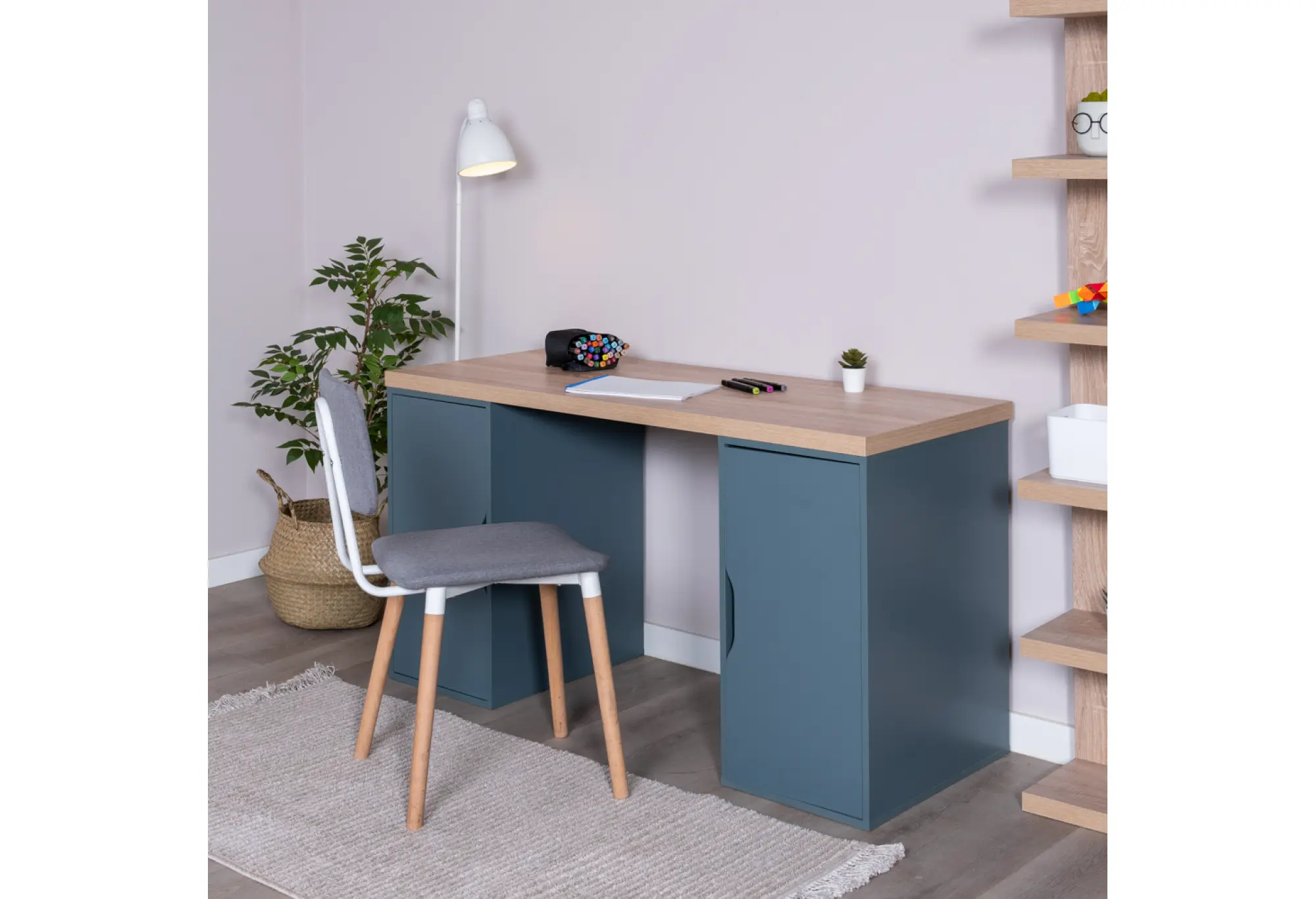 Корпус выполнен из ДСП и тамбурат – это обеспечивает надежность конструкции и устойчивость к повседневным нагрузкам. Светлый оттенок дуба на столешнице визуально “облегчает” мебель, а серо-бирюзовые опоры придают столу современный и сдержанный характер, который уместен как в домашнем кабинете, так и в подростковой комнате или современном офисе.
