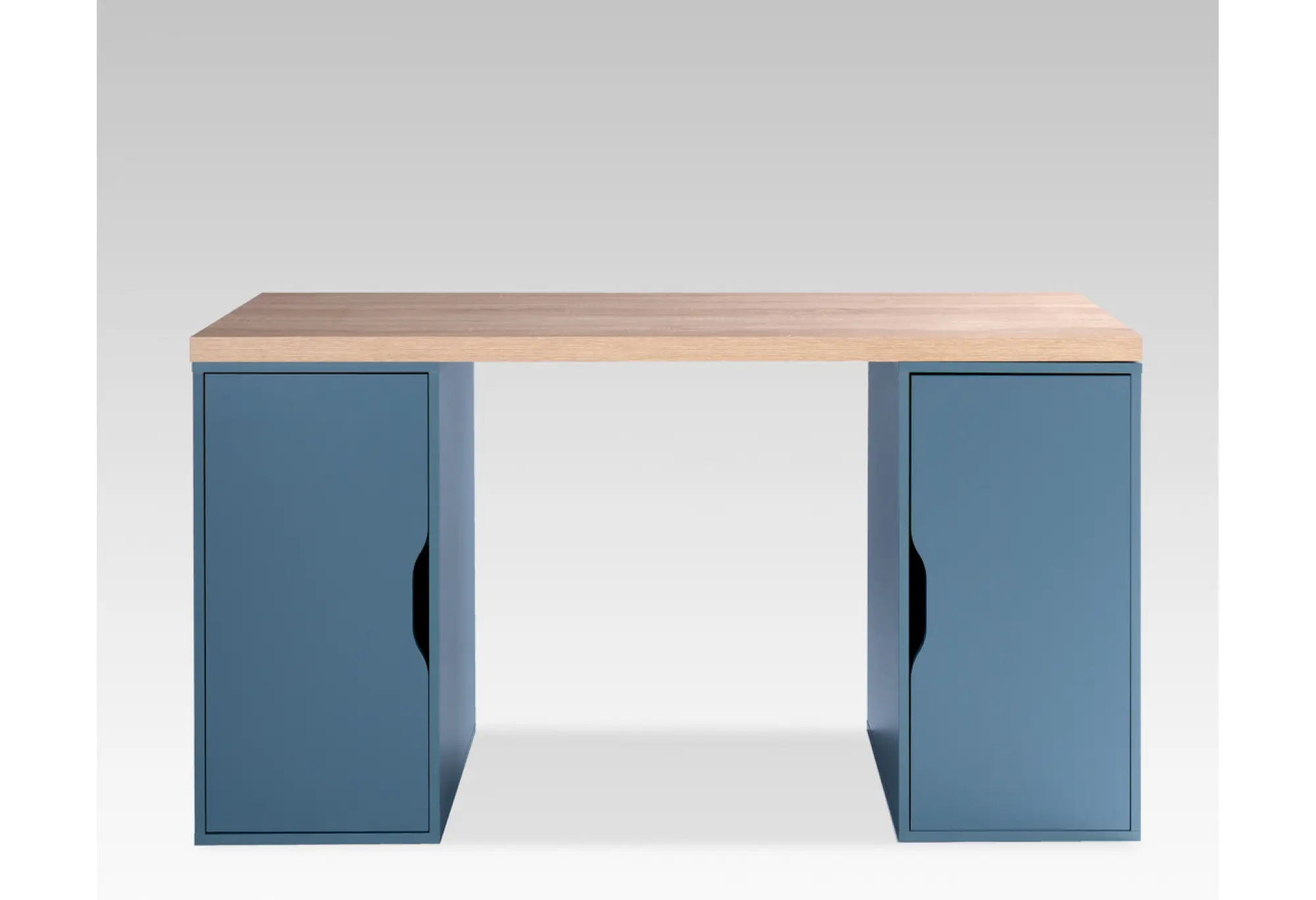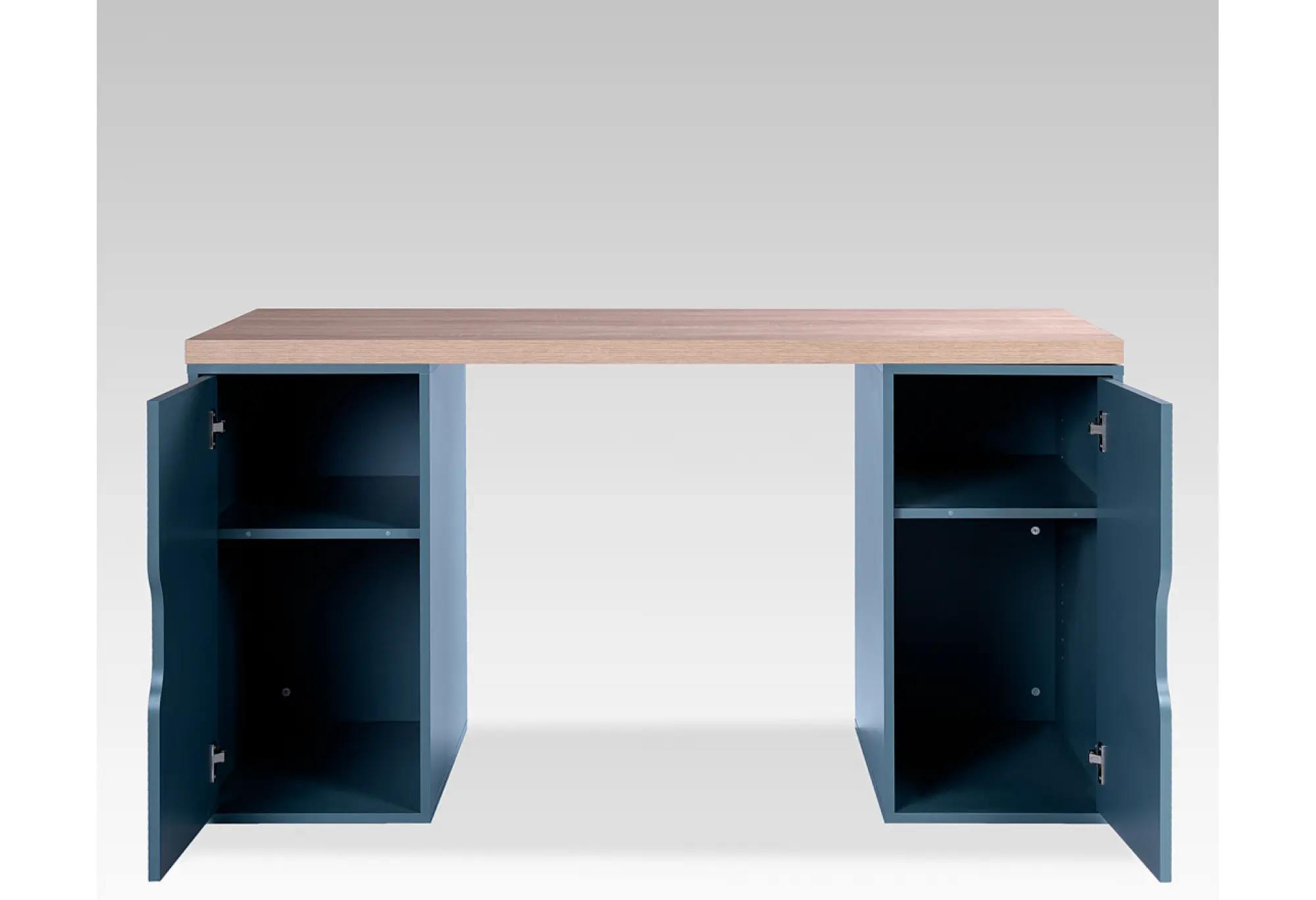Две боковые тумбы с распашными дверцами создают закрытое пространство для хранения. Внутри удобно разместить бумаги, оргтехнику, книги или личные вещи, поддерживая порядок на рабочей поверхности. Вертикальные выемки вместо ручек делают фасады более безопасными и удобными в использовании, а также упрощают уход за поверхностью.