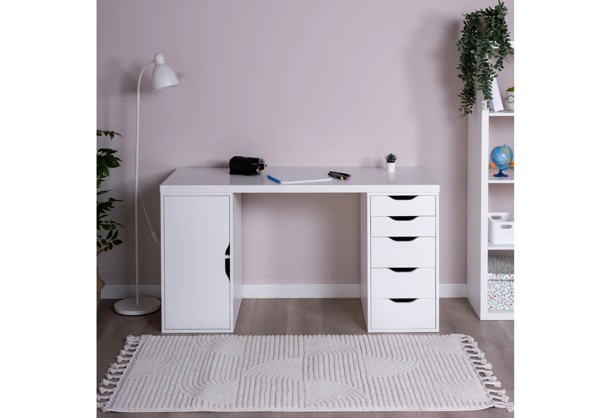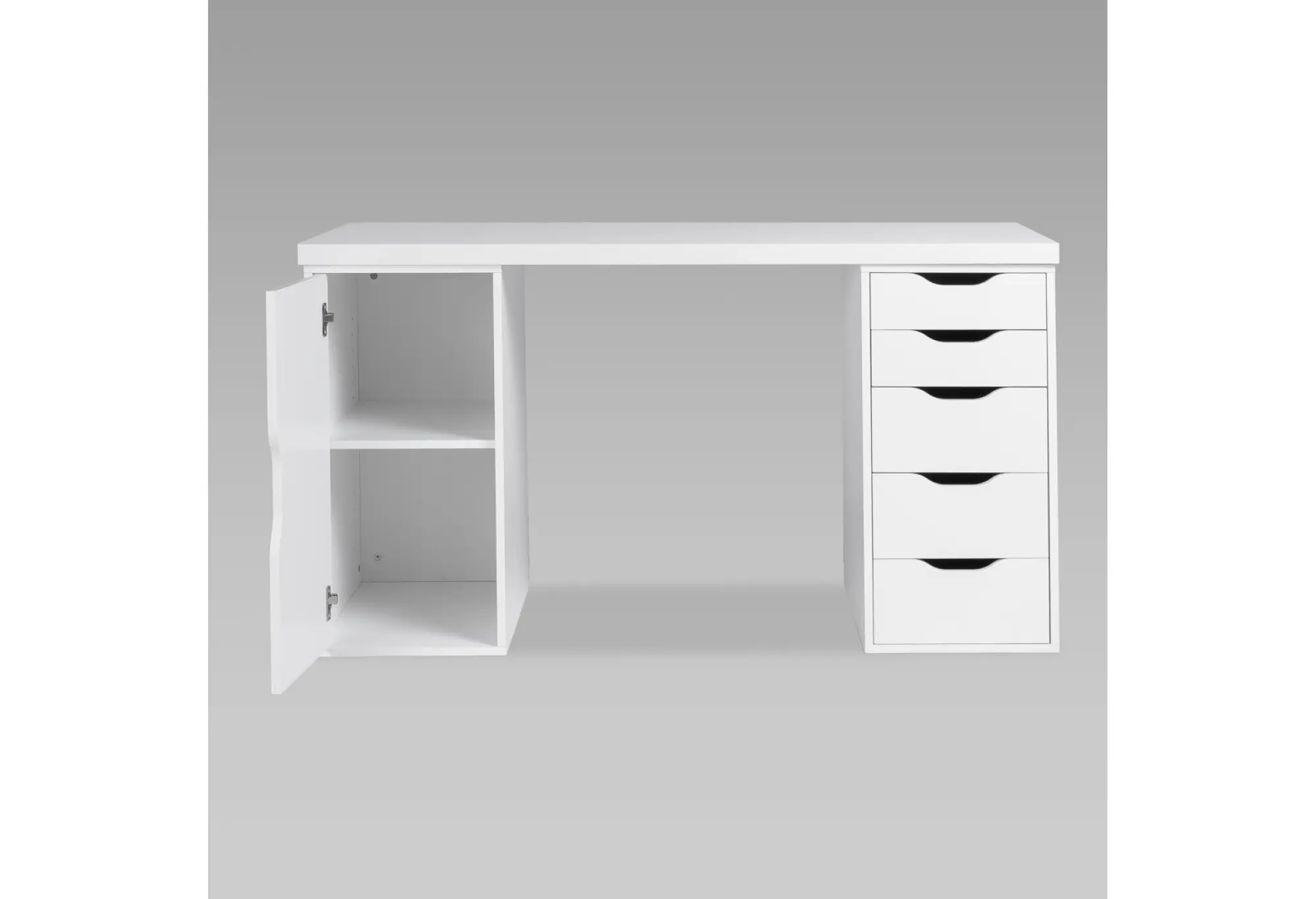 Справа расположены пять выдвижных ящиков, в которых удобно хранить мелкие предметы, бумагу, гаджеты и личные вещи, освобождая столешницу от лишних предметов. Слева — отделение с дверцей для более габаритных папок, коробок или техники. Фасады без выступающих ручек с вырезами под захват подчеркивают современный, спокойный дизайн и делают стол визуально легким.