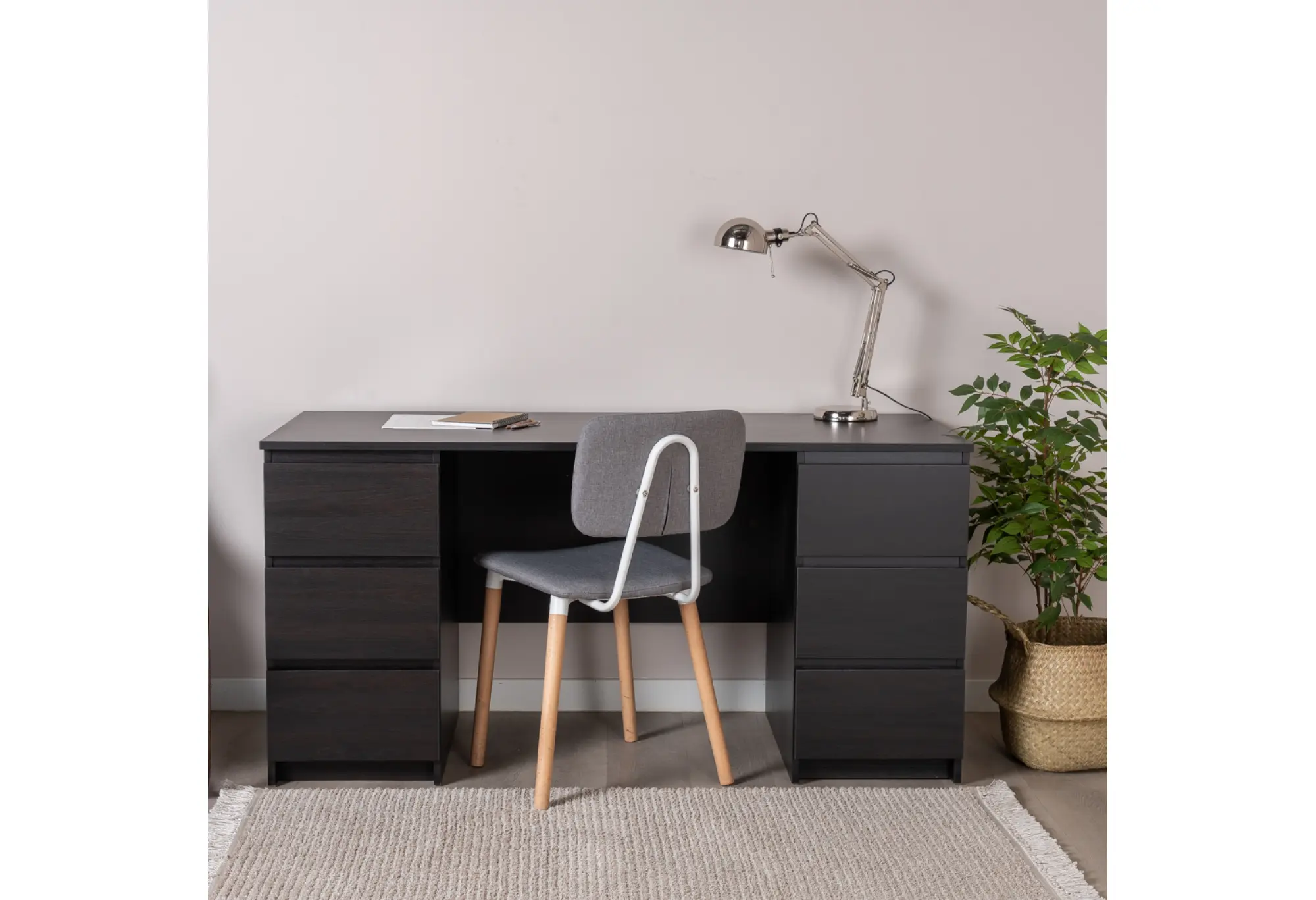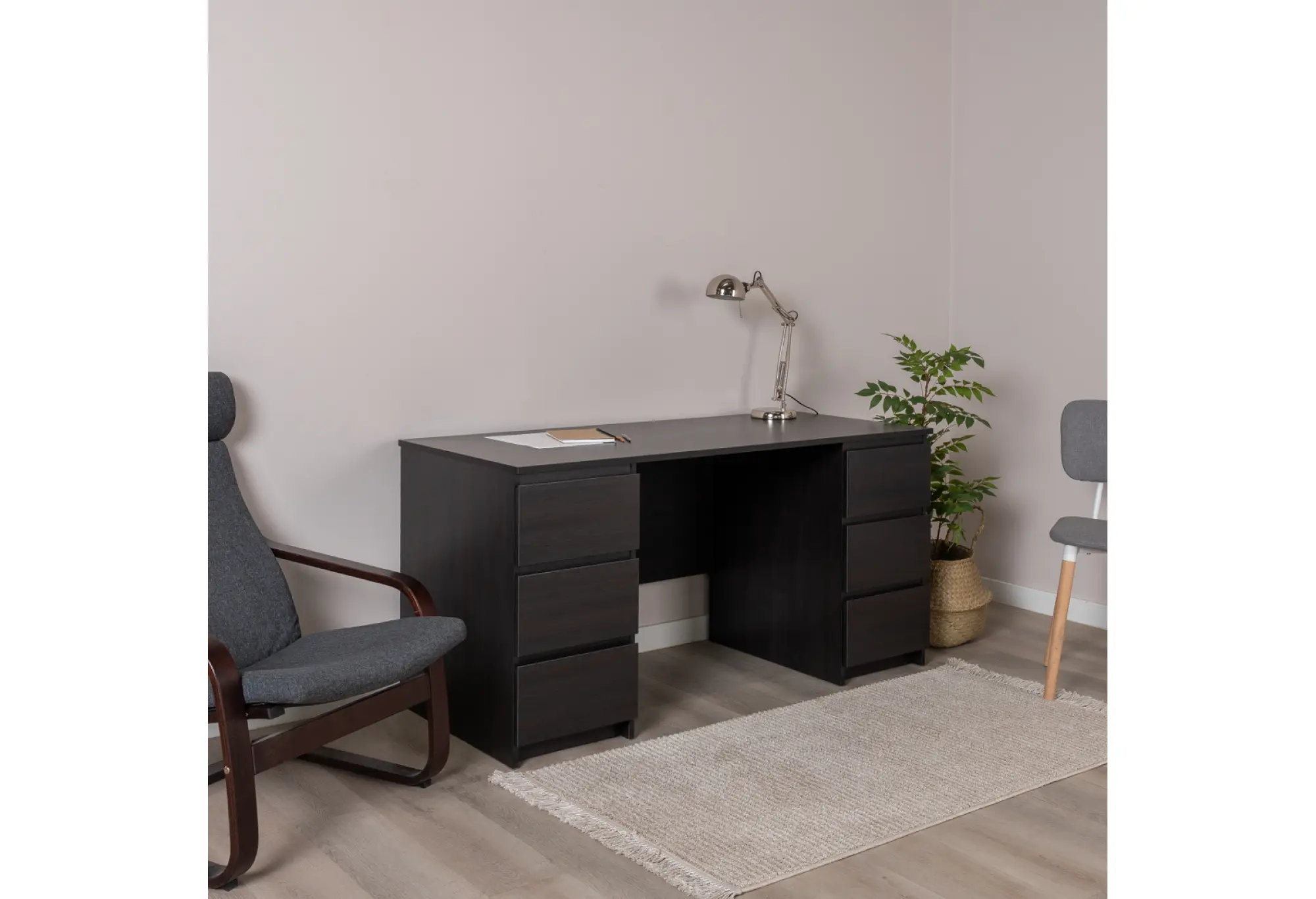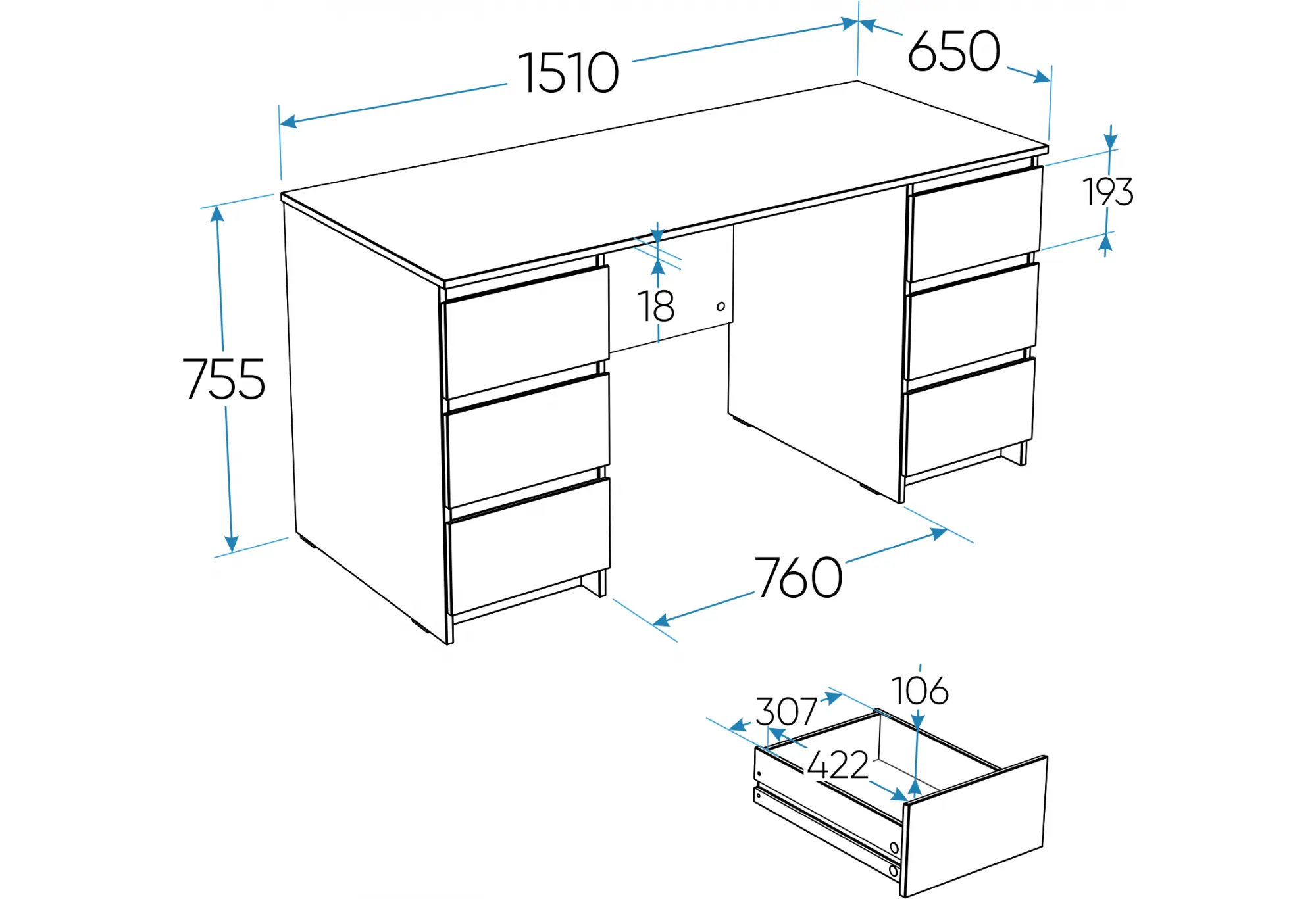 Конструкция стола двухтумбовая - по обеим сторонам расположены по три выдвижных ящика, всего шесть, что обеспечивает удобную организацию бумаг, офисных мелочей и личных вещей. Все ящики наружные, с фронтальными панелями в едином стиле, что создаёт аккуратный и цельный внешний вид.