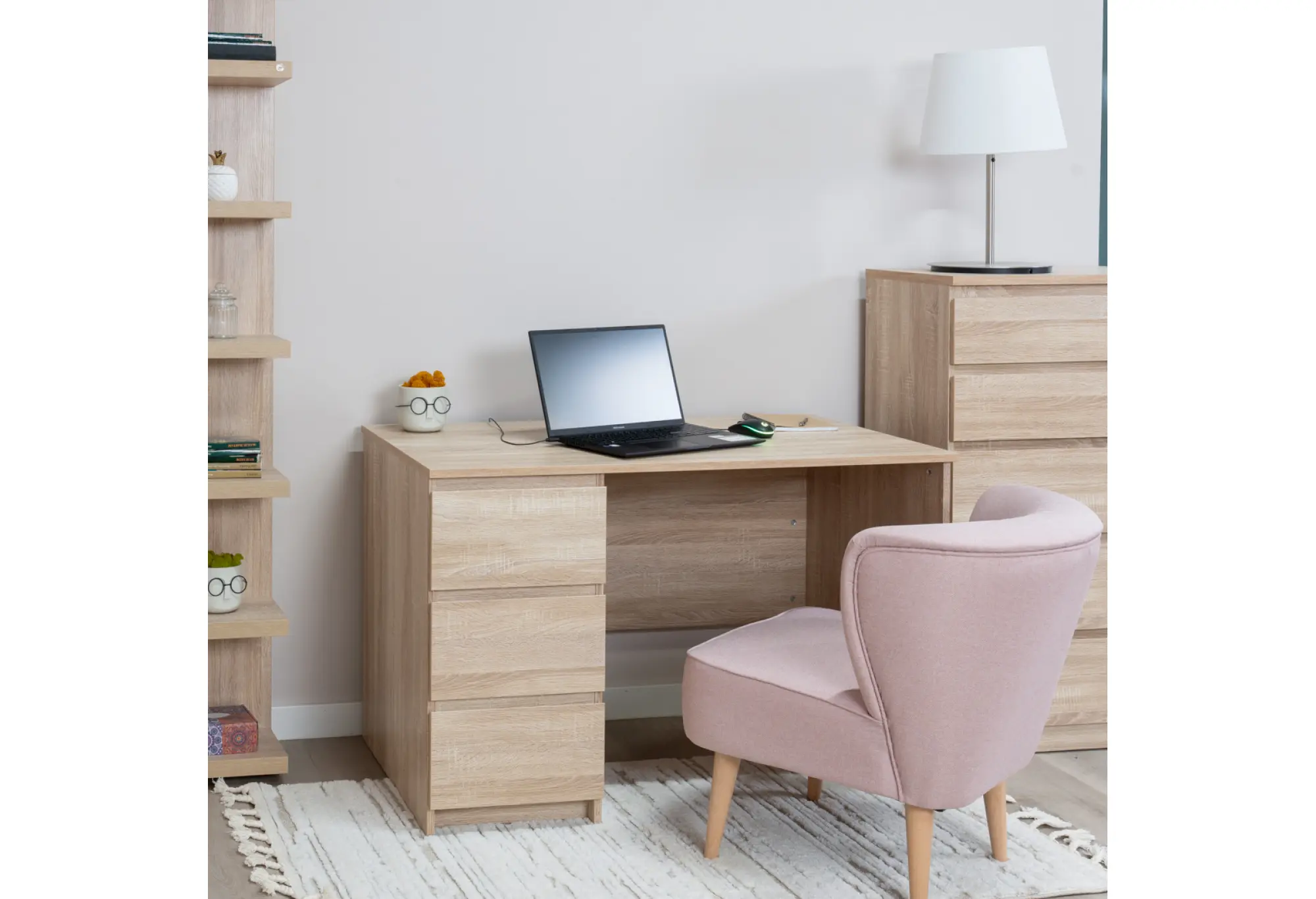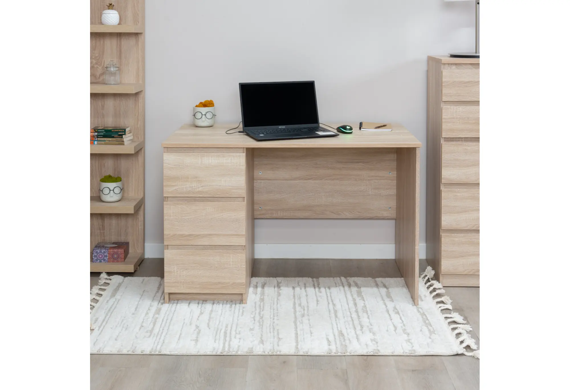 Письменный стол КАСТОР в цвете Дуб Сонома выполнен из кашированного ДСП толщиной 16 мм и рассчитан на ежедневное использование в рабочем или учебном пространстве. Габариты 1156x650x750 мм обеспечивают достаточно места для размещения компьютера, офисной техники и необходимых принадлежностей, при этом стол легко вписывается в обстановку комнаты или кабинета. Однотумбовая конструкция с тремя наружными выдвижными ящиками позволяет удобно организовать хранение документов, канцелярии и других мелочей, поддерживая порядок на столешнице. Тумбу с ящиками можно установить как справа, так и слева, что делает стол удобным как для правшей, так и для левшей и позволяет подстроиться под планировку помещения. Спокойный оттенок Дуб Сонома визуально смягчает интерьер и хорошо сочетается с различными цветовыми решениями мебели. Прямые линии и лаконичный дизайн создают аккуратный, современный вид, подходящий как для домашнего кабинета, так и для рабочего места в офисе. Стол рассчитан на использование в жилых и общественных помещениях, при этом предусмотрен различный гарантийный срок в зависимости от назначения.