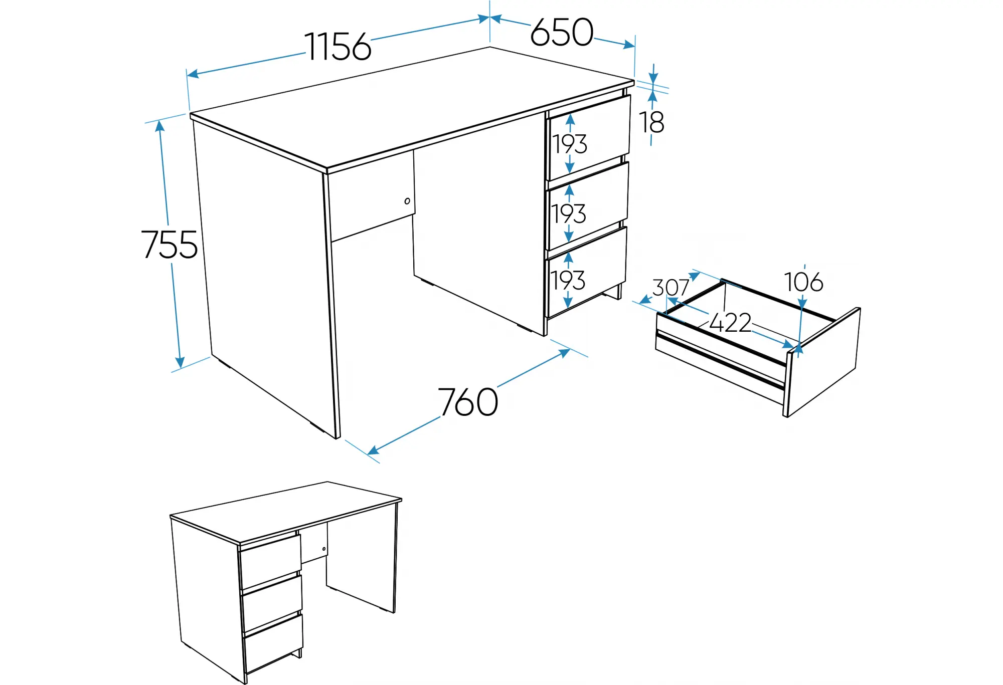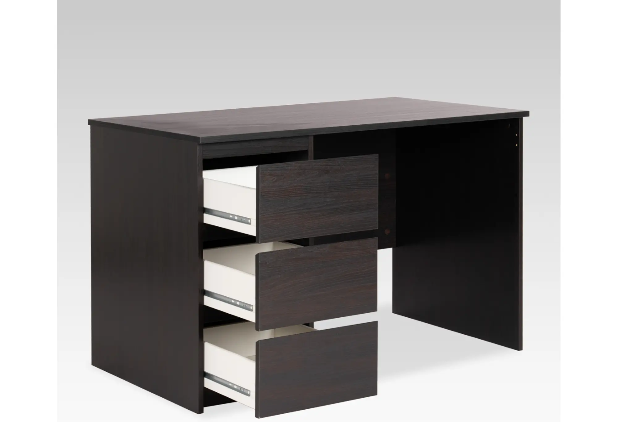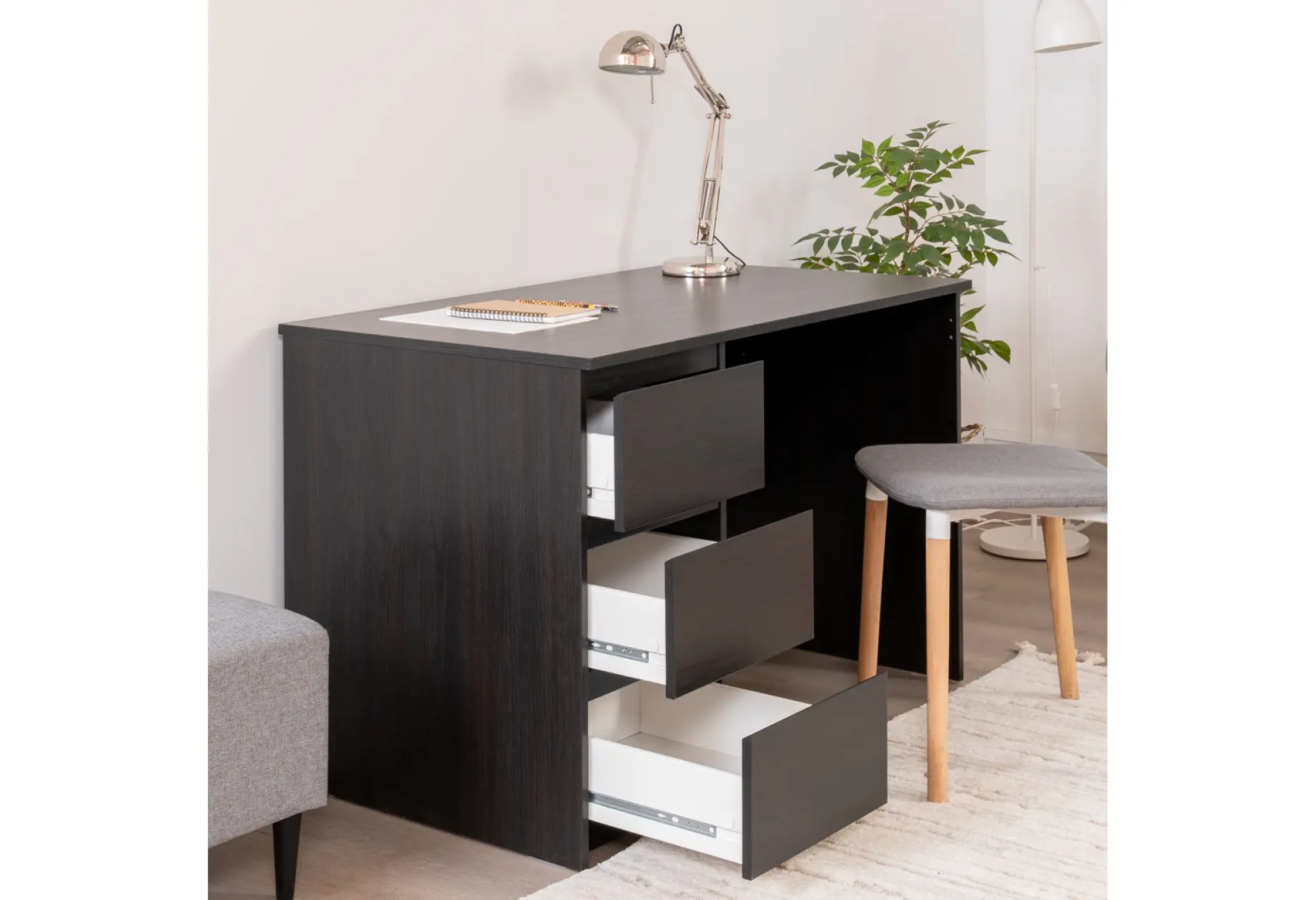 Тумба с тремя наружными выдвижными ящиками создает удобную систему хранения. Ящики подходят для бумаги, папок формата А4 и офисных принадлежностей, помогая поддерживать порядок на рабочей поверхности. Тумбу можно разместить как справа, так и слева под столешницей, что делает стол удобным как для правшей, так и для левшей и позволяет адаптировать его под особенности планировки помещения.