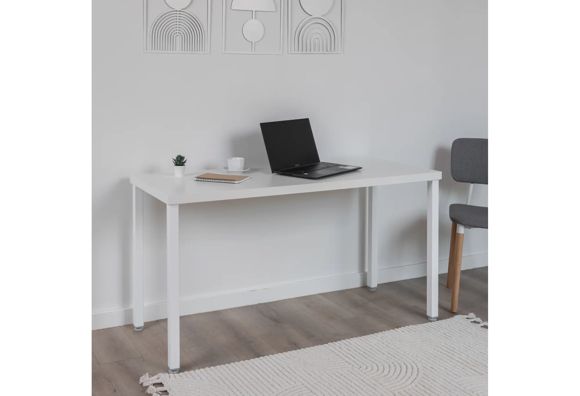 Металлические ножки окрашены в белый цвет, образуя с столешницей единый лаконичный силуэт. Регулируемые опоры ножек позволяют компенсировать неровности пола и обеспечить устойчивость стола без лишних усилий. Поверхности корпуса из ДСП декорированы бумагой и окрашены УФ-материалами, что делает их более устойчивыми к повседневным воздействиям и облегчает уход.