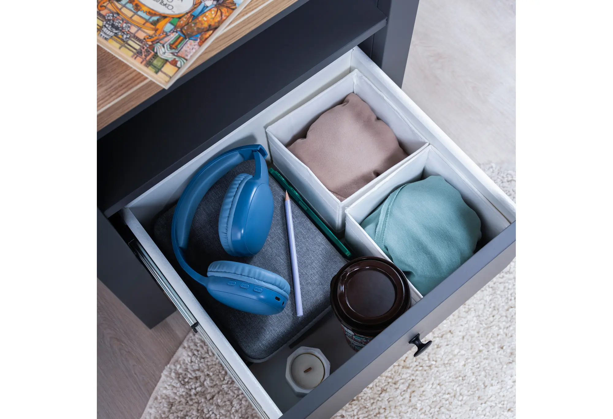 - Практичная комбинация открытой ниши и выдвижного ящика