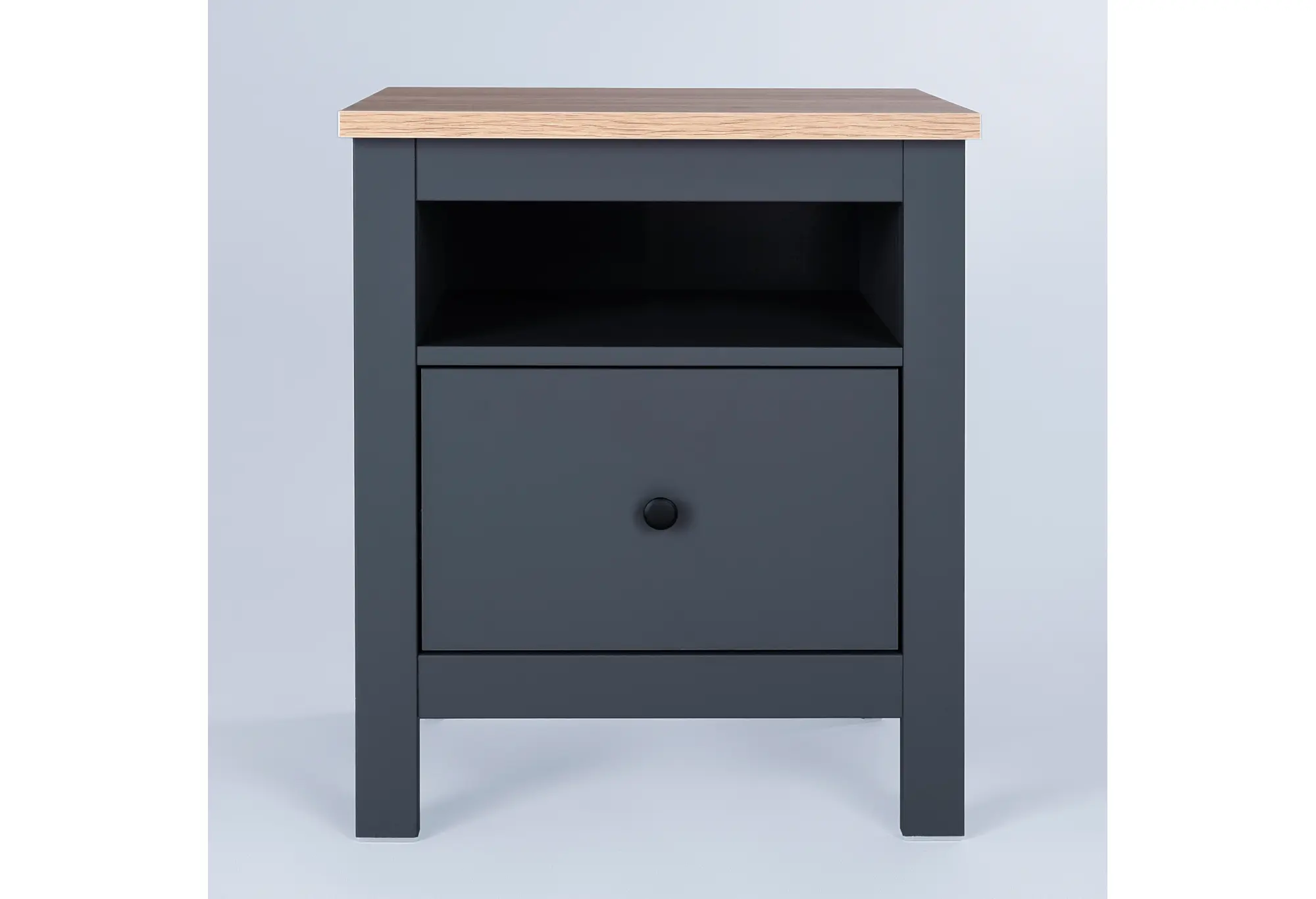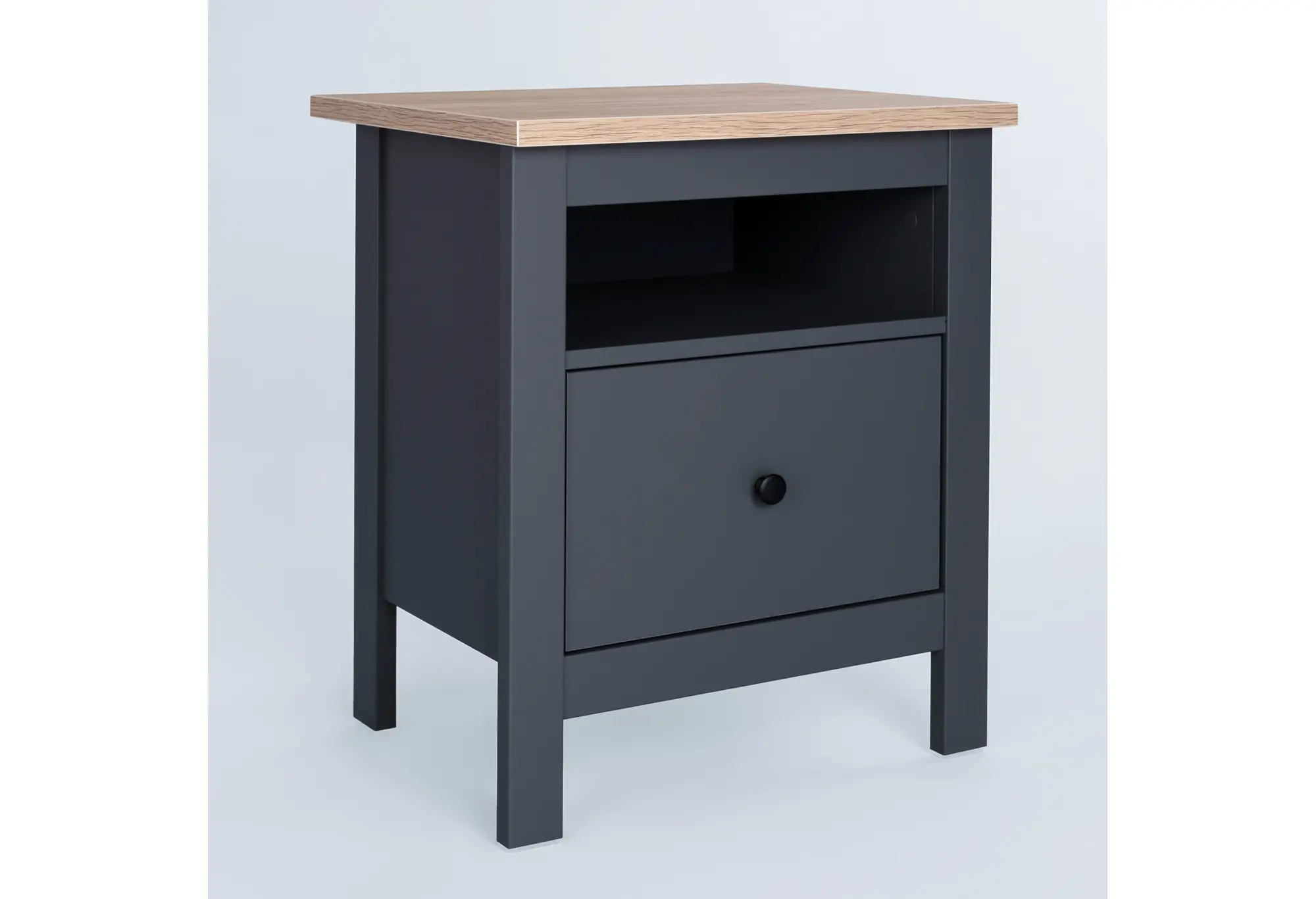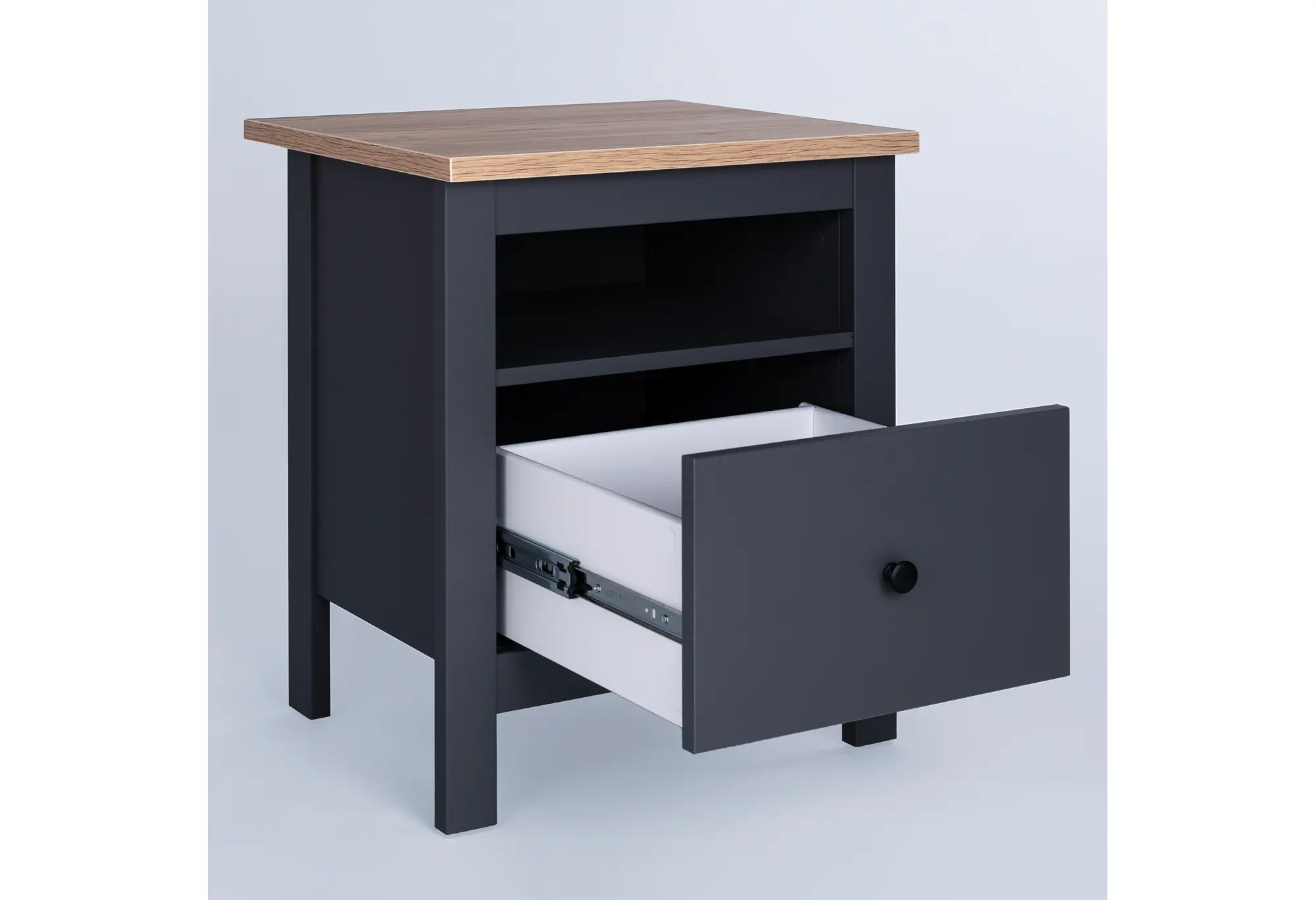 Конструкция тумбы включает открытую нишу под столешницей и выдвижной нижний ящик с аккуратной круглой ручкой. В нише удобно держать те предметы, к которым нужен быстрый доступ, а в ящике можно разместить вещи, которые требуется закрыть от посторонних глаз. Благодаря жёсткому каркасу из ДСП тумба стоит устойчиво и сохраняет форму со временем.