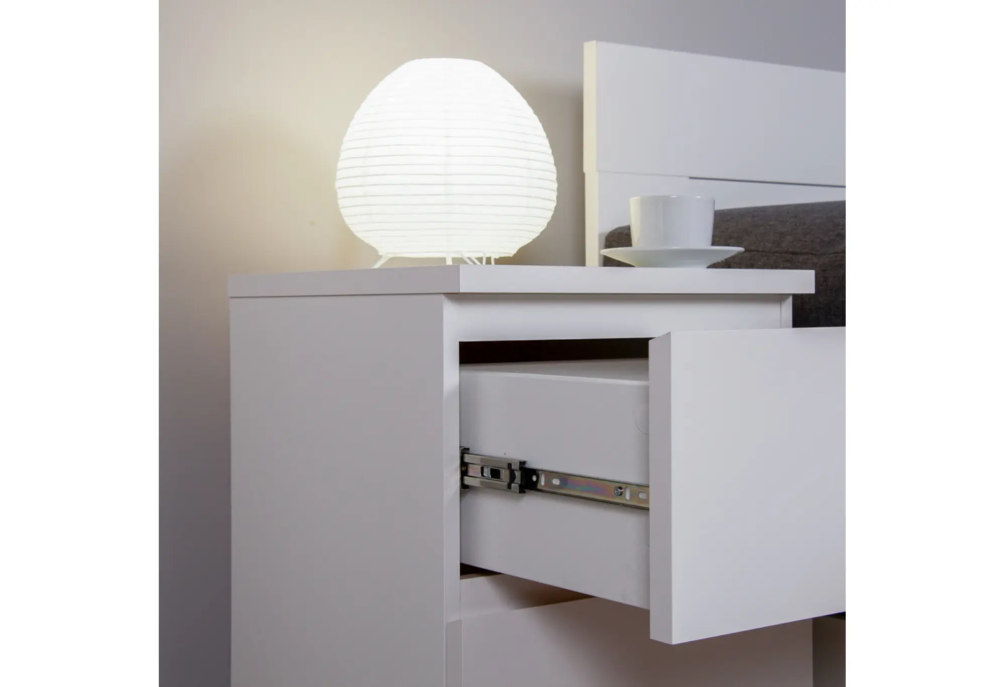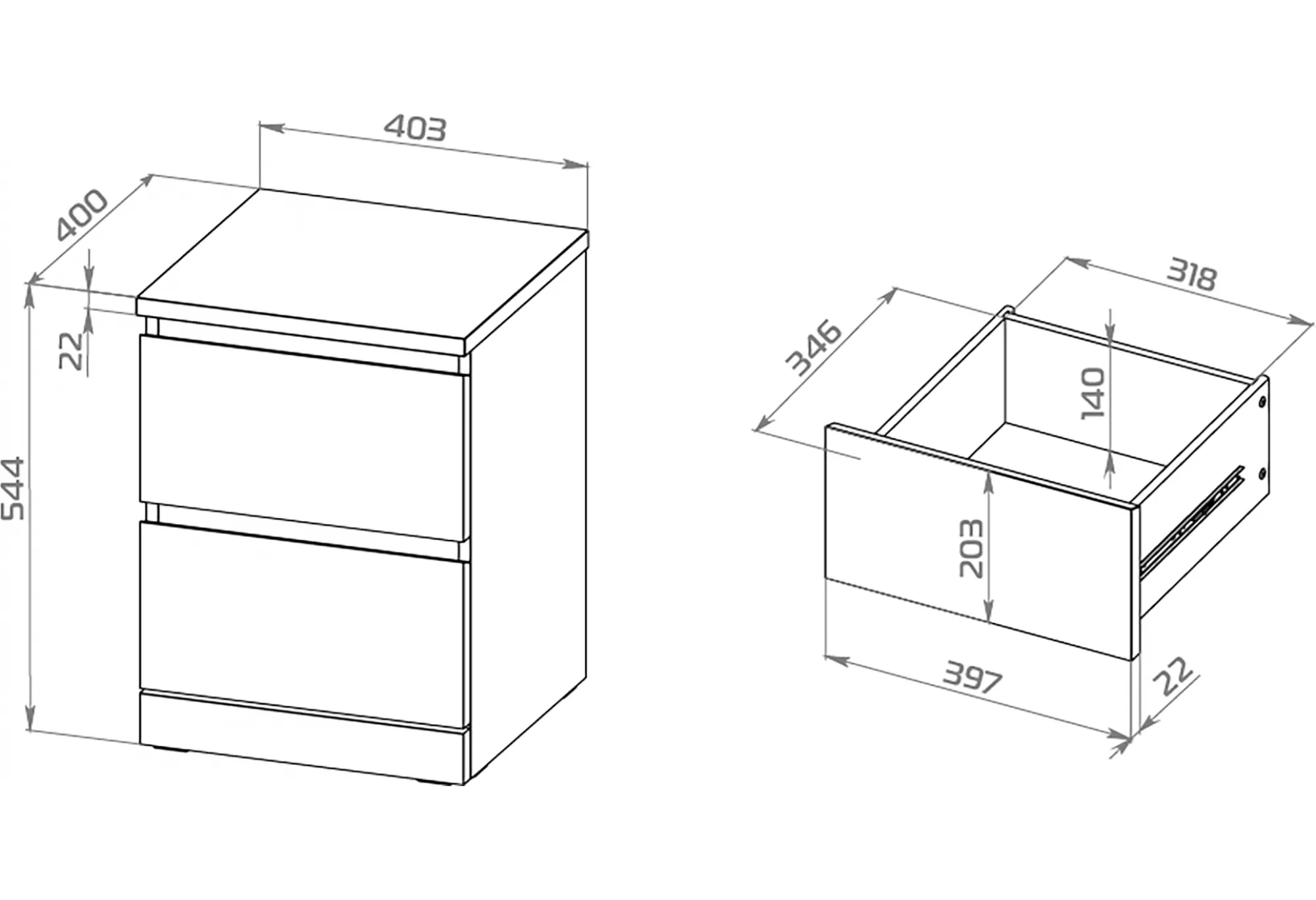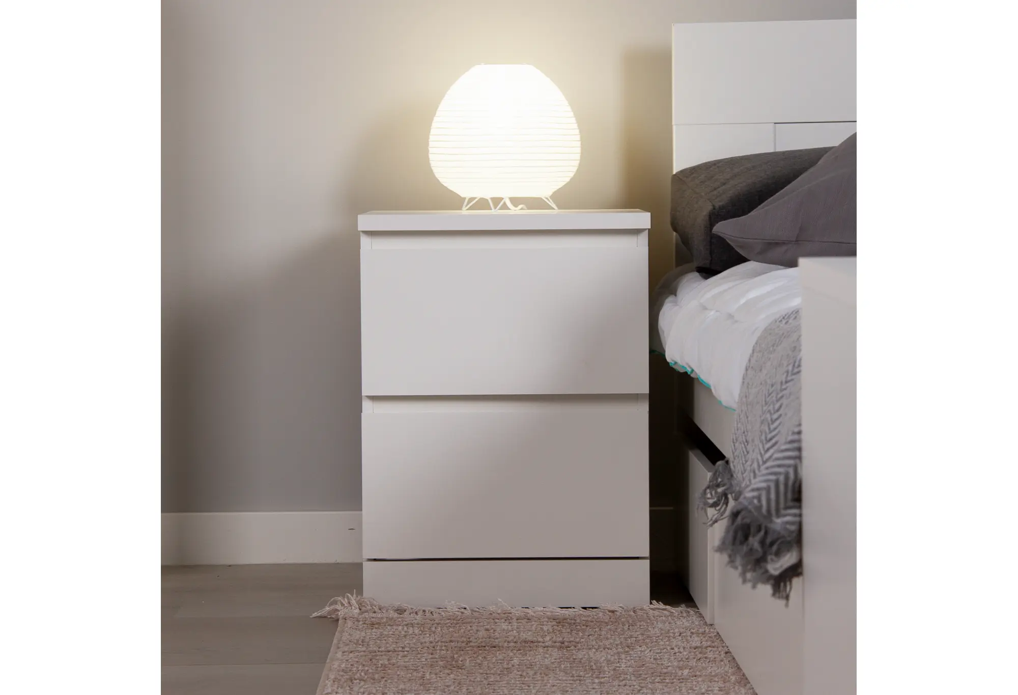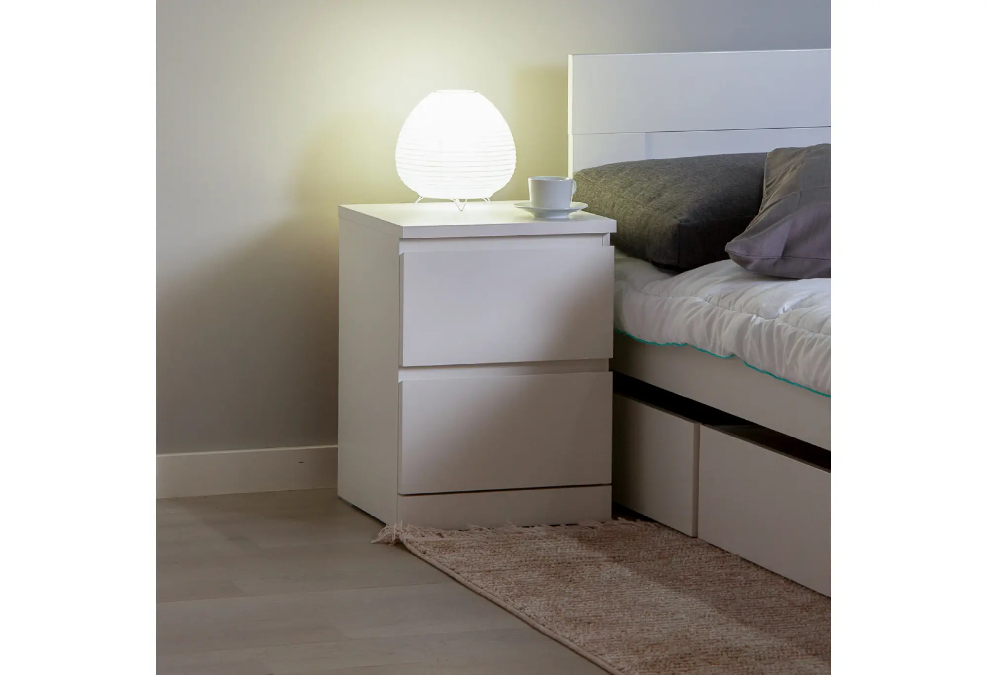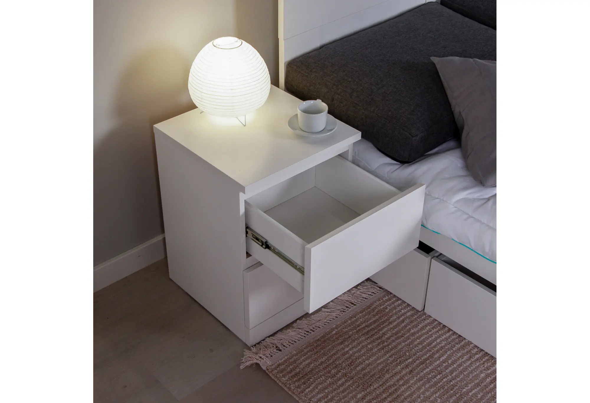 Два выдвижных ящика обеспечивают удобное хранение одежды, белья, документов или мелких бытовых вещей. Ящики оснащены качественными телескопическими направляющими, которые обеспечивают плавное и мягкое выдвижение по всей глубине, что облегчает доступ ко всему содержимому. Конструкция рассчитана на повседневное использование и помогает поддерживать порядок без лишних усилий.