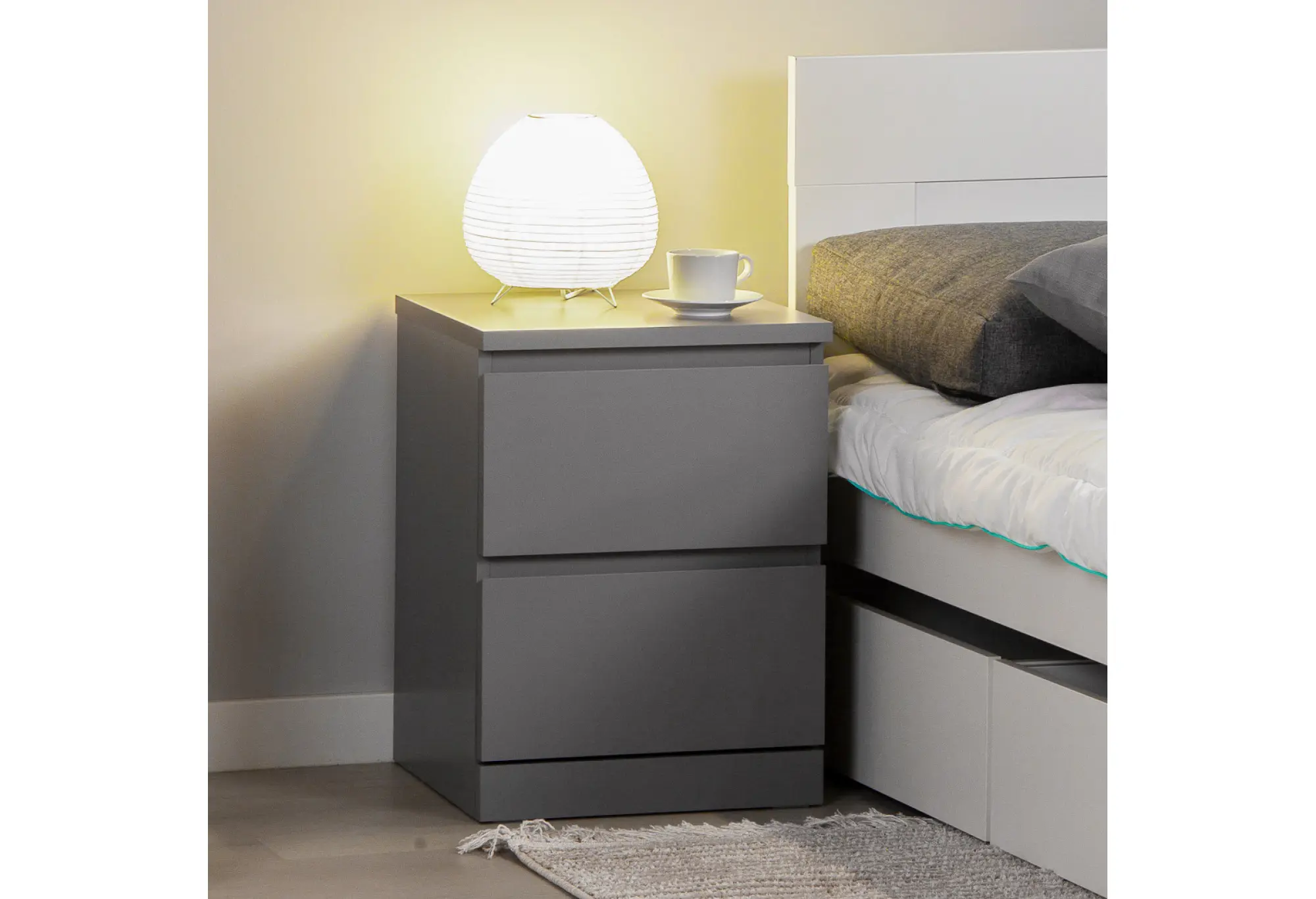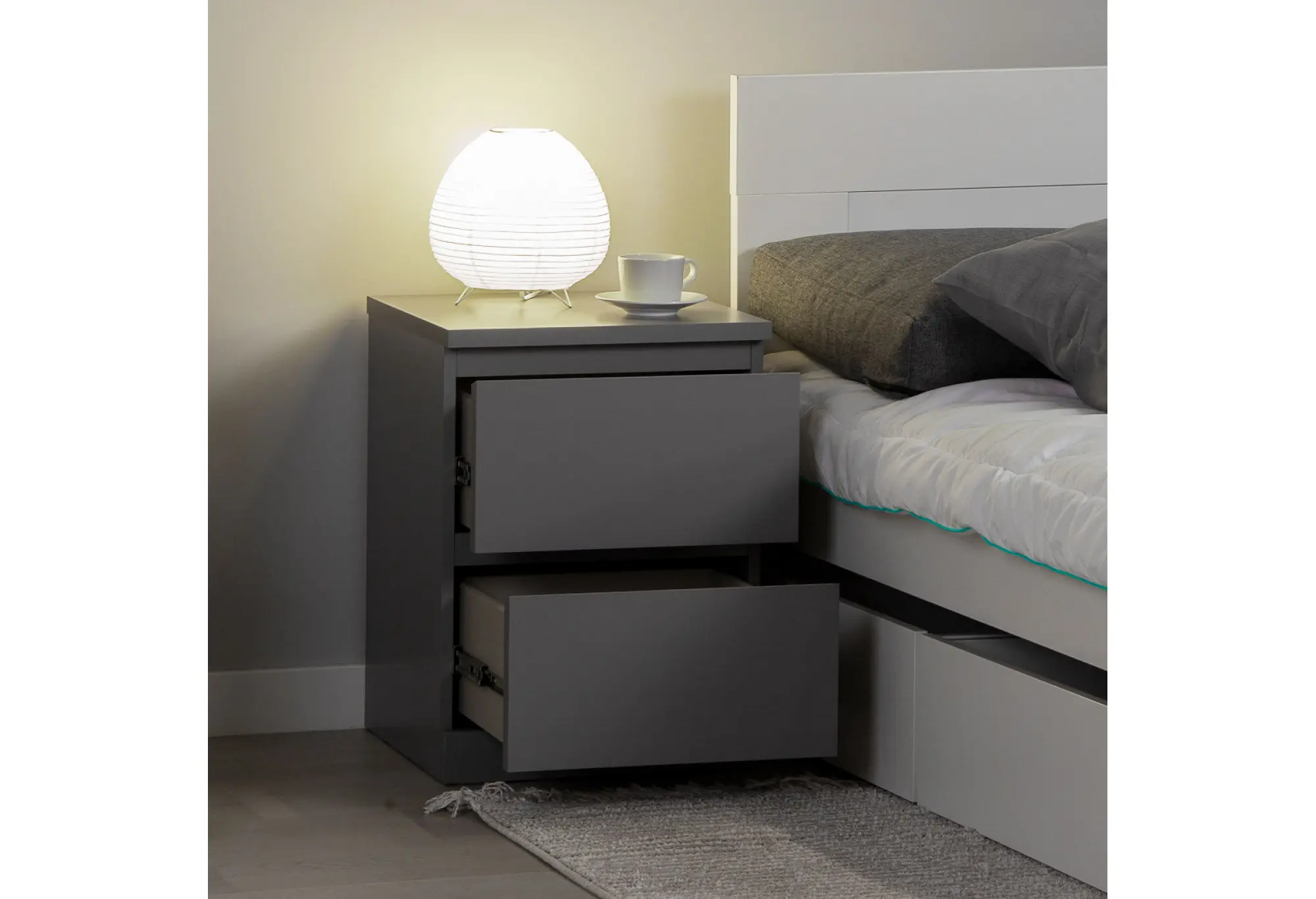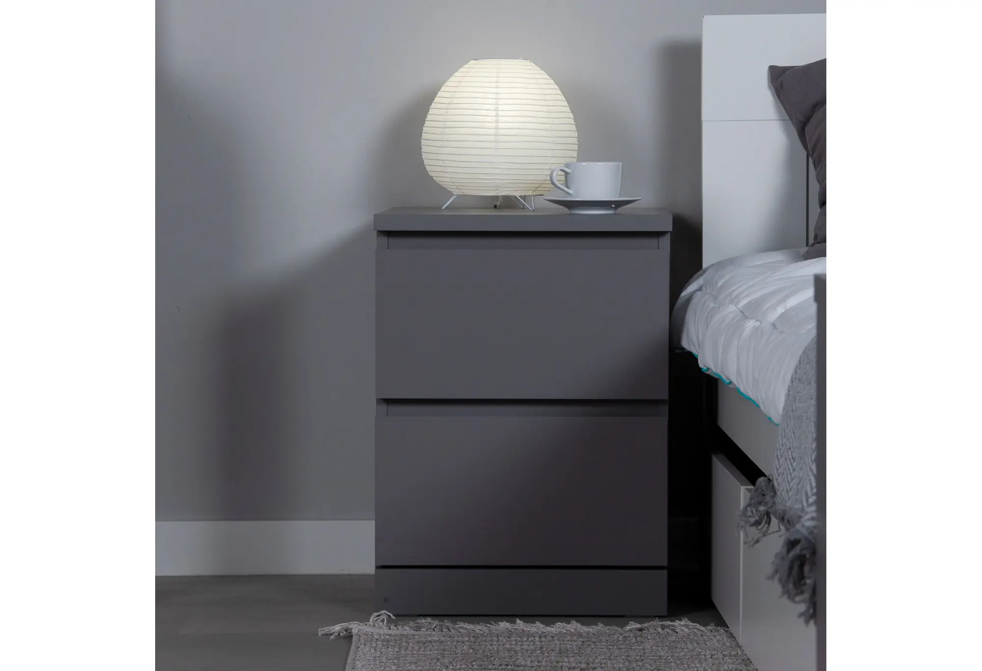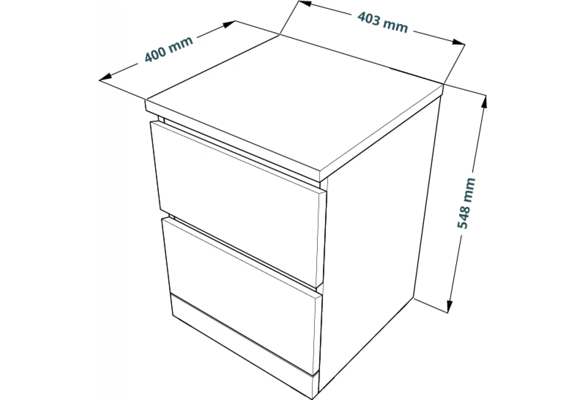 Корпус выполнен из ДСП, обеспечивающей устойчивость к повседневным нагрузкам и сохранение геометрии конструкции. Два выдвижных ящика обеспечивают удобную организацию хранения - внутри удобно разместить документы, белье, аксессуары или мелкие предметы, которые важно держать под рукой.