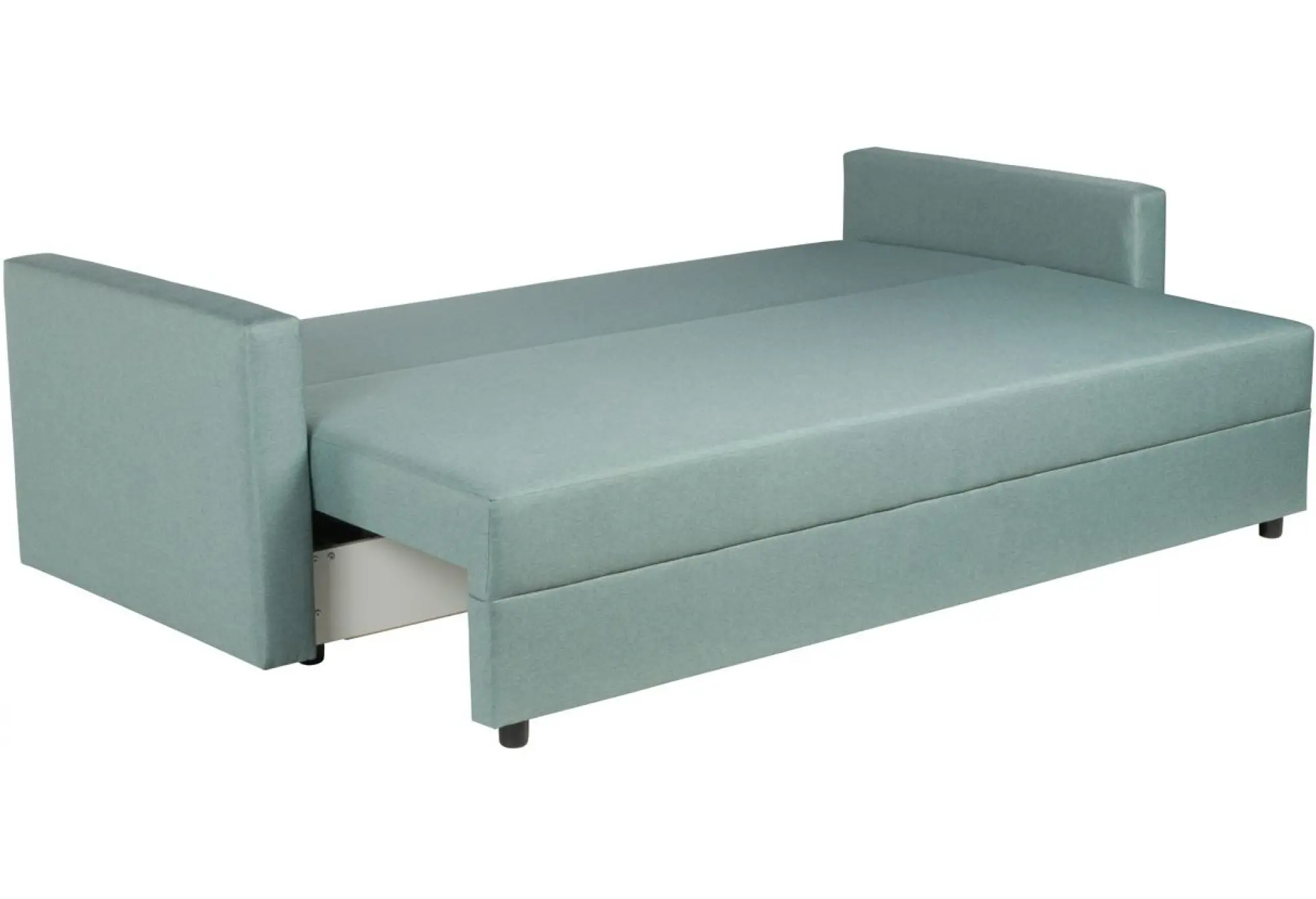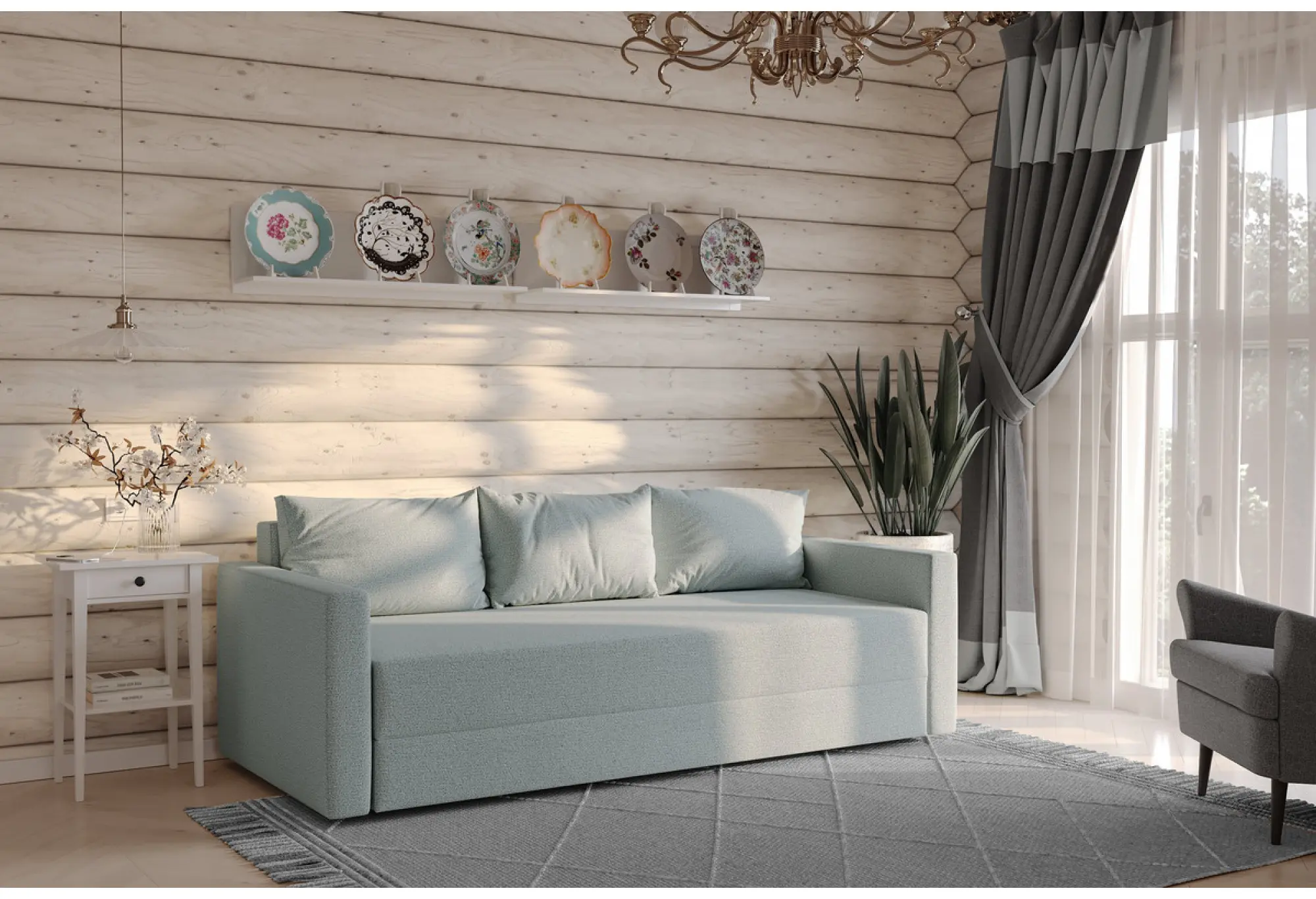 Мятно-серый диван-кровать в скандинавском стиле станет лаконичным акцентом современной гостиной или спальни. Прямые линии корпуса, узкие подлокотники и три объемные подушки создают сдержанный и аккуратный внешний вид, который легко сочетается как со светлой, так и с более насыщенной отделкой стен и текстиля.