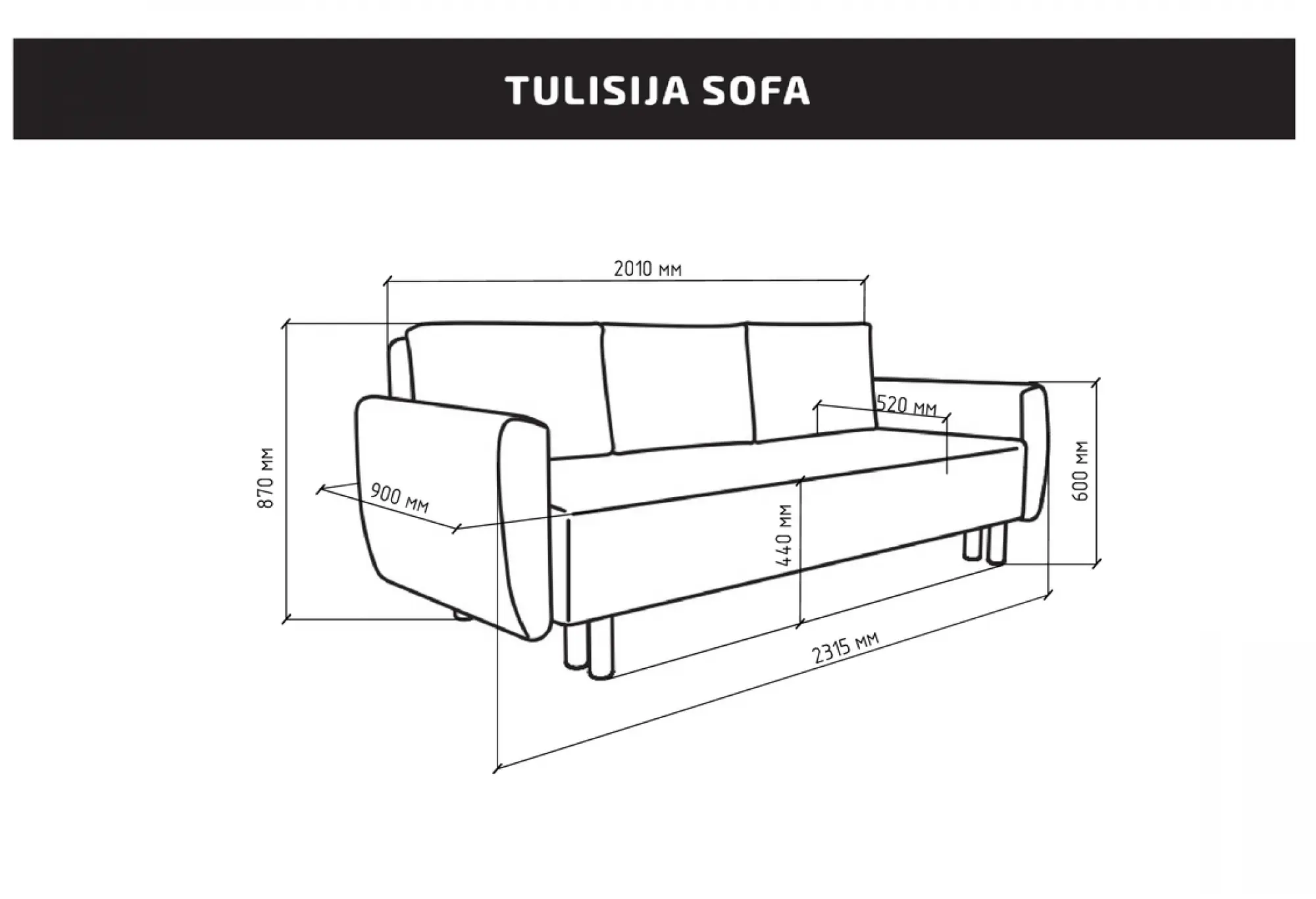 Габаритные размеры дивана 2315x900x780 мм обеспечивают полноценное трёхместное посадочное место. При раскладывании образуется спальное пространство 1400x2000 мм, подходящее для регулярного сна одного-двоих человек. Механизм трансформации «Тик-Так» позволяет разложить диван в плоскость без перекатывания по полу, что особенно удобно при использовании на напольных покрытиях, чувствительных к нагрузкам и трению.