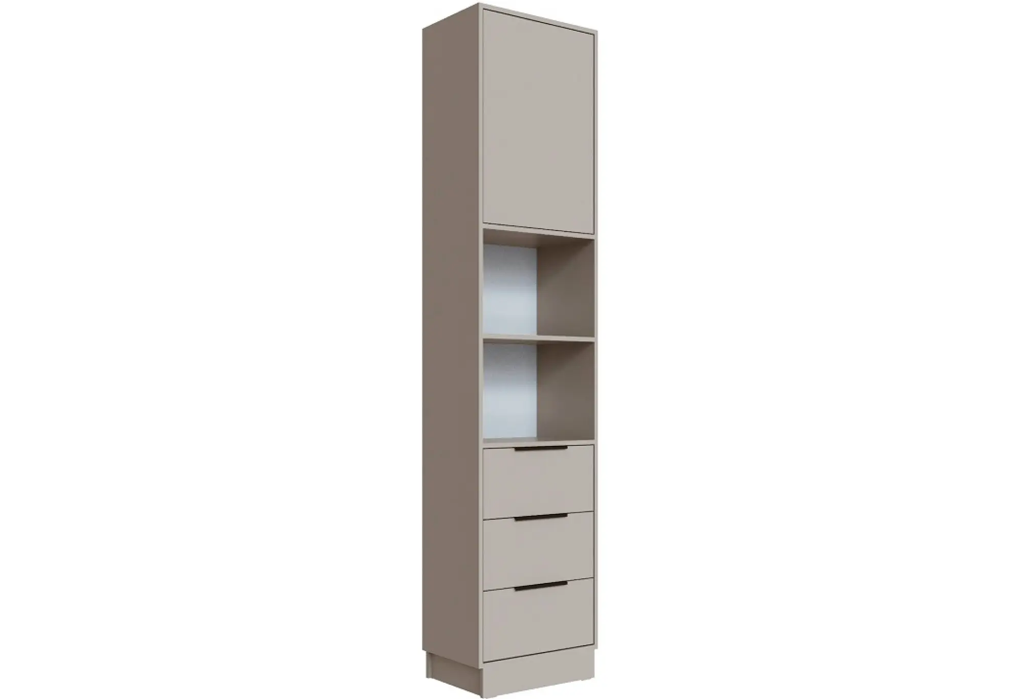 Три нижних выдвижных ящика оснащены полновыкатными направляющими, благодаря которым удобно пользоваться всем внутренним пространством — содержимое хорошо просматривается и легко доступно. Верхняя закрытая часть на петлях BRILON без доводчиков подойдёт для тех вещей, которые вы хотите убрать из поля зрения. Открытые полки в средней зоне позволяют разместить предметы, к которым нужен быстрый доступ, или использовать их под декоративные элементы.
