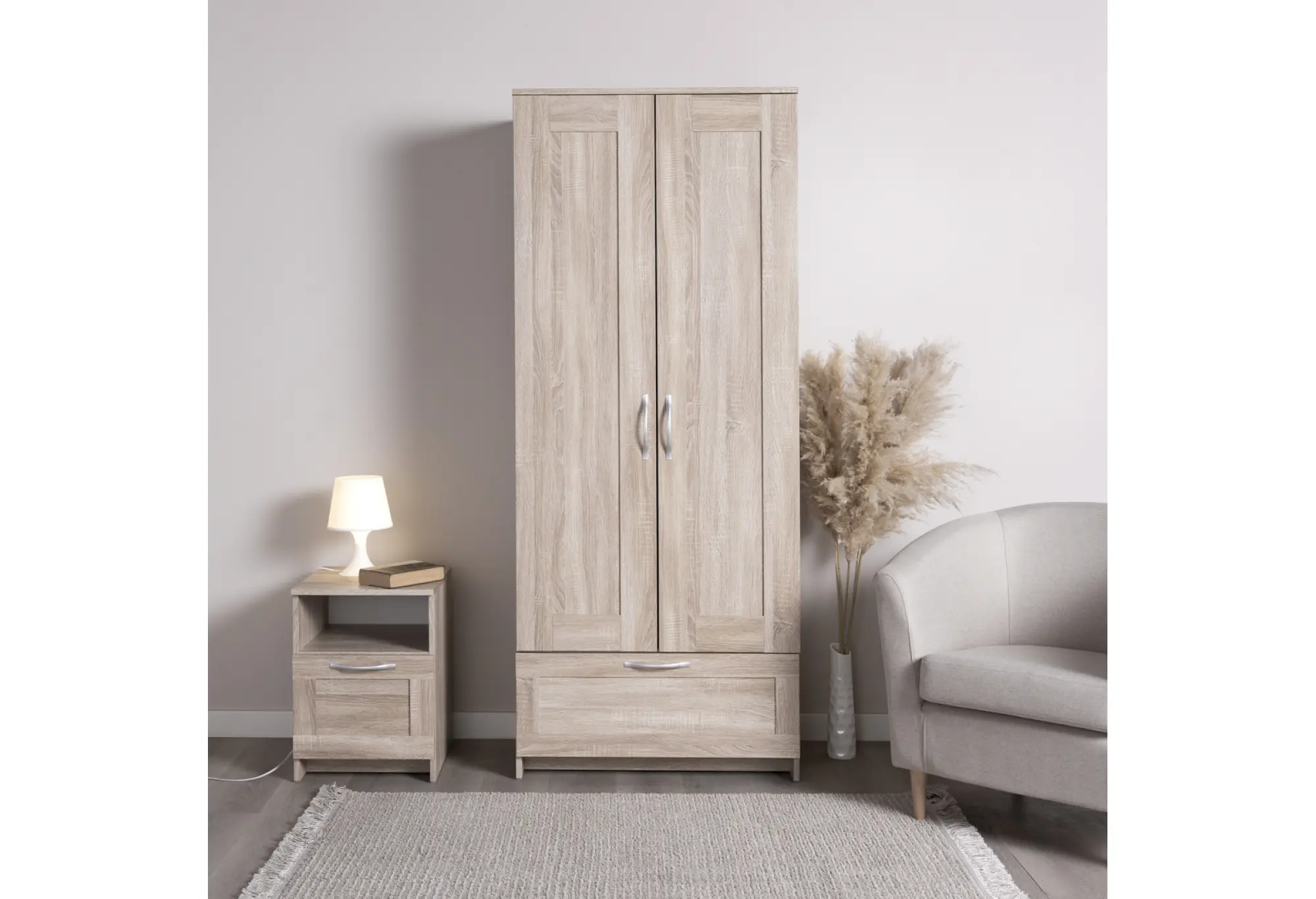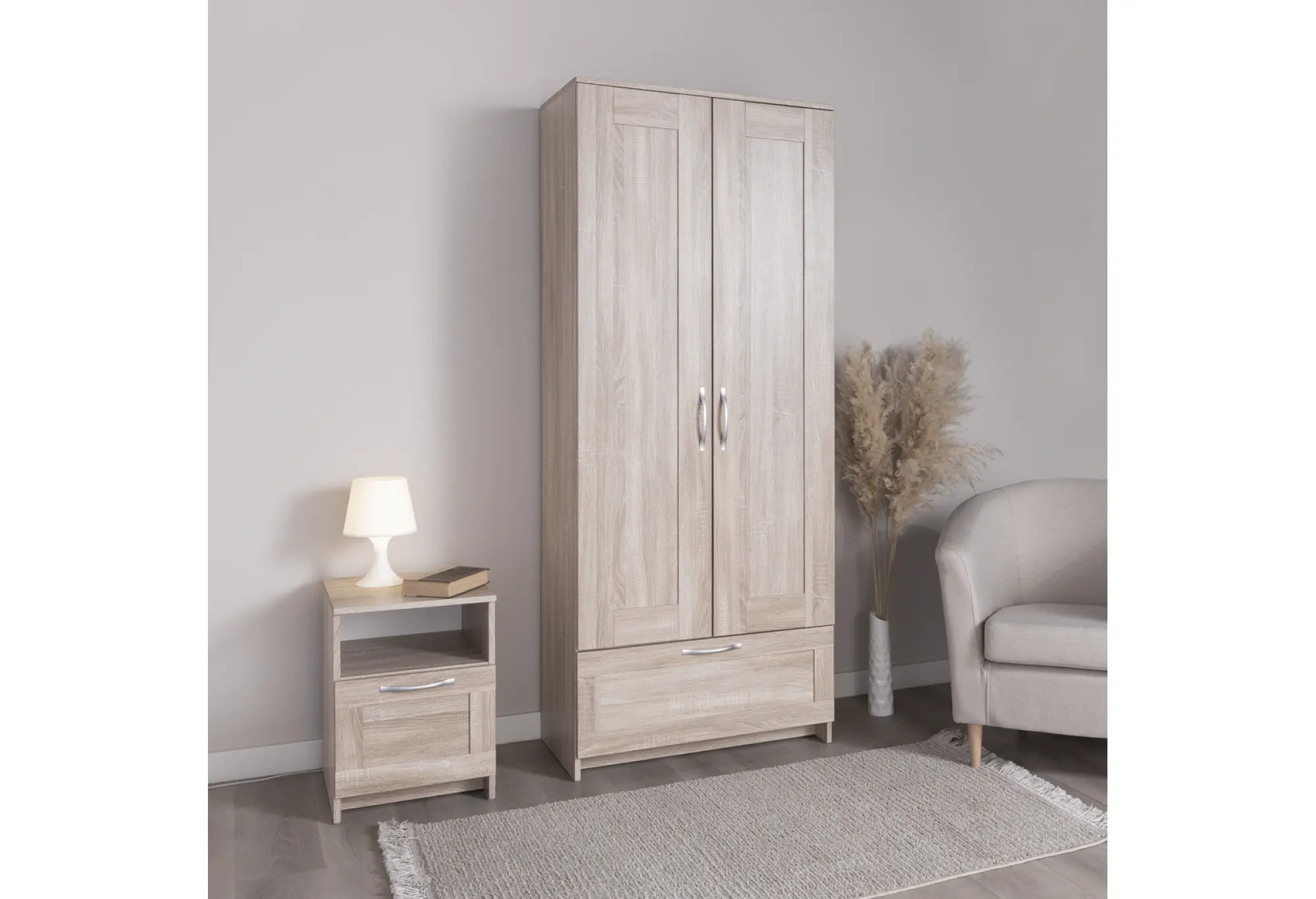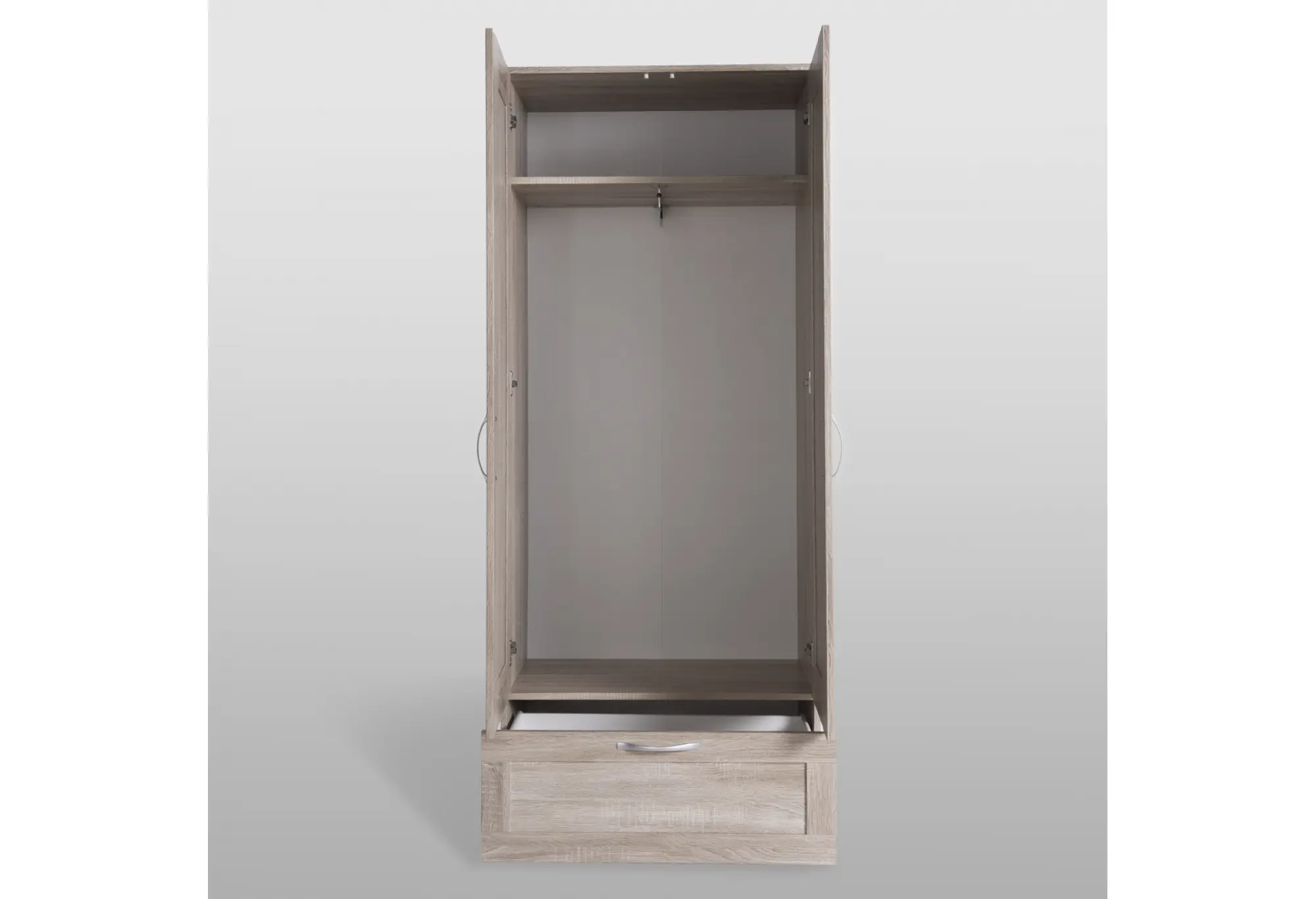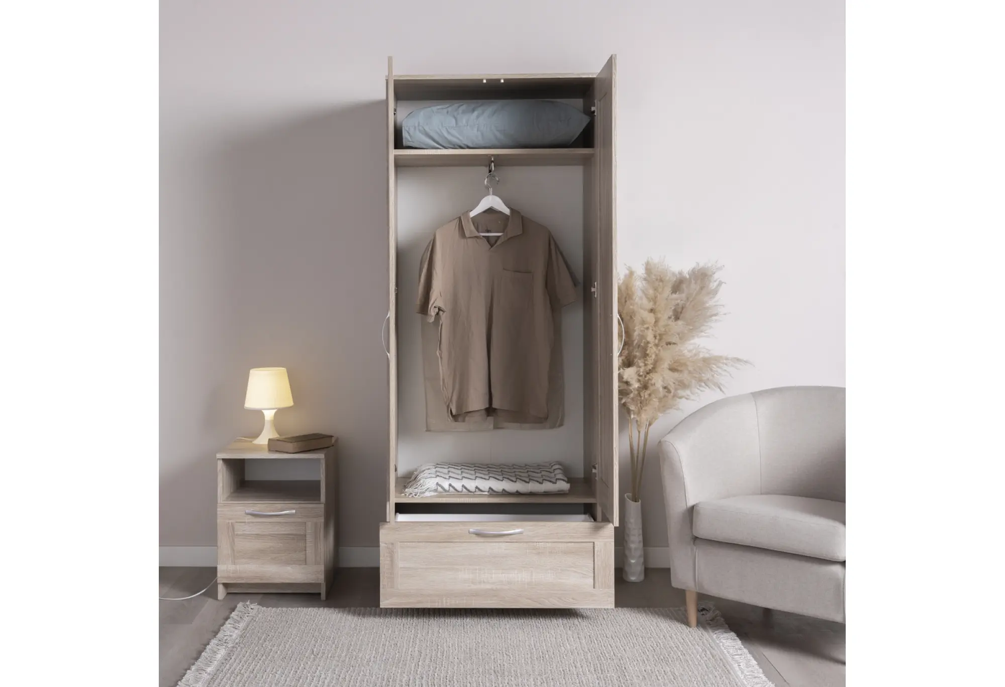 Верхнее отделение за распашными дверцами подходит для размещения одежды на плечиках и аккуратной организации повседневных вещей. Внизу предусмотрен выдвижной ящик для мелких предметов гардероба, аксессуаров или текстиля. Конструкция предусматривает крепление к стене, что повышает устойчивость и делает использование более безопасным, особенно в семьях с детьми.
