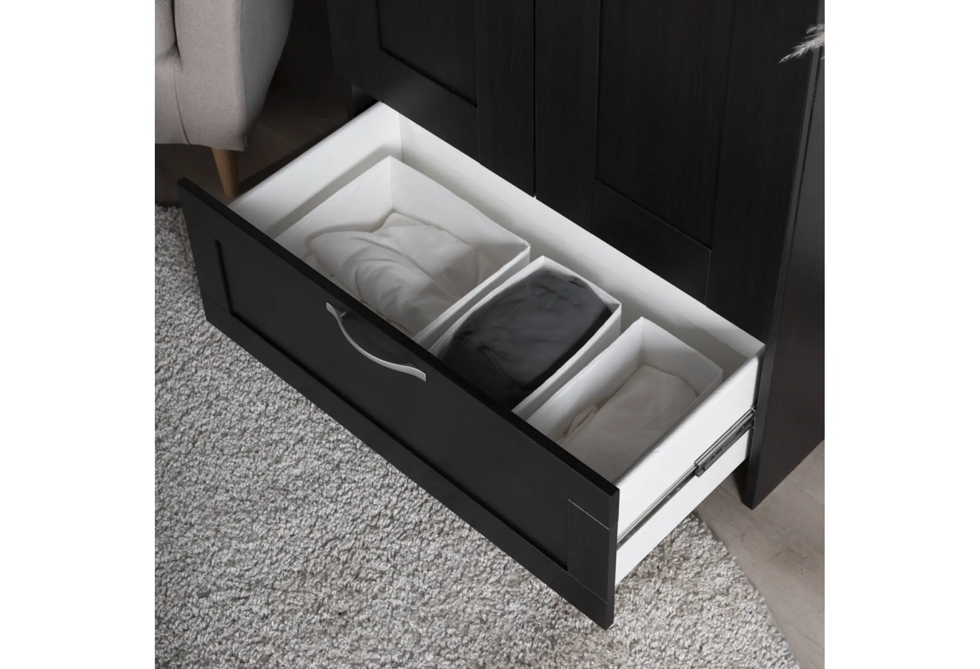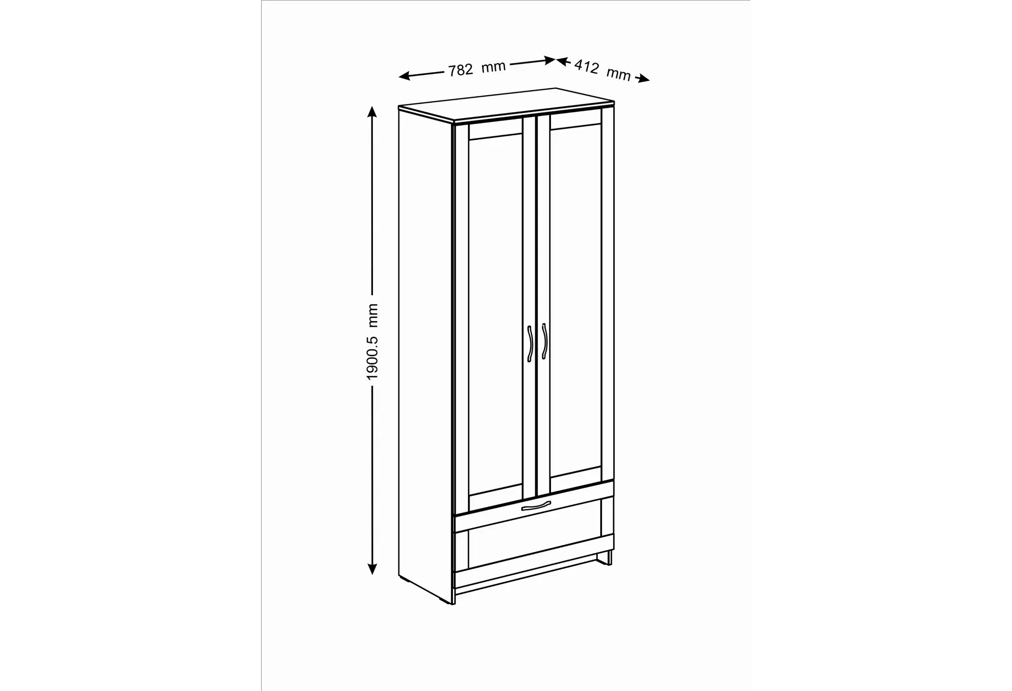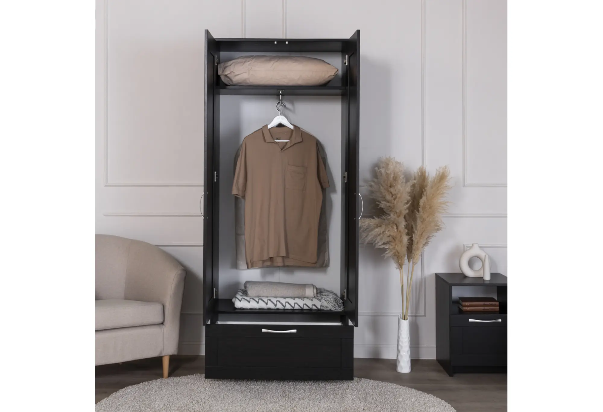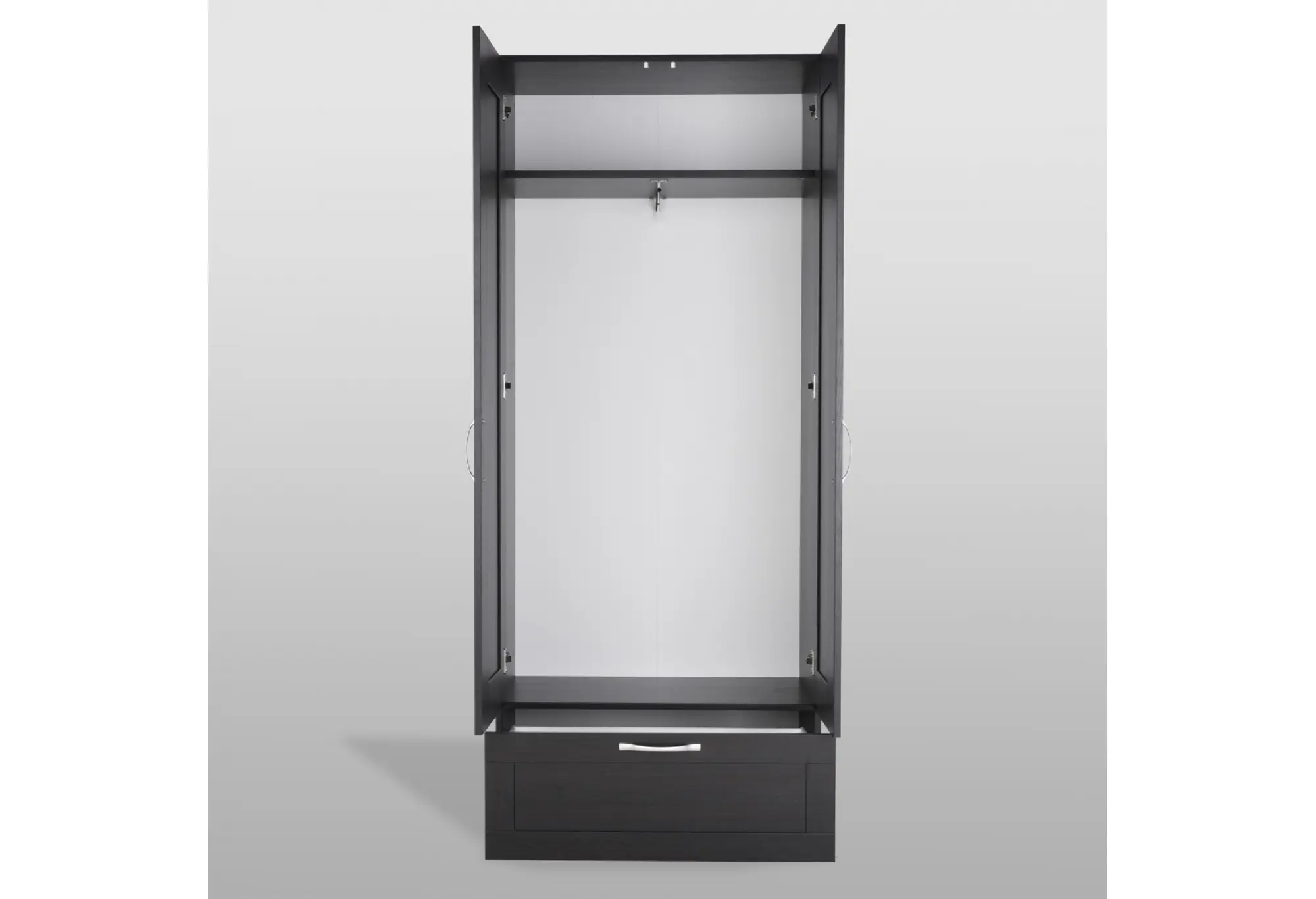 Внутреннее пространство организовано для удобного размещения повседневных и верхних вещей - за дверцами расположена штанга для вешалок-плечиков и отделение для длинной одежды. Внизу предусмотрен выдвижной ящик для аксессуаров, обуви или текстиля — все необходимое можно держать под рукой, не загромождая полки.