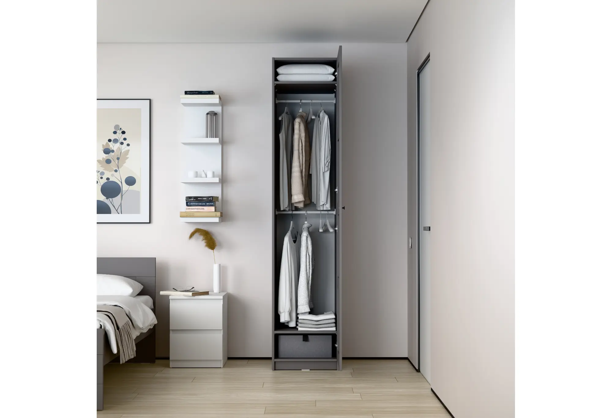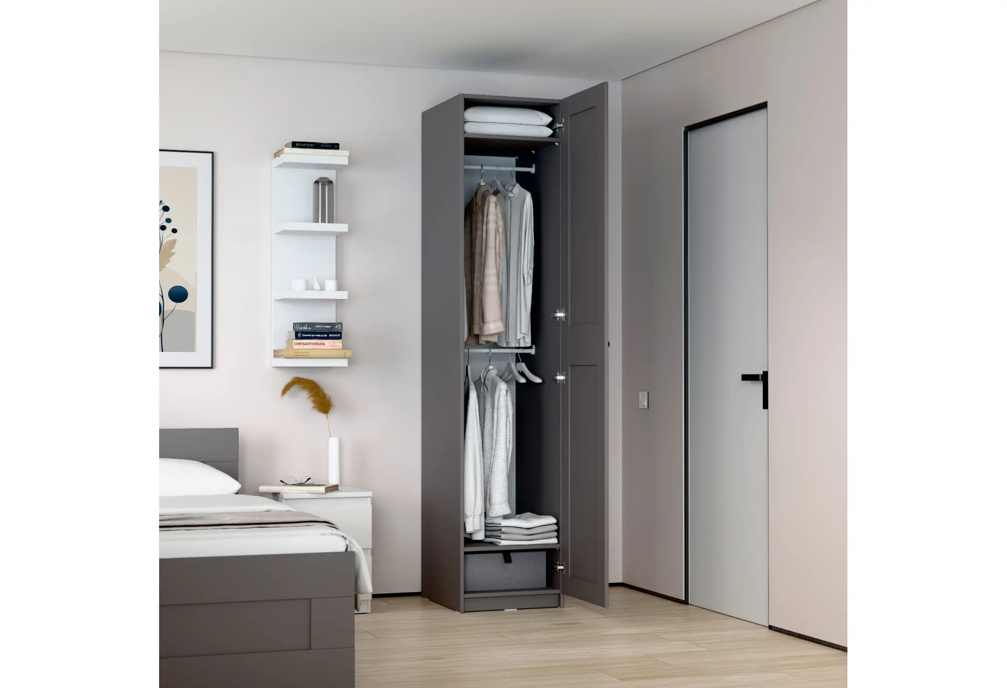 Корпус шкафа выполнен из кашированного ДСП толщиной 18 мм, что обеспечивает необходимую жесткость конструкции и устойчивость к повседневной эксплуатации. Внутри предусмотрены две полки и штанга для вешалок, что позволяет удобно разместить как одежду на плечиках, так и сложенные вещи, аксессуары или коробки для хранения. Такое деление внутреннего пространства делает шкаф функциональным при минимальных габаритах.