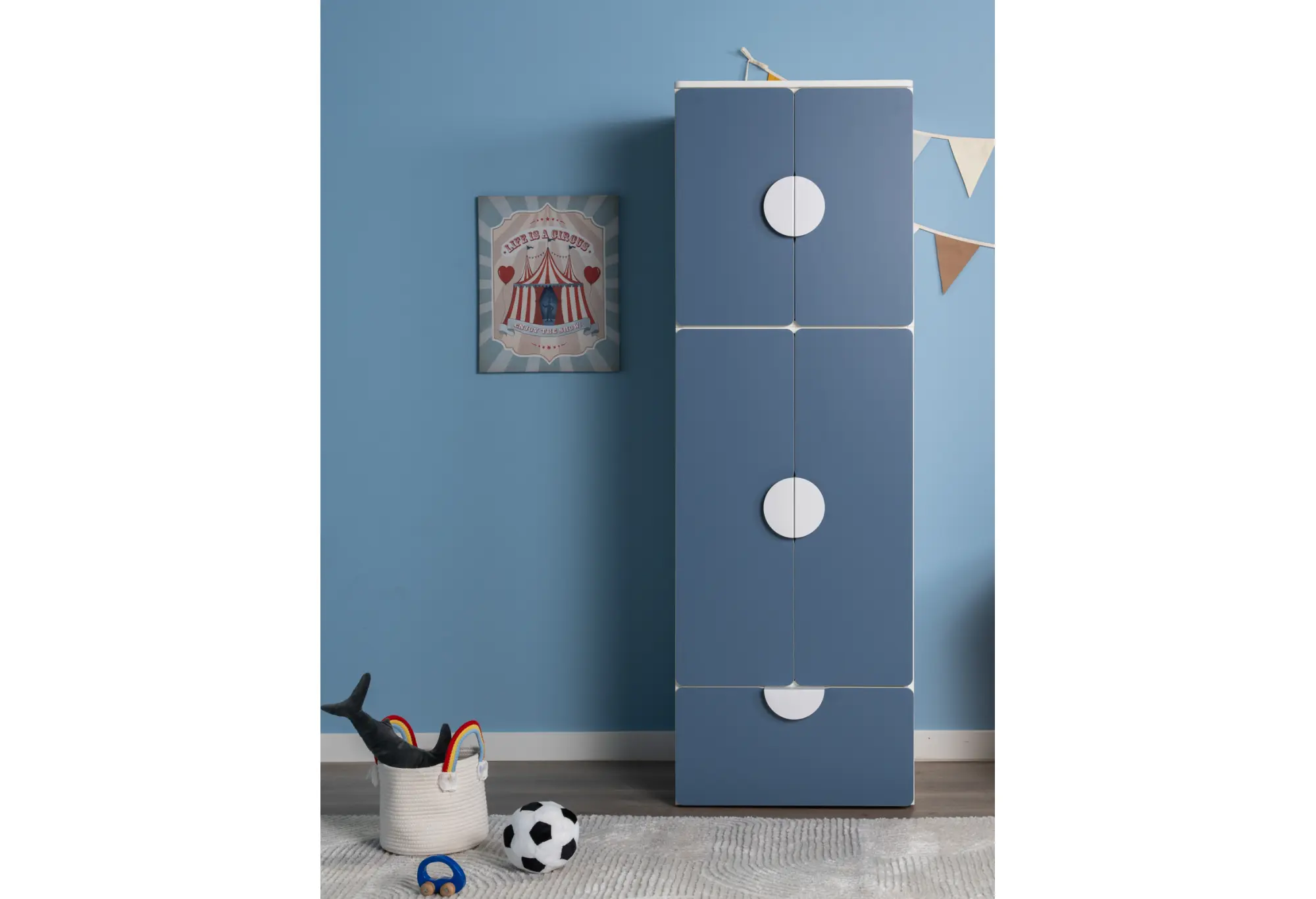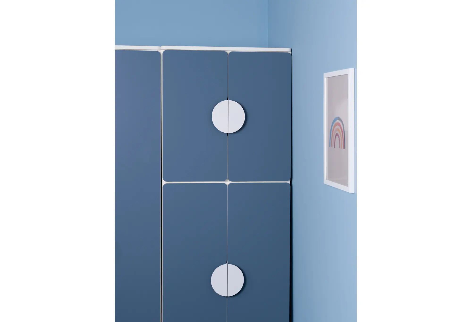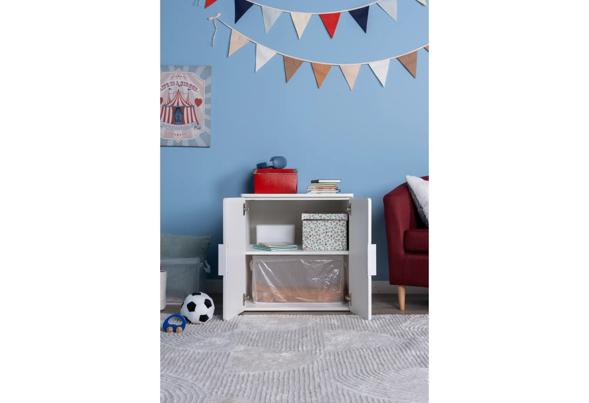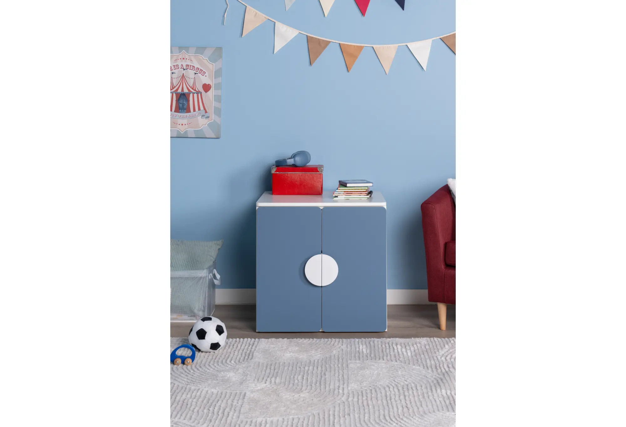 Две распашные дверцы открывают доступ к внутреннему пространству, которое удобно использовать для игрушек, книг, белья или канцелярии. Круглая центральная ручка делает открывание дверей простым и безопасным для ребёнка, а также придаёт шкафу законченный, продуманный вид.