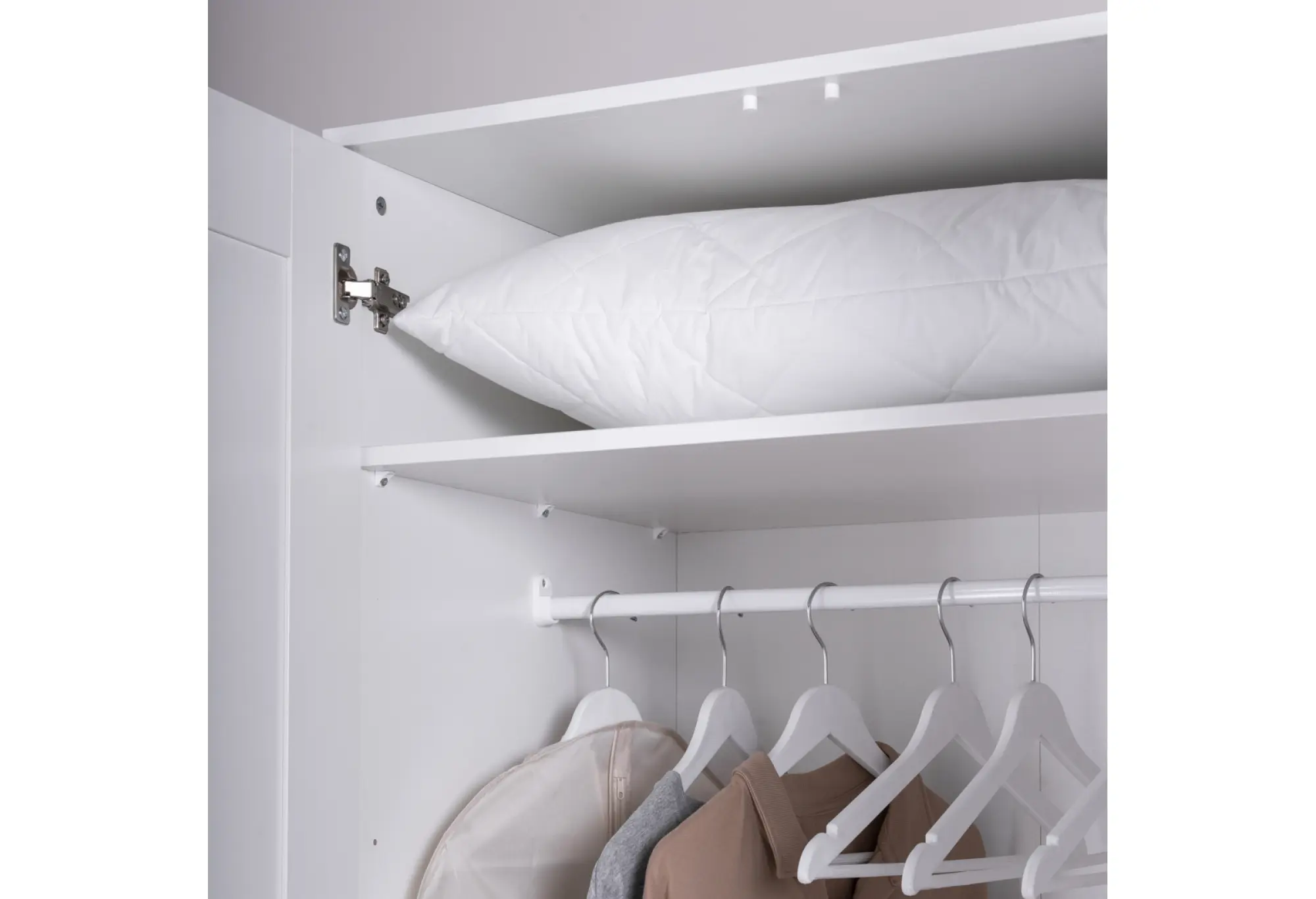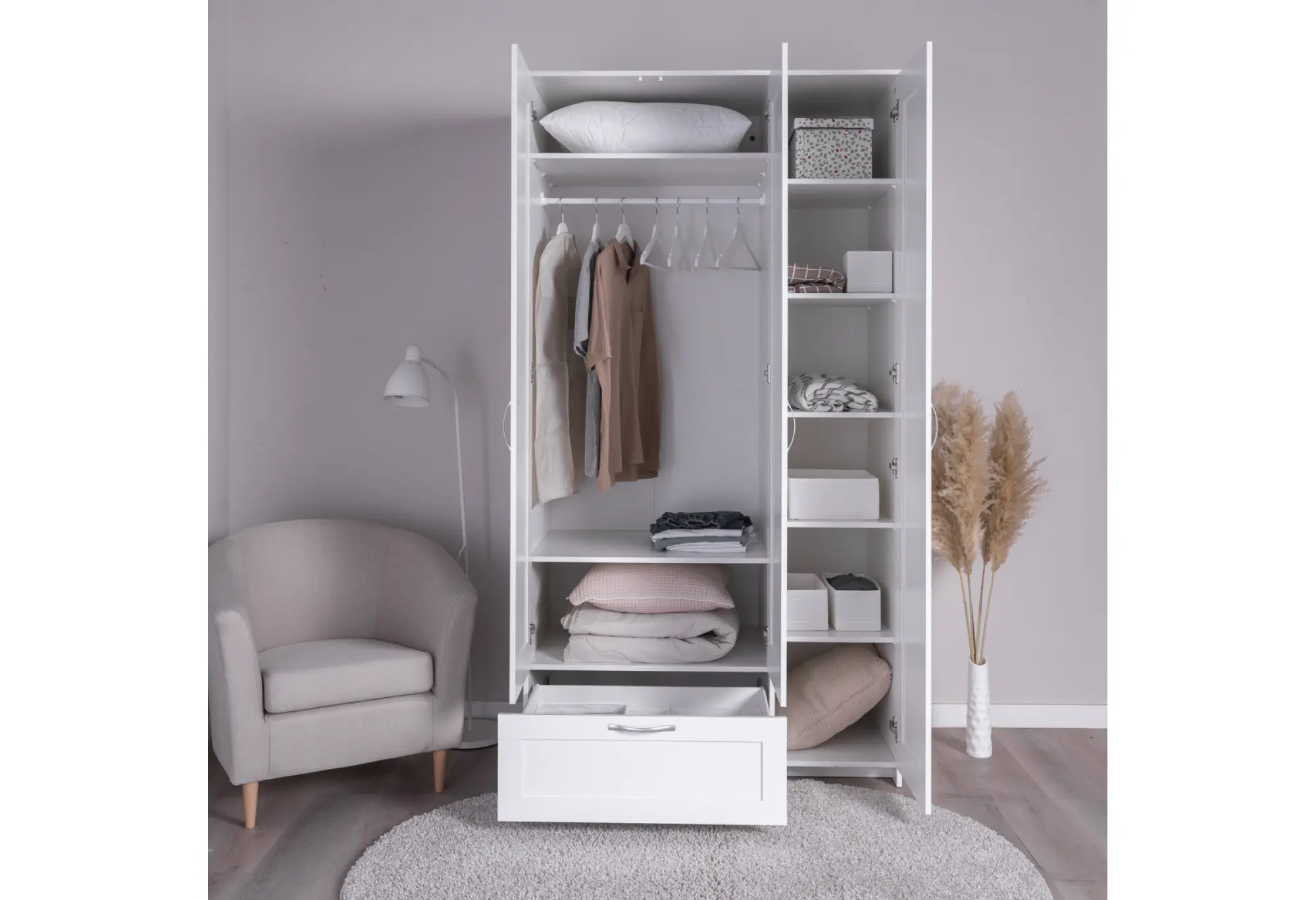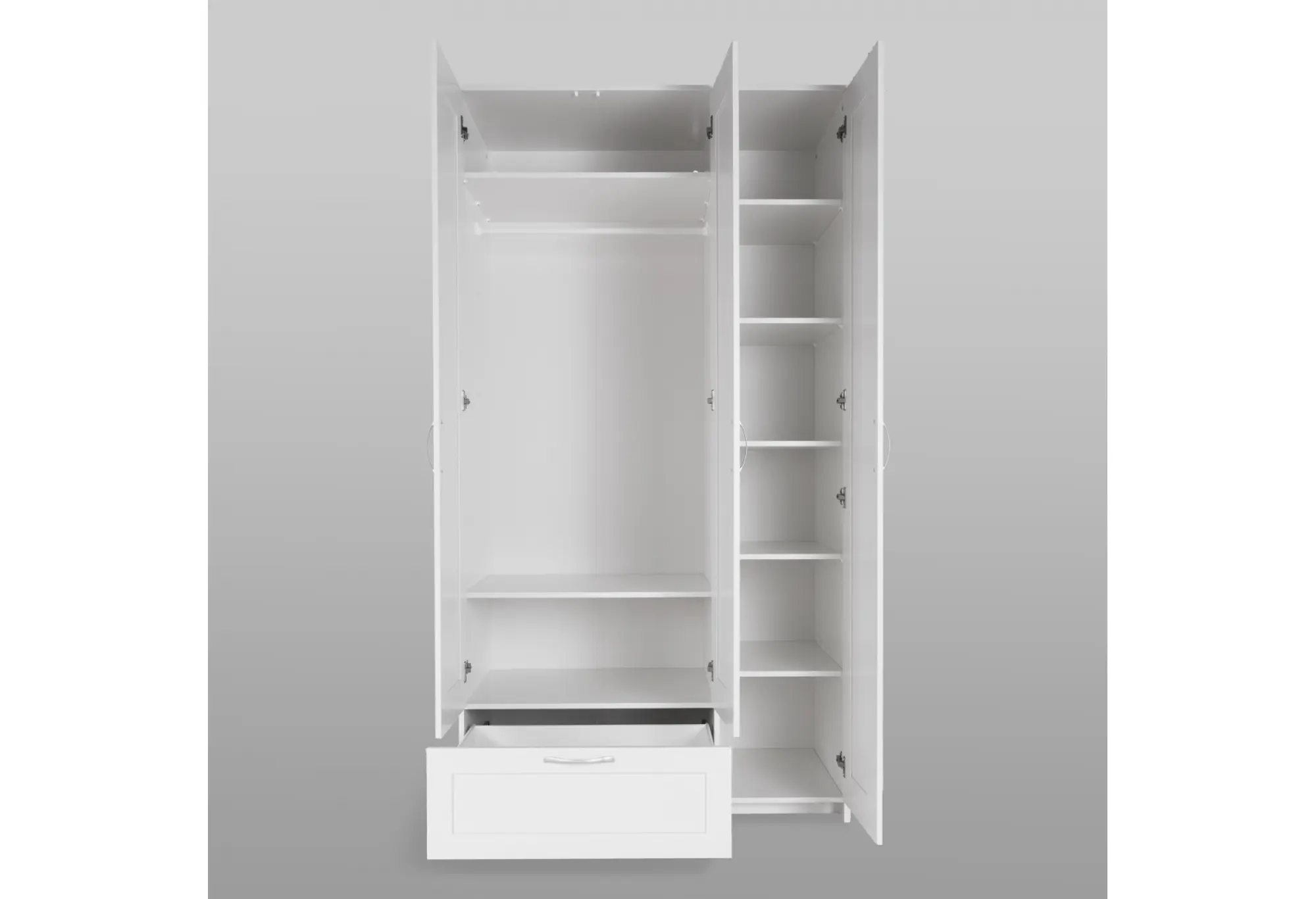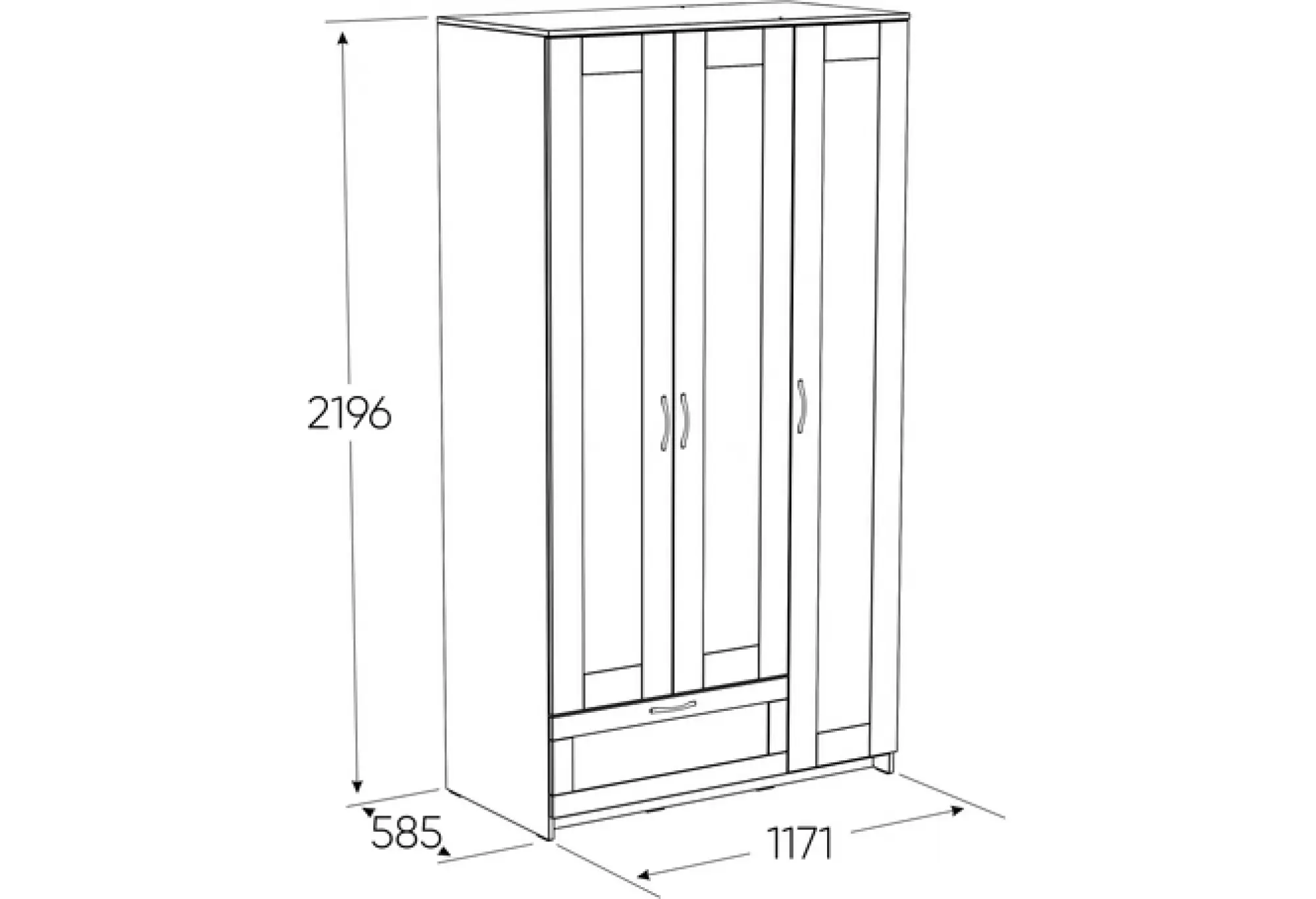 Шкаф СИРИУС комбинированный для одежды трехдверный, с выдвижным ящиком и одним зеркалом, 1171х585х2196, цвет Белый. Изготовлен из кашированного ДСП толщиной 16 мм. Крепится к стене. Гарантийный срок для жилых помещений 24 месяца, для общественных помещений - 18 месяцев.