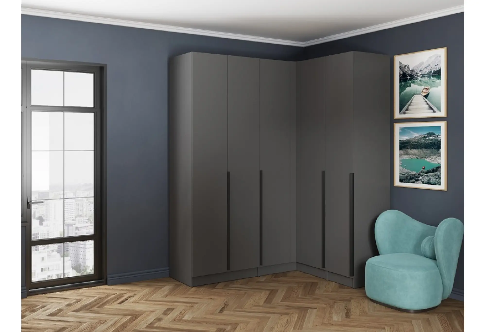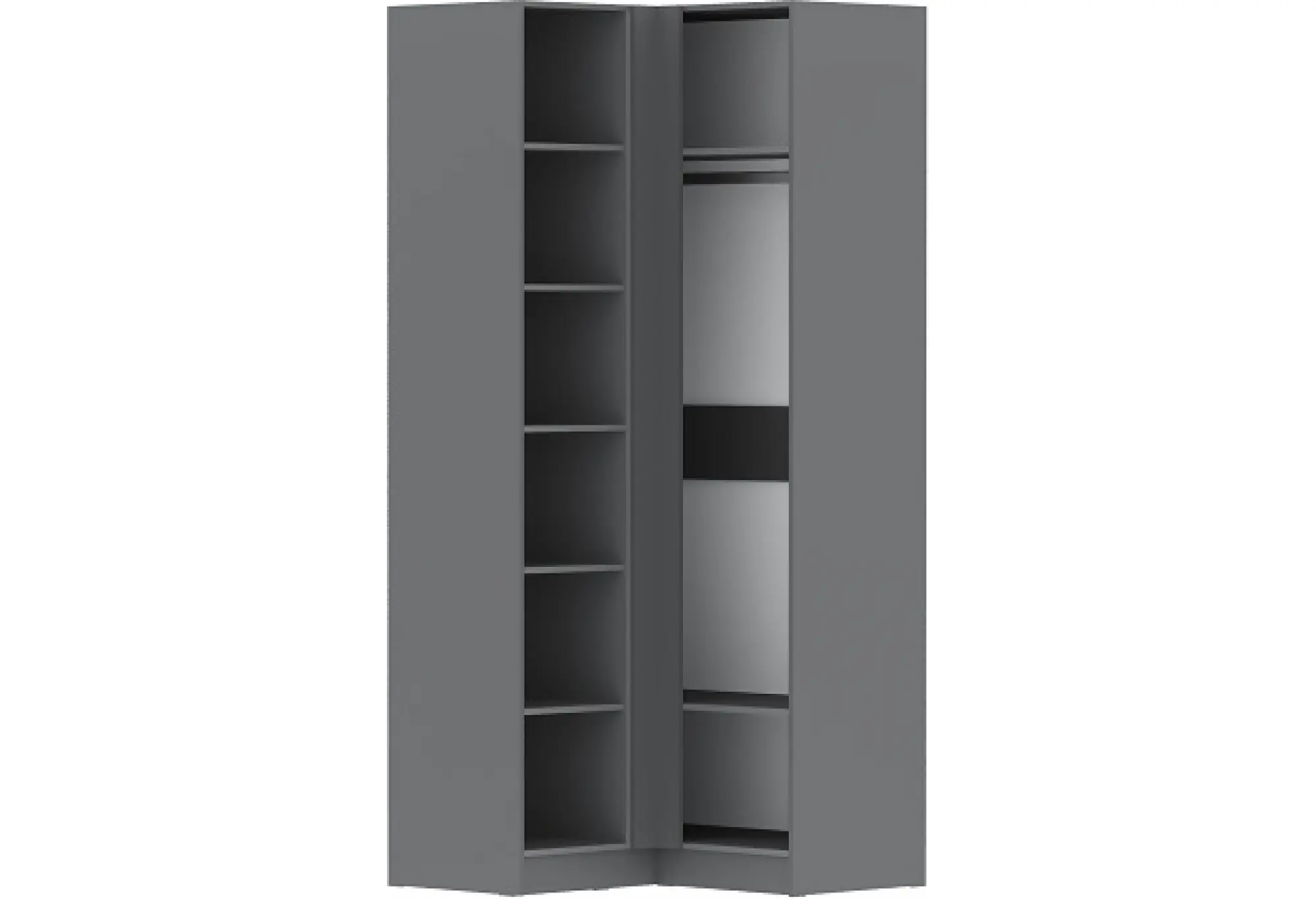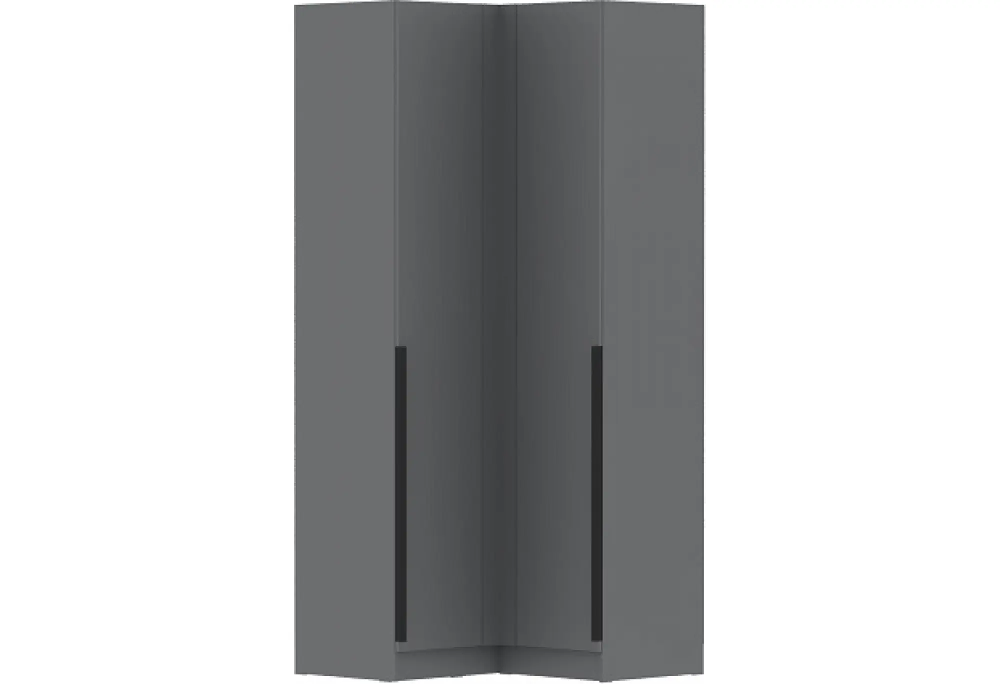 Угловой шкаф «Мадрид» в цвете серый графит — практичное решение для рационального использования пространства. Прямой угол позволяет установить шкаф в стык двух стен, задействуя угол комнаты без потери полезной площади. Габариты 1000x1000x2300 мм обеспечивают вместительное внутреннее пространство при компактном внешнем размере.