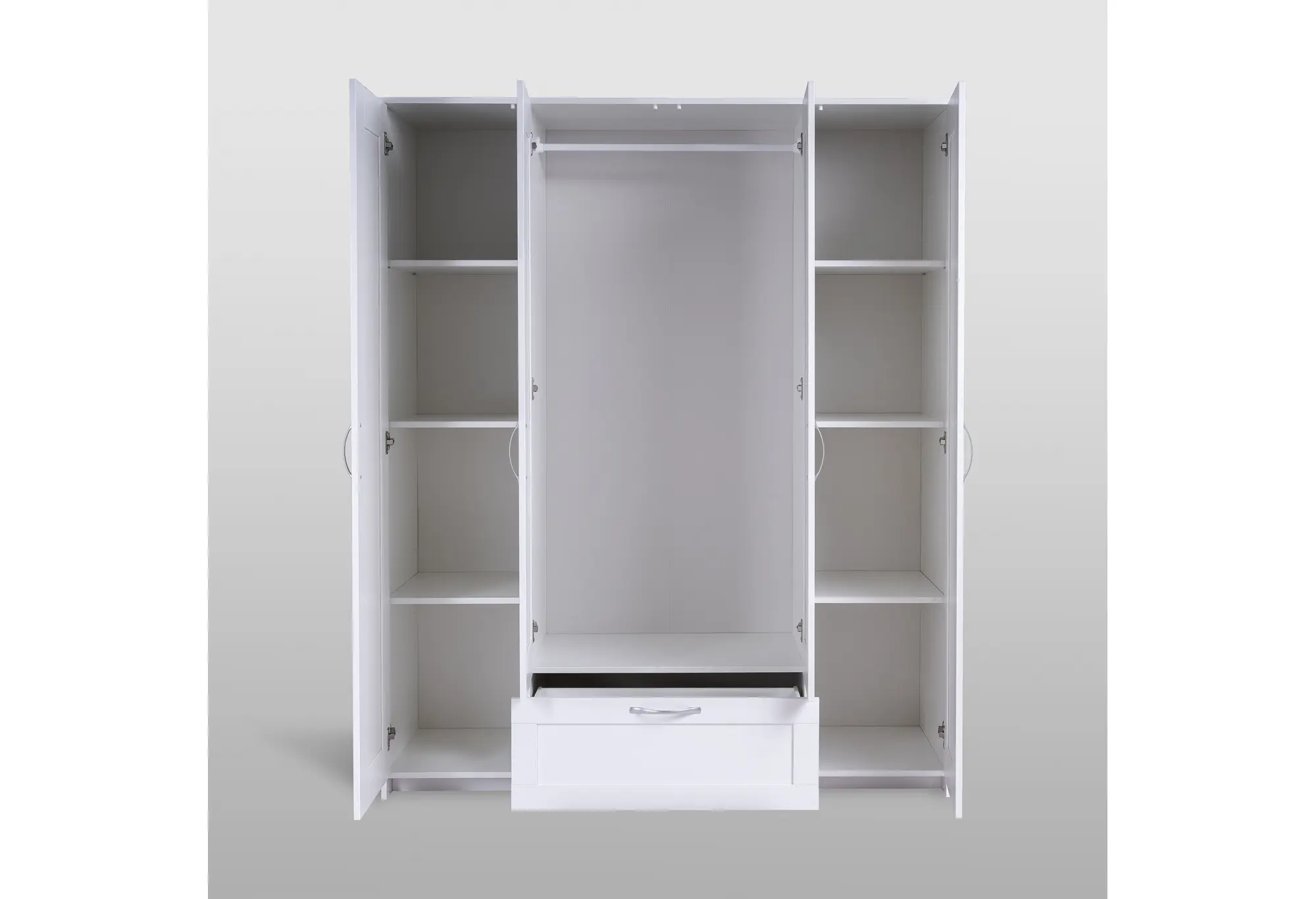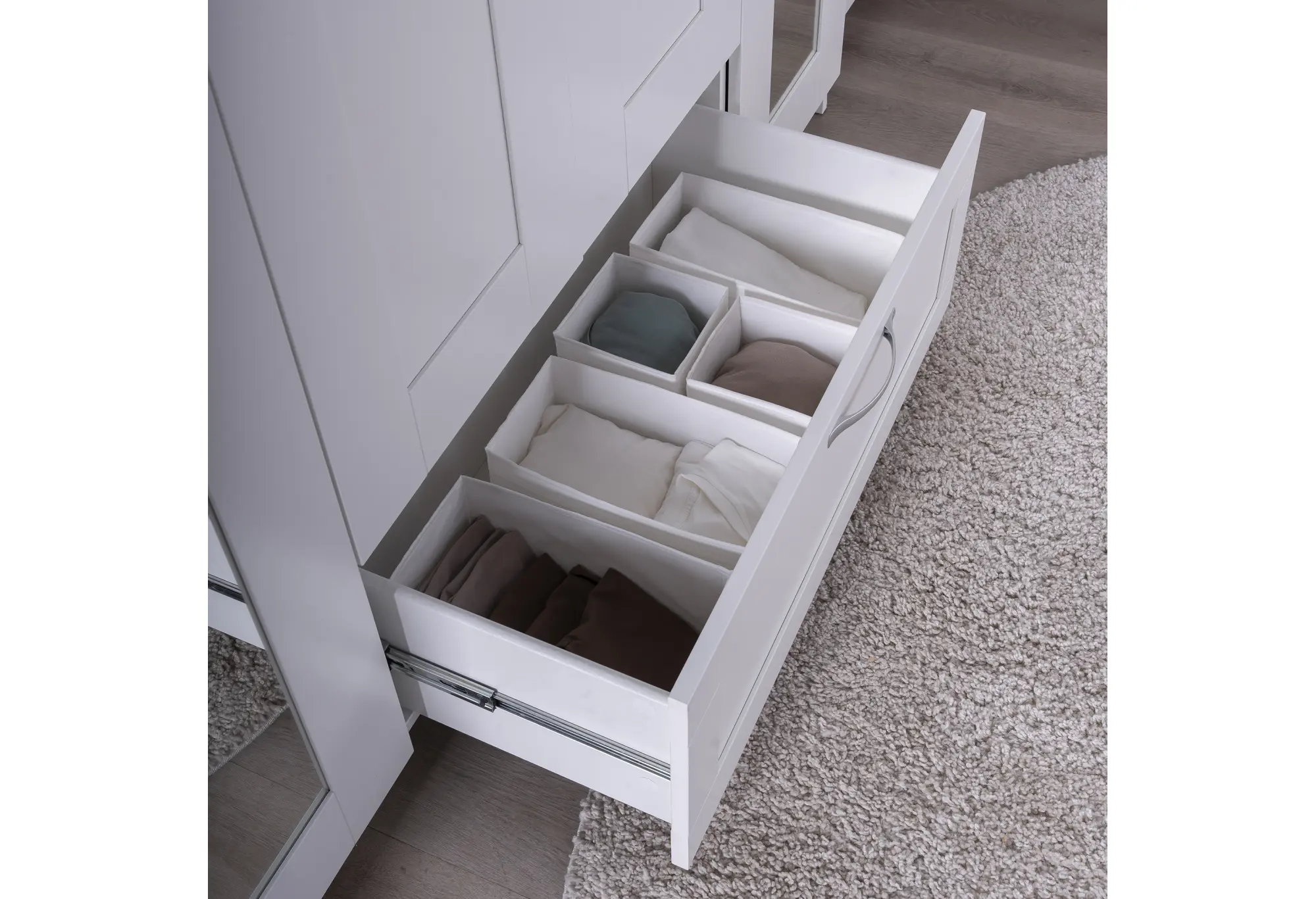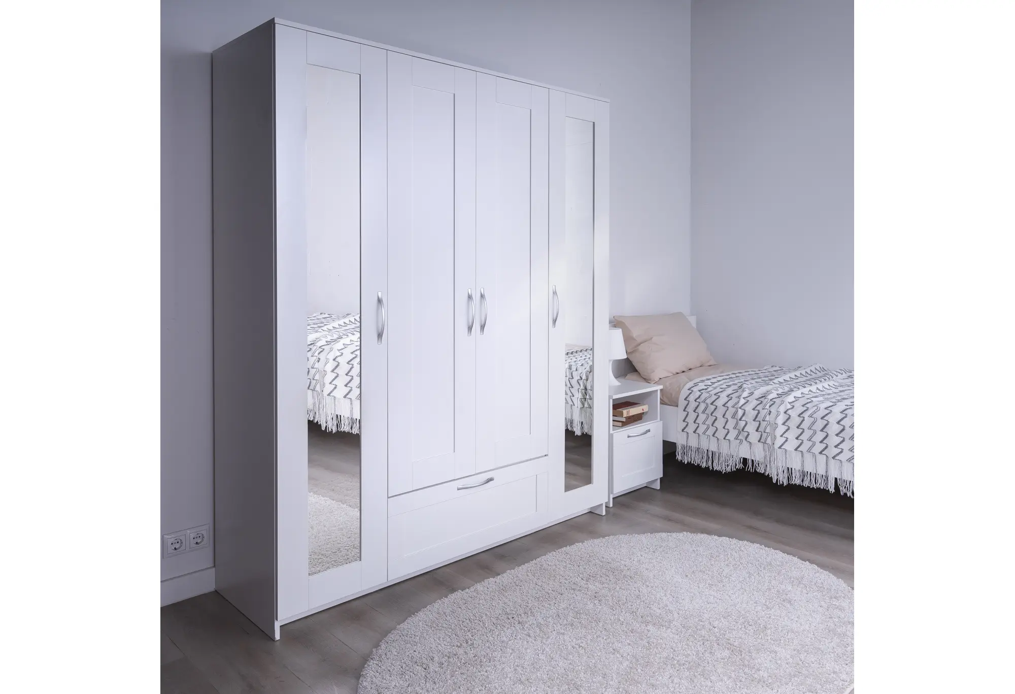 Четыре распашные двери скрывают отделения для хранения. Можно разместить повседневные вещи, сезонную одежду и объемные предметы. Два вертикальных зеркала на фасадах визуально увеличивают комнату и позволяют оценить образ в полный рост, не занимая место под отдельное зеркало.