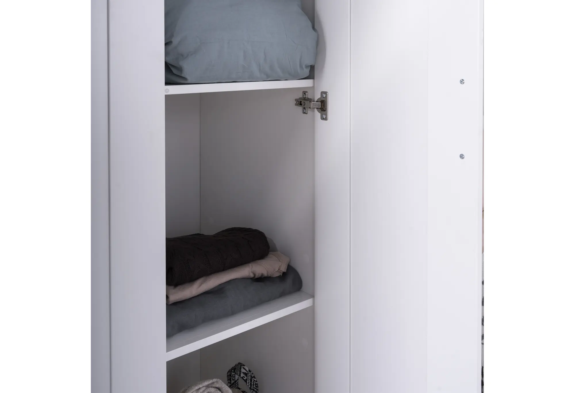 Корпус изготовлен из КДСП, что обеспечивает стабильную геометрию, простоту ухода и устойчивость к повседневным нагрузкам. Нейтральный белый цвет легко сочетается с разными стилями интерьера — от современного минимализма до классики — и освежает пространство, делая его более светлым и аккуратным.