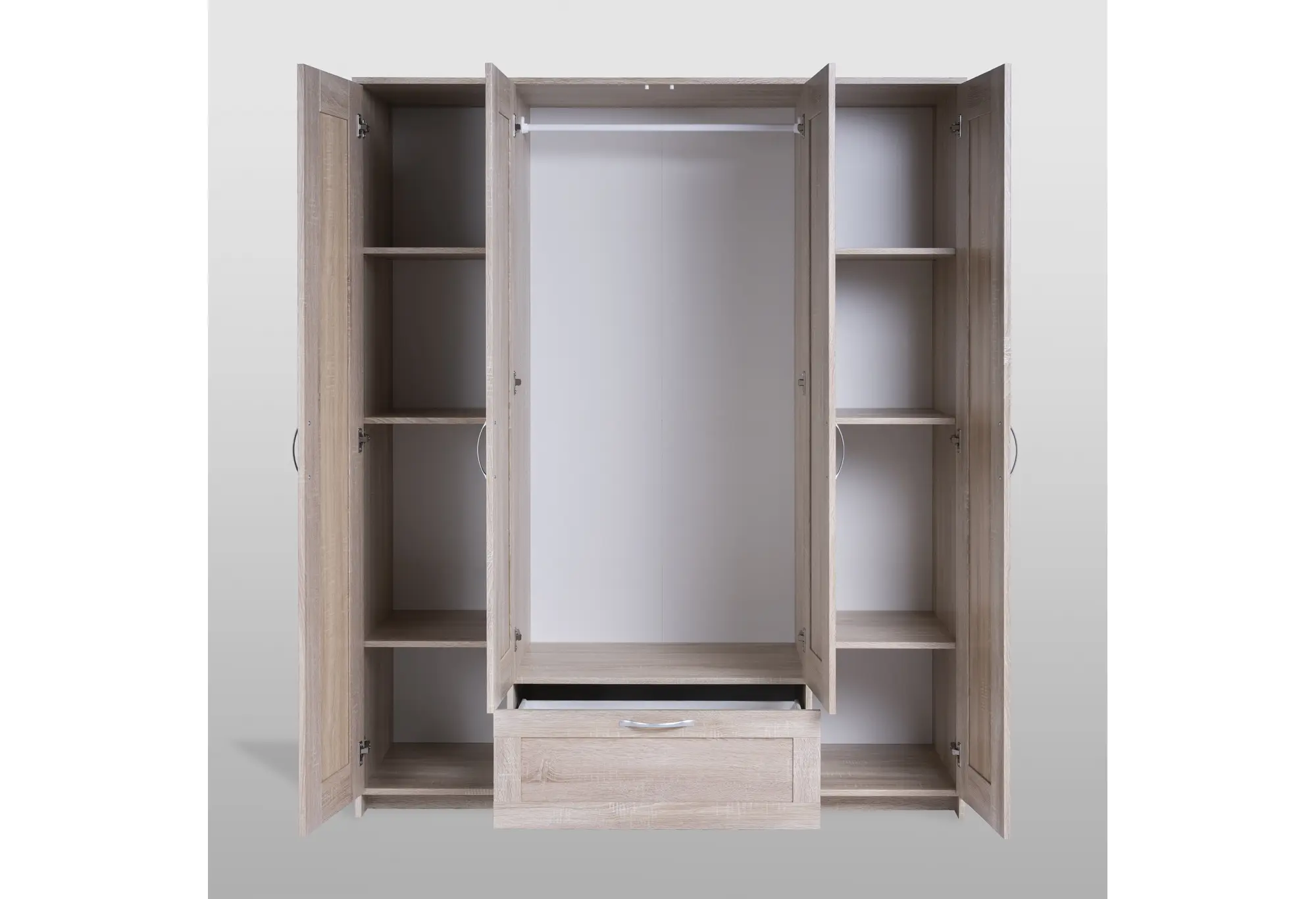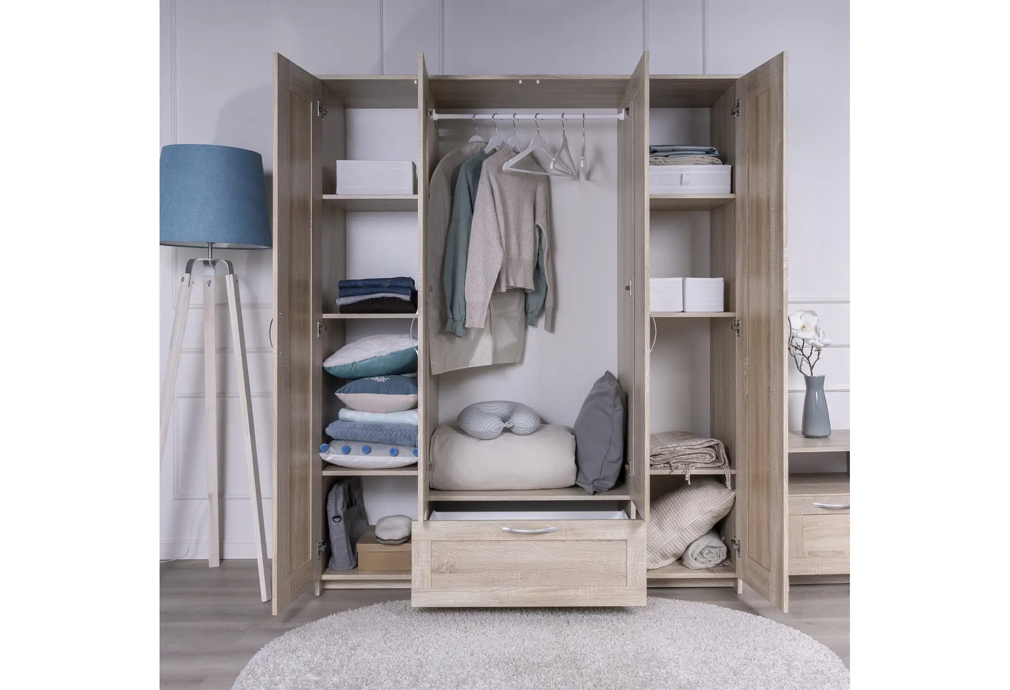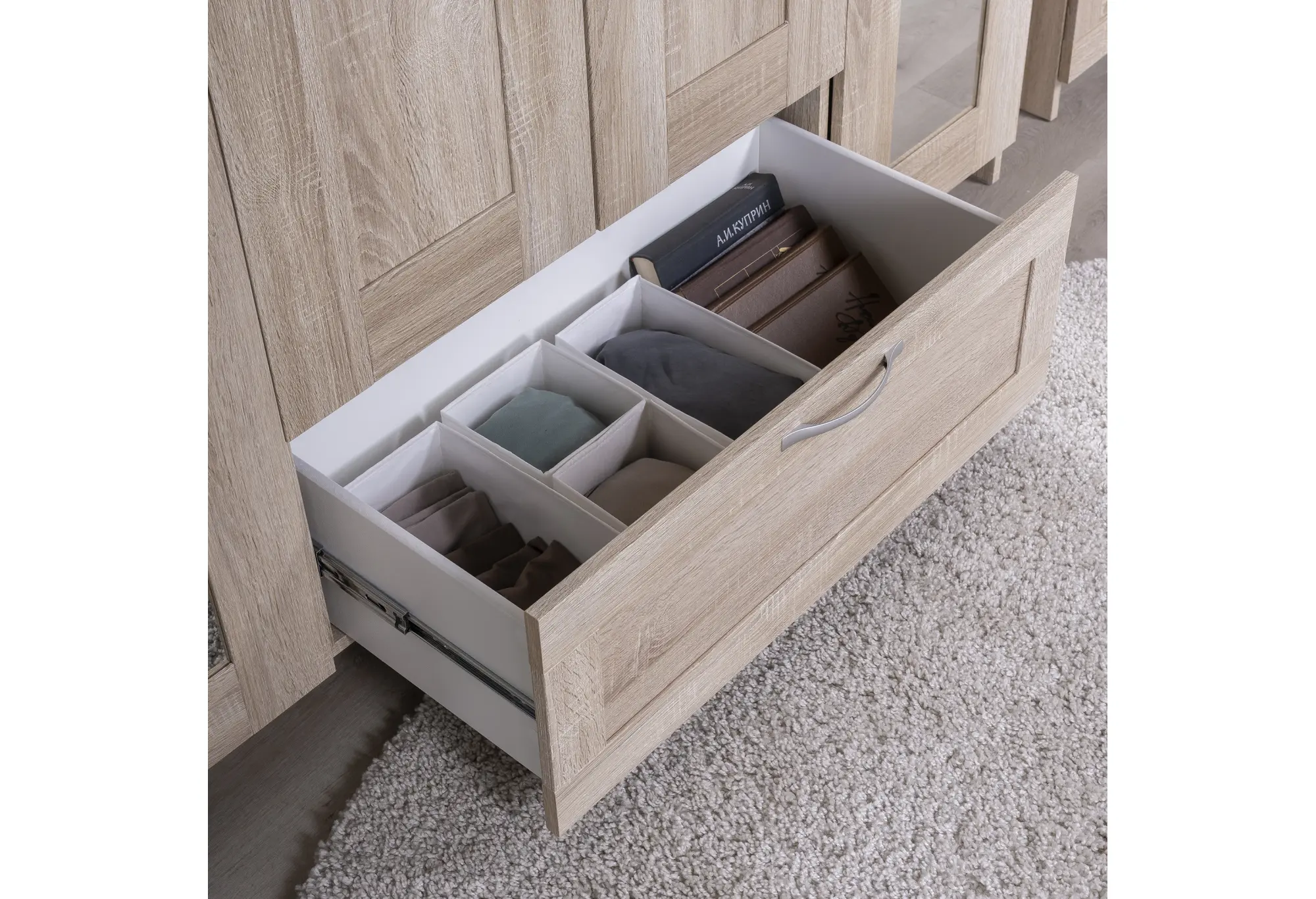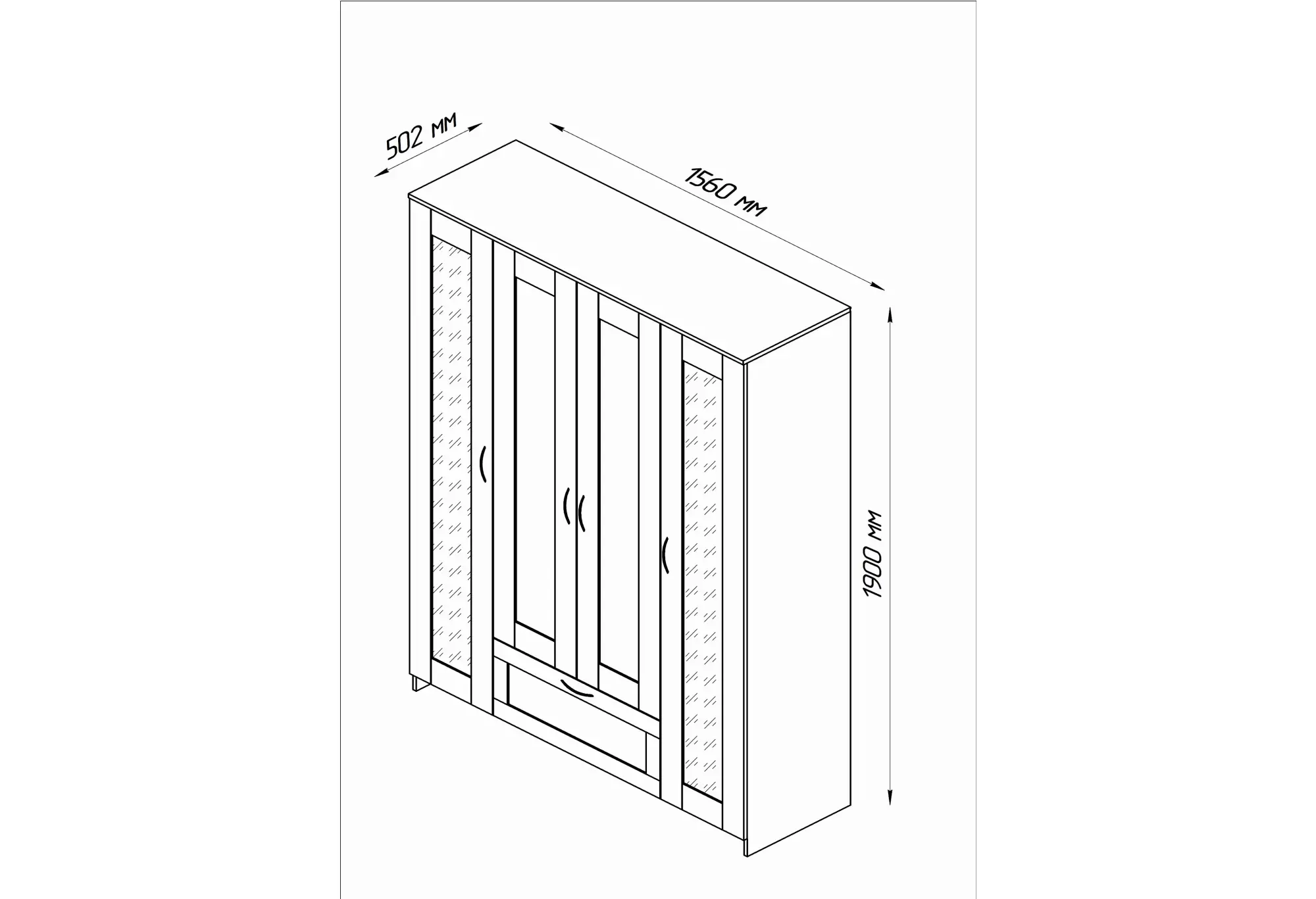 Четыре двери формируют несколько зон хранения - за глухими фасадами можно разместить одежду на полках или штанге, а за зеркальными дверцами — организовать доступ к основным вещам и одновременно использовать шкаф как зону для примерки. Зеркала на фасадах помогают визуально увеличить помещение и позволяют оценивать внешний вид в полный рост. В нижней части предусмотрен один выдвижной ящик на шариковых направляющих, рассчитанный на нагрузку до 8 кг, что подходит для аккуратного размещения белья, аксессуаров или небольших предметов одежды. Шариковые направляющие обеспечивают плавное и стабильное выдвижение ящика даже при регулярном использовании.