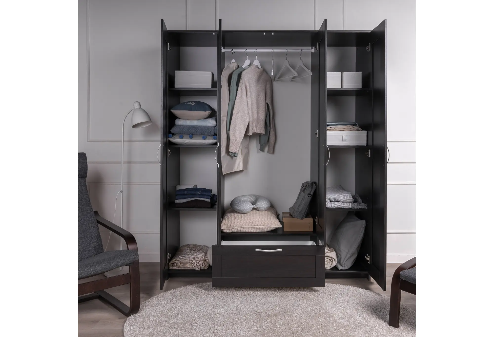 Комбинированный шкаф "Сириус" в цвете черный дуб венге — функциональное решение для хранения одежды и текстиля в спальне или прихожей. Ширина 1560 мм и высота 1900 мм обеспечивают вместительность при умеренной глубине 502 мм, что удобно как для небольших, так и для стандартных помещений.