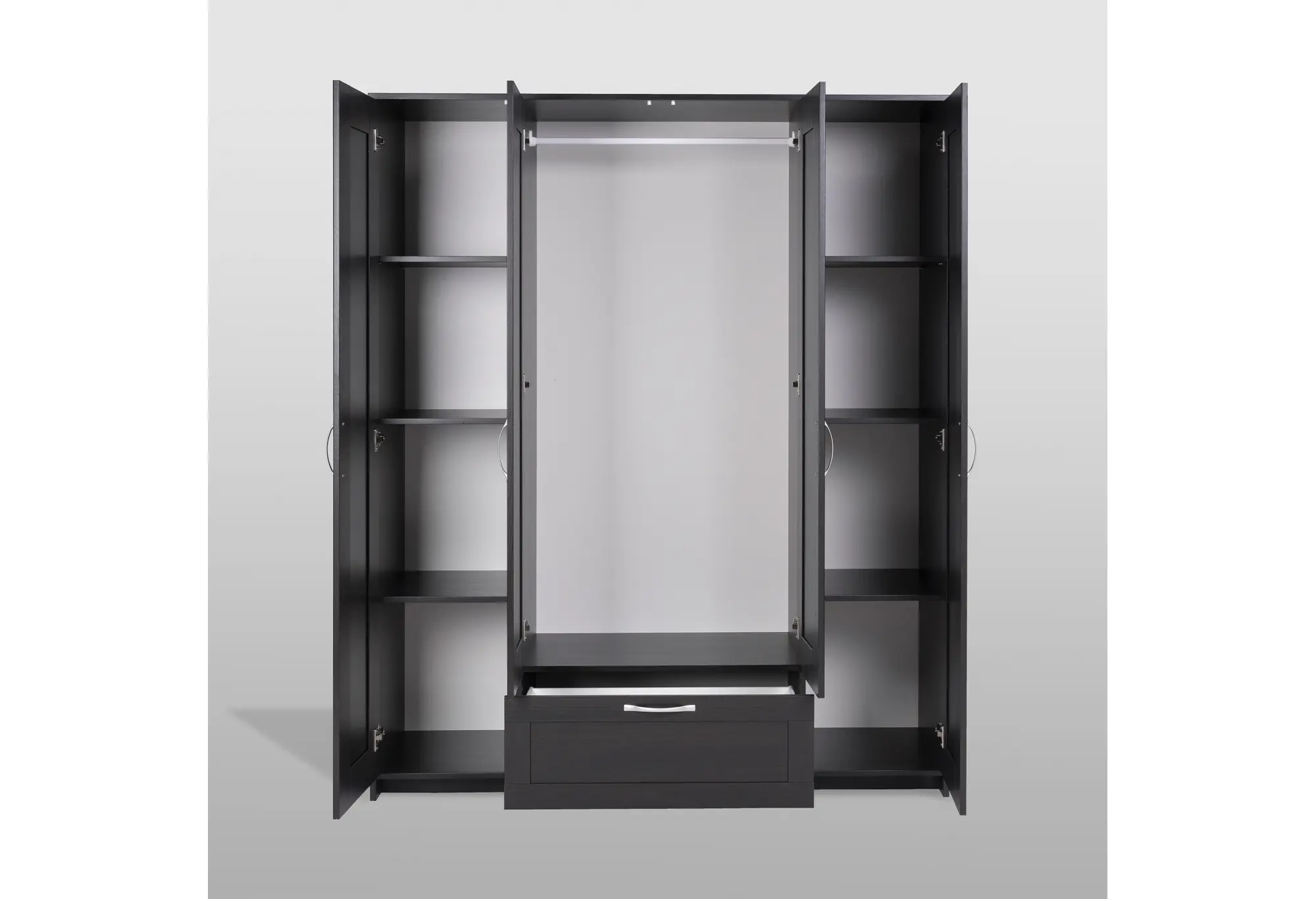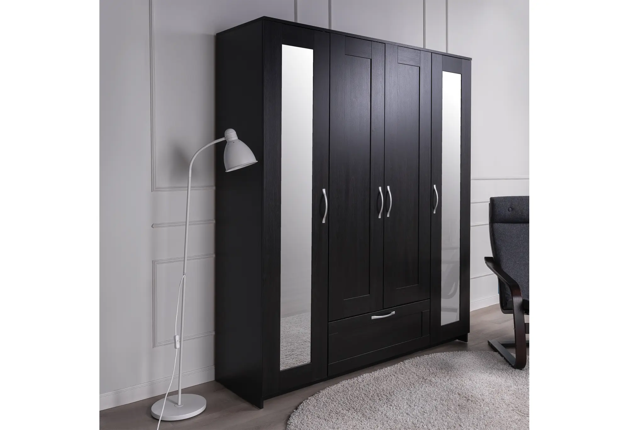 Четыре двери скрывают отделения для вешалок и полок, позволяя разместить как повседневную, так и сезонную одежду. Два зеркала на фасаде зрительно увеличивают пространство комнаты и избавляют от необходимости отдельного трюмо или зеркала в полный рост. Зеркальные полотна удобно расположены для ежедневного использования при сборе на работу или прогулку.