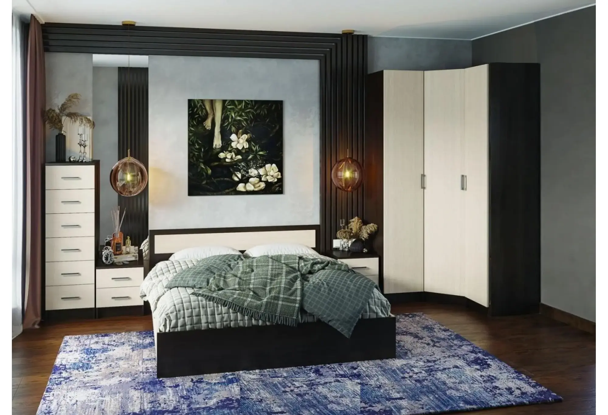Сочетание темных и светлых тонов визуально выстраивает геометрию комнаты, выделяя основные зоны и линии мебели. Высокие шкафные и комодные модули обеспечивают достаточный запас мест для одежды, белья и аксессуаров, а продуманная высота и глубина элементов делают использование мебели удобным каждый день. Кровать с широким спальным местом создает полноценную зону отдыха, а единый стиль всех модулей формирует цельный, аккуратный образ спальни.