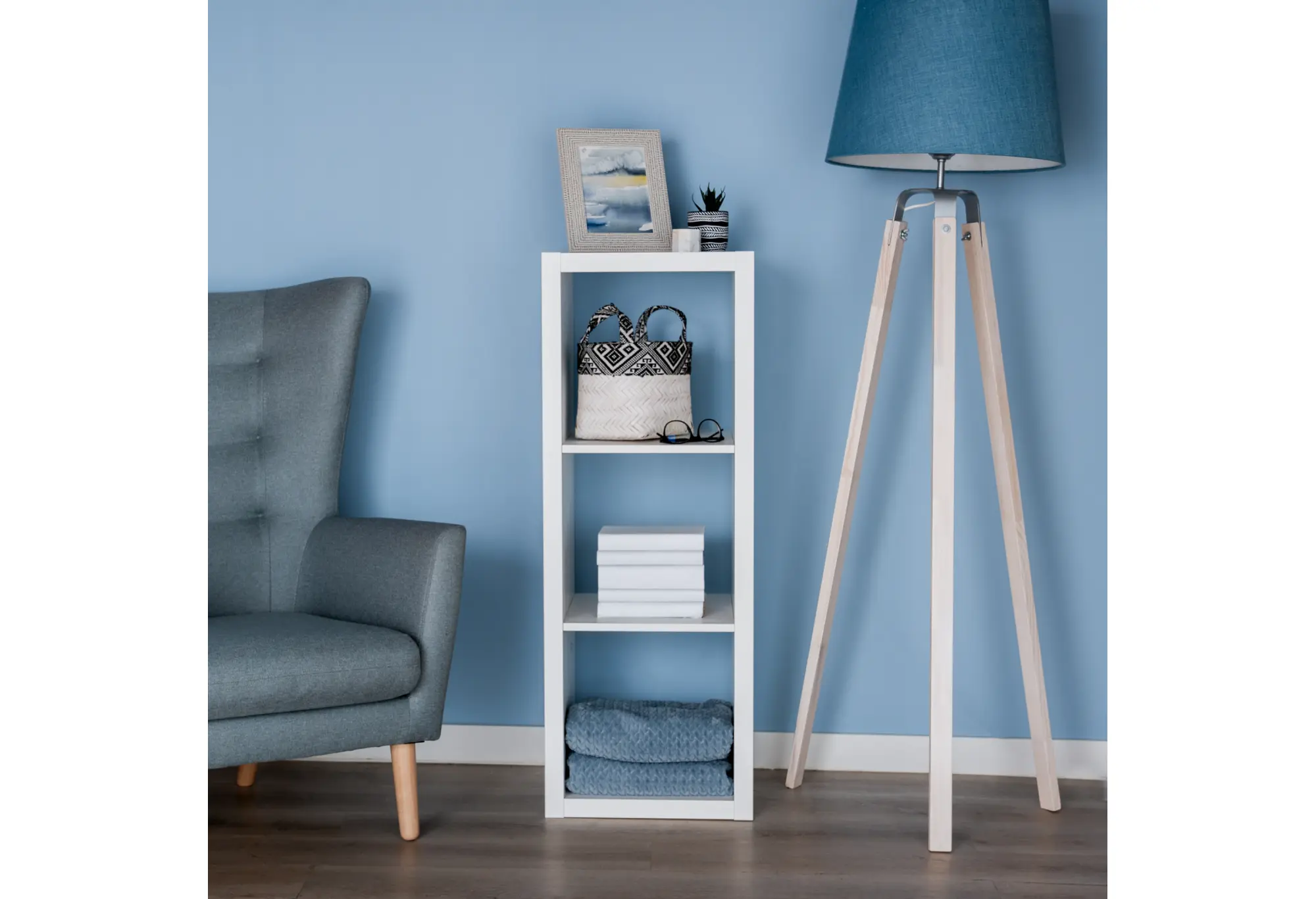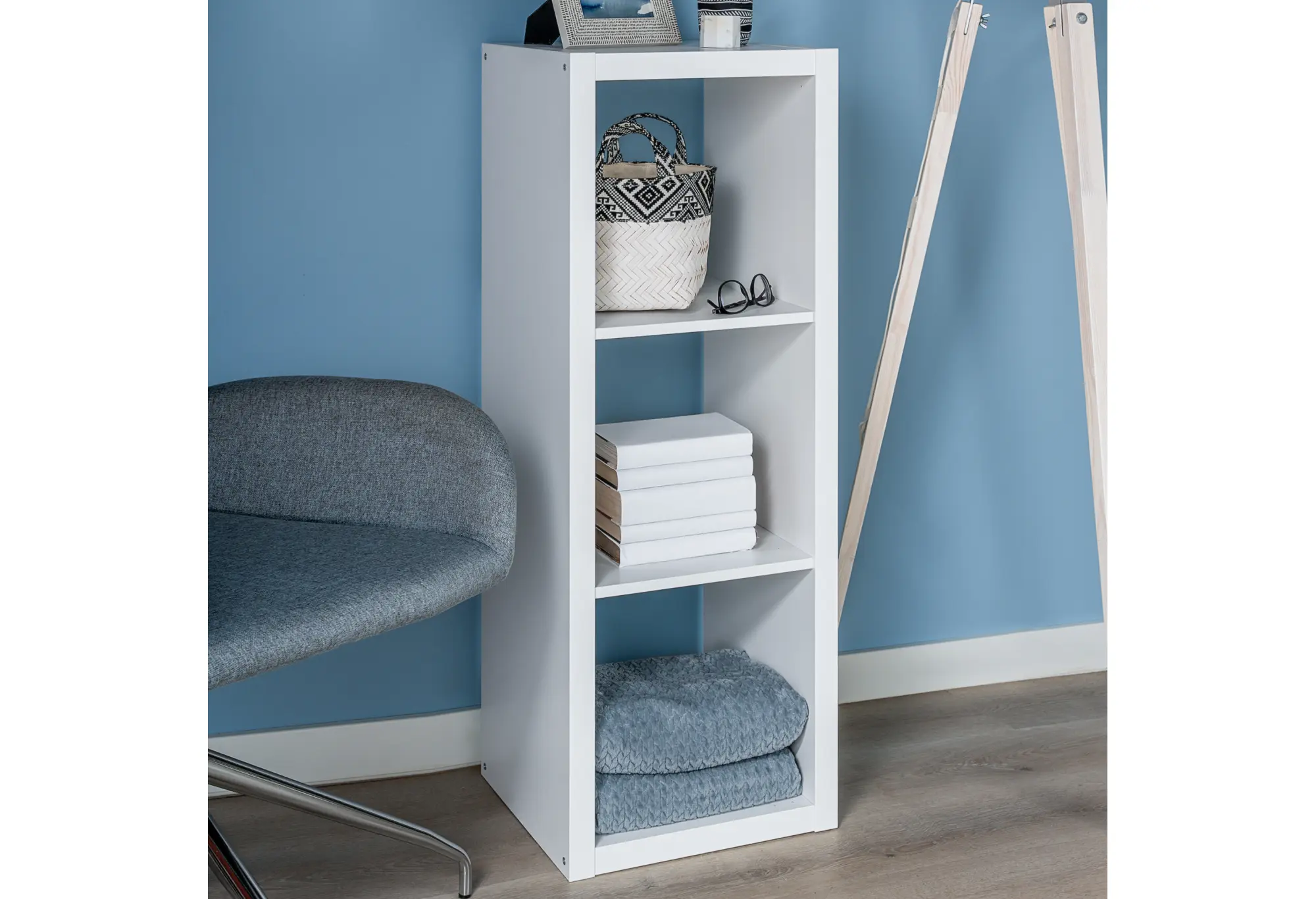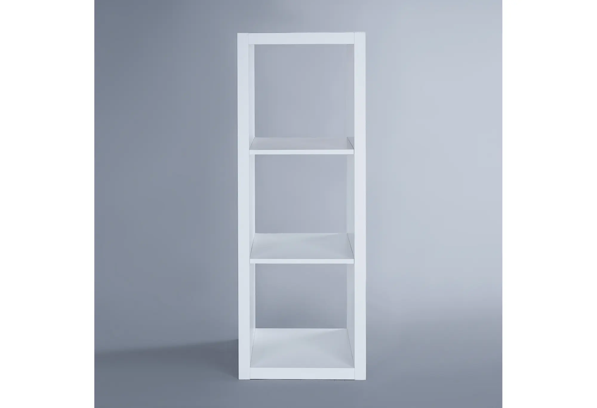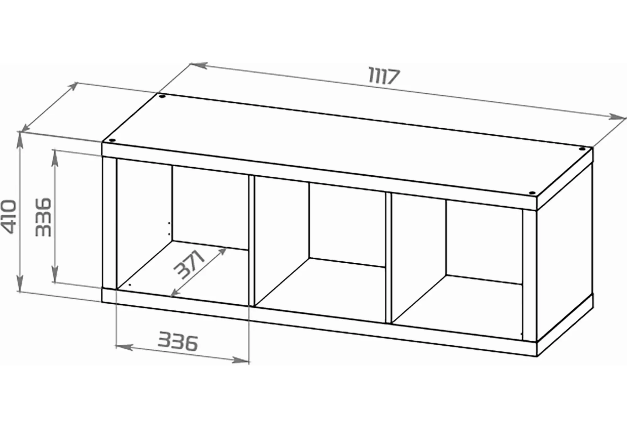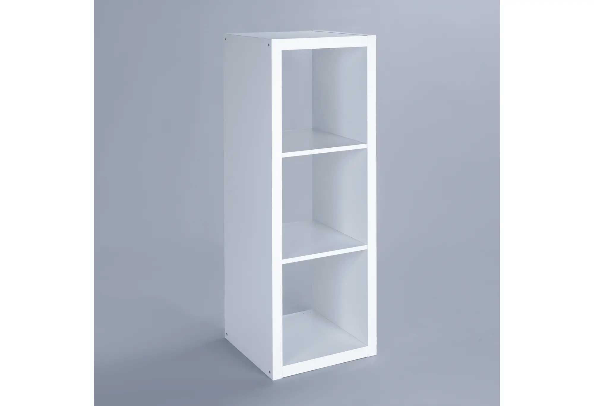 Три равномерно разделённые секции удобно использовать для книг, коробок для хранения, декоративных предметов или техники. Небольшая высота позволяет разместить стеллаж под окном, у кровати, дивана или использовать как тумбу под телевизор. Верхняя поверхность служит дополнительной полкой, на которой можно разместить аксессуары, фоторамки или компактную аппаратуру.