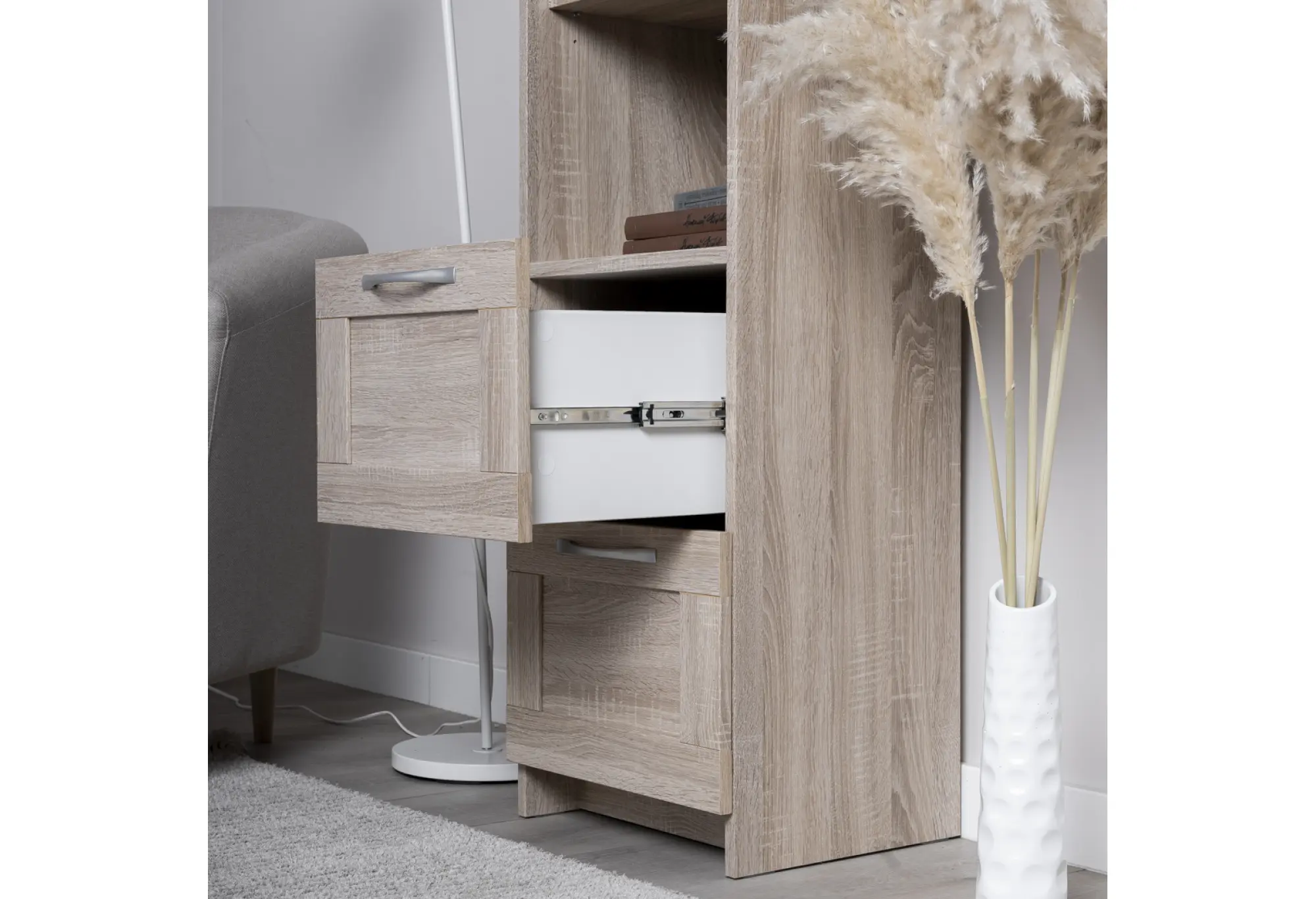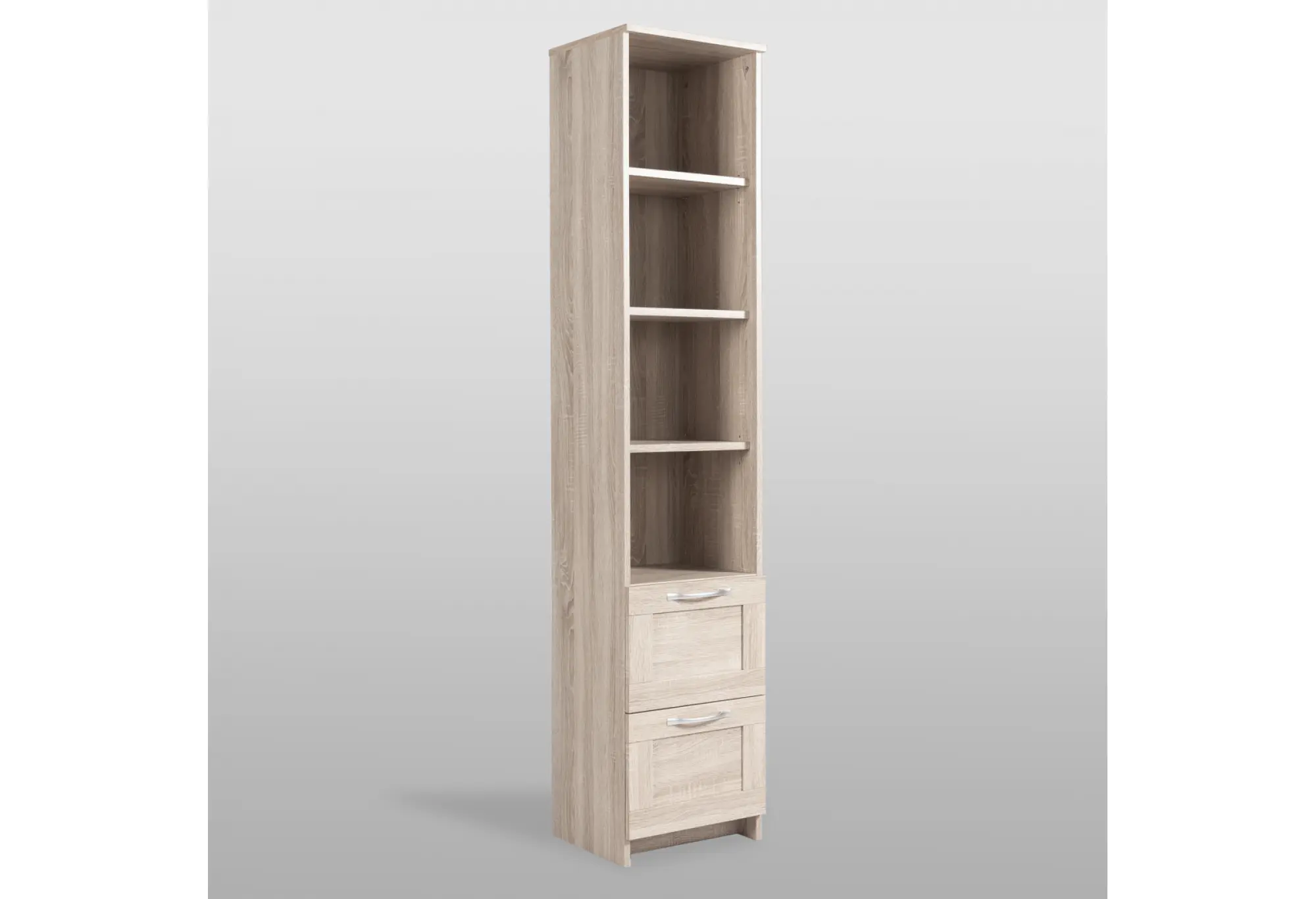 Элегантный стеллаж СИРИУС узкий в цвете Дуб Сонома станет функциональным и стильным дополнением вашего интерьера. Сочетая в себе утонченность дизайна и практичность, он предлагает четыре просторные полки для размещения книг, декоративных элементов или бытовых предметов. Два выдвижных ящика обеспечивают дополнительное место для хранения мелочей, помогая поддерживать порядок.