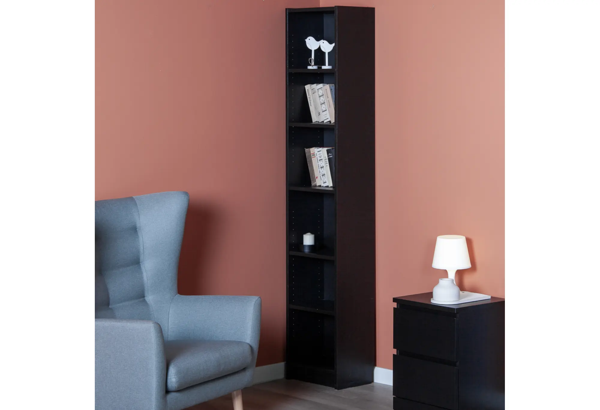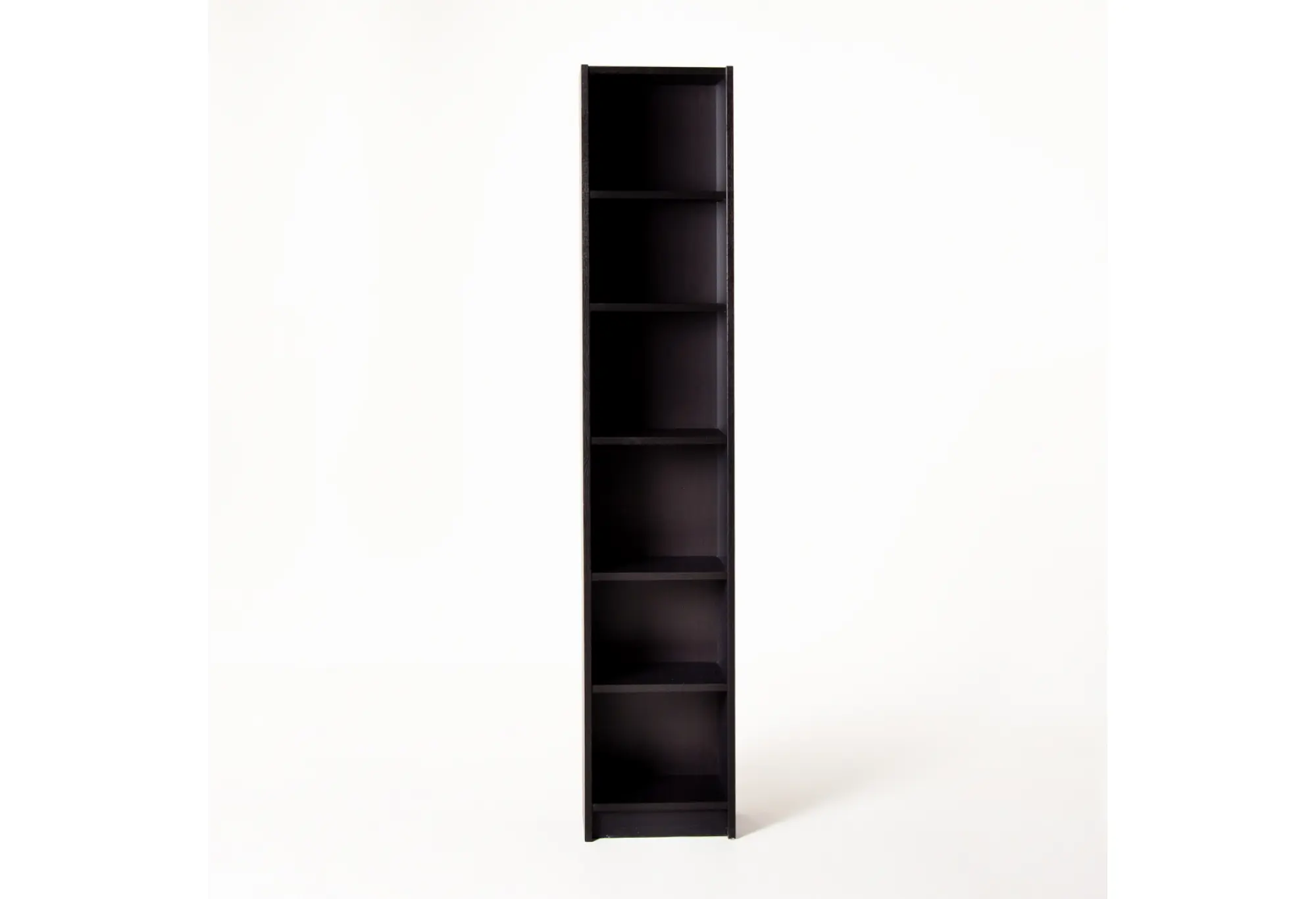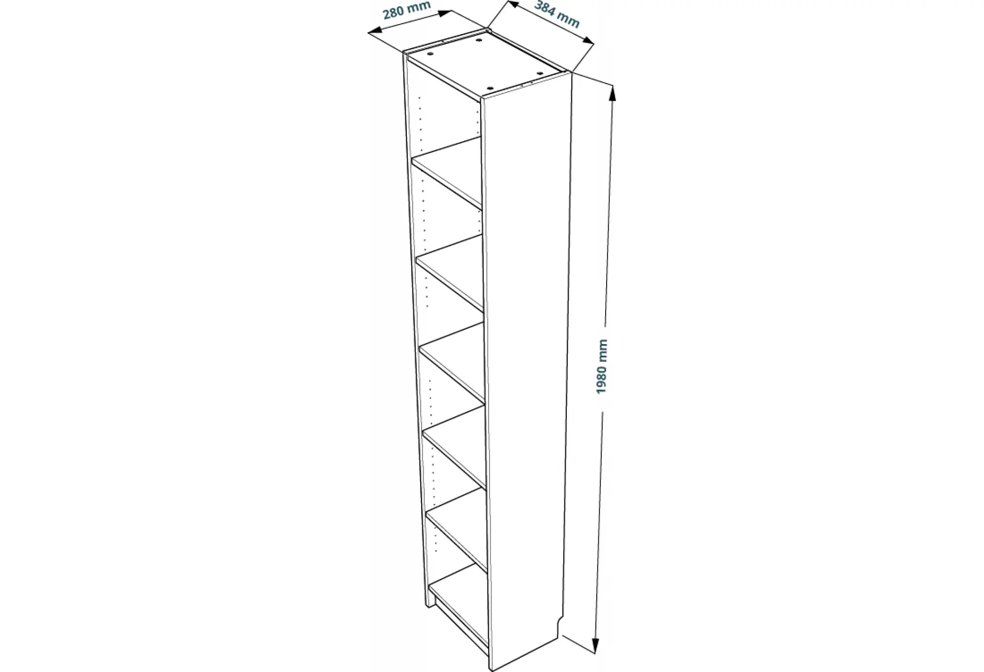 Высокий узкий стеллаж «Варма 40» в цвете черный ясень — практичное решение для хранения на ограниченном пространстве. Ширина 384 мм и глубина 280 мм позволяют разместить его даже в небольших нишах, коридоре или домашнем офисе, при этом высота почти 2 метра дает сразу шесть удобных полок.