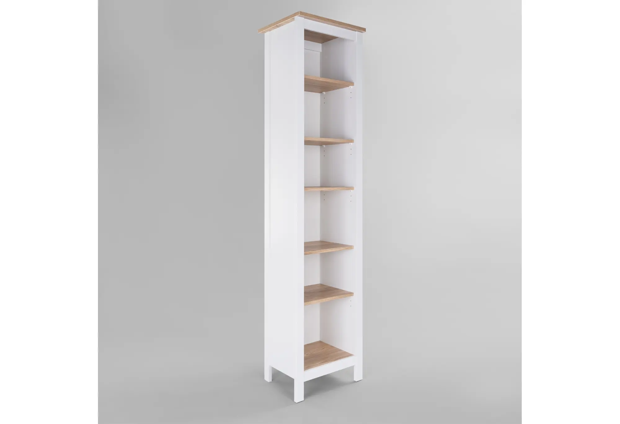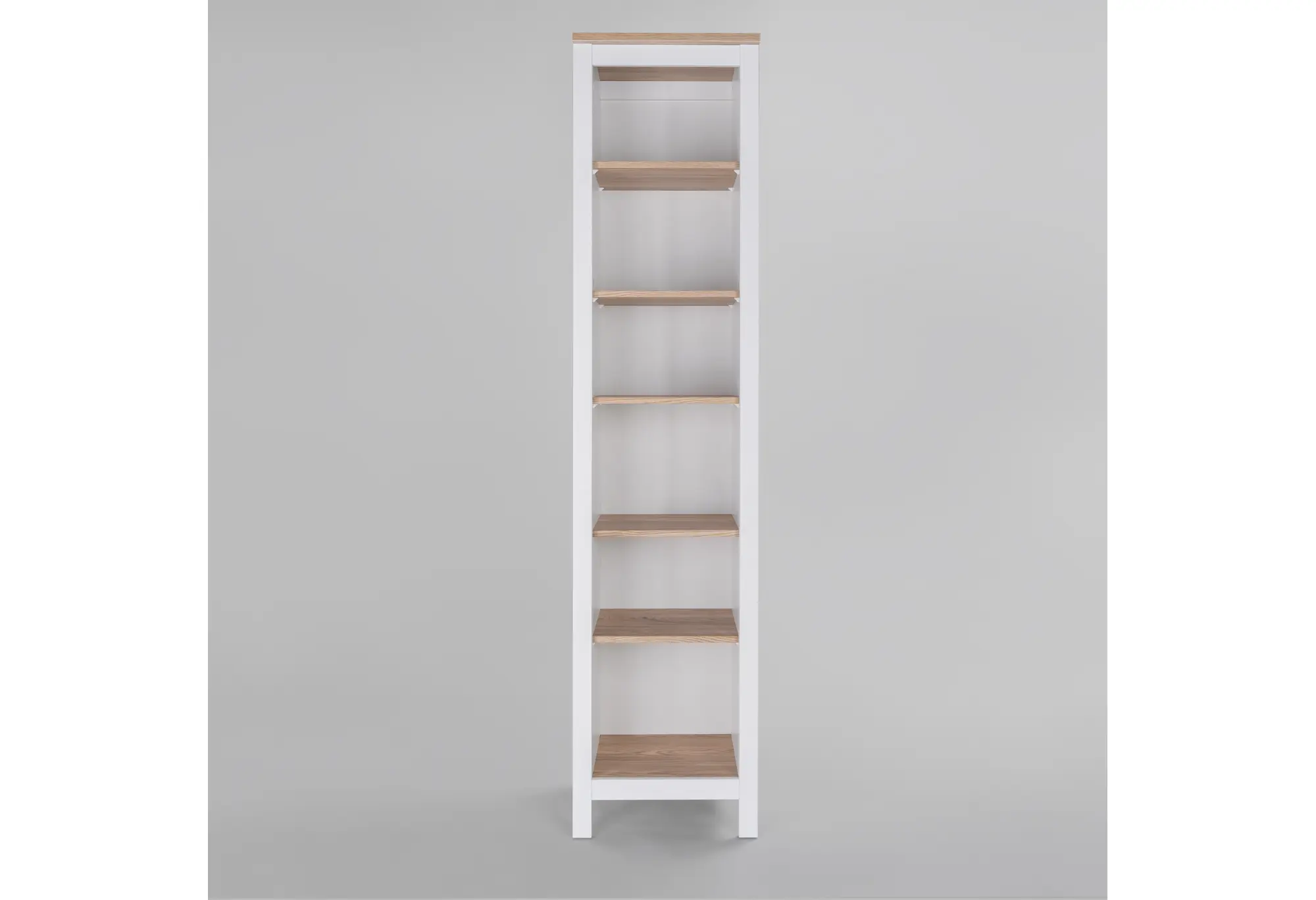 Стеллаж из коллекции «САГА» в цвете белый/ясень — это функциональное решение для хранения в гостиной, спальне, кабинете или офисе. Благодаря высоте свыше двух метров и пяти открытым полкам стеллаж позволяет рационально использовать вертикальное пространство и разместить книги, декоративные элементы, документы или коробки для хранения.