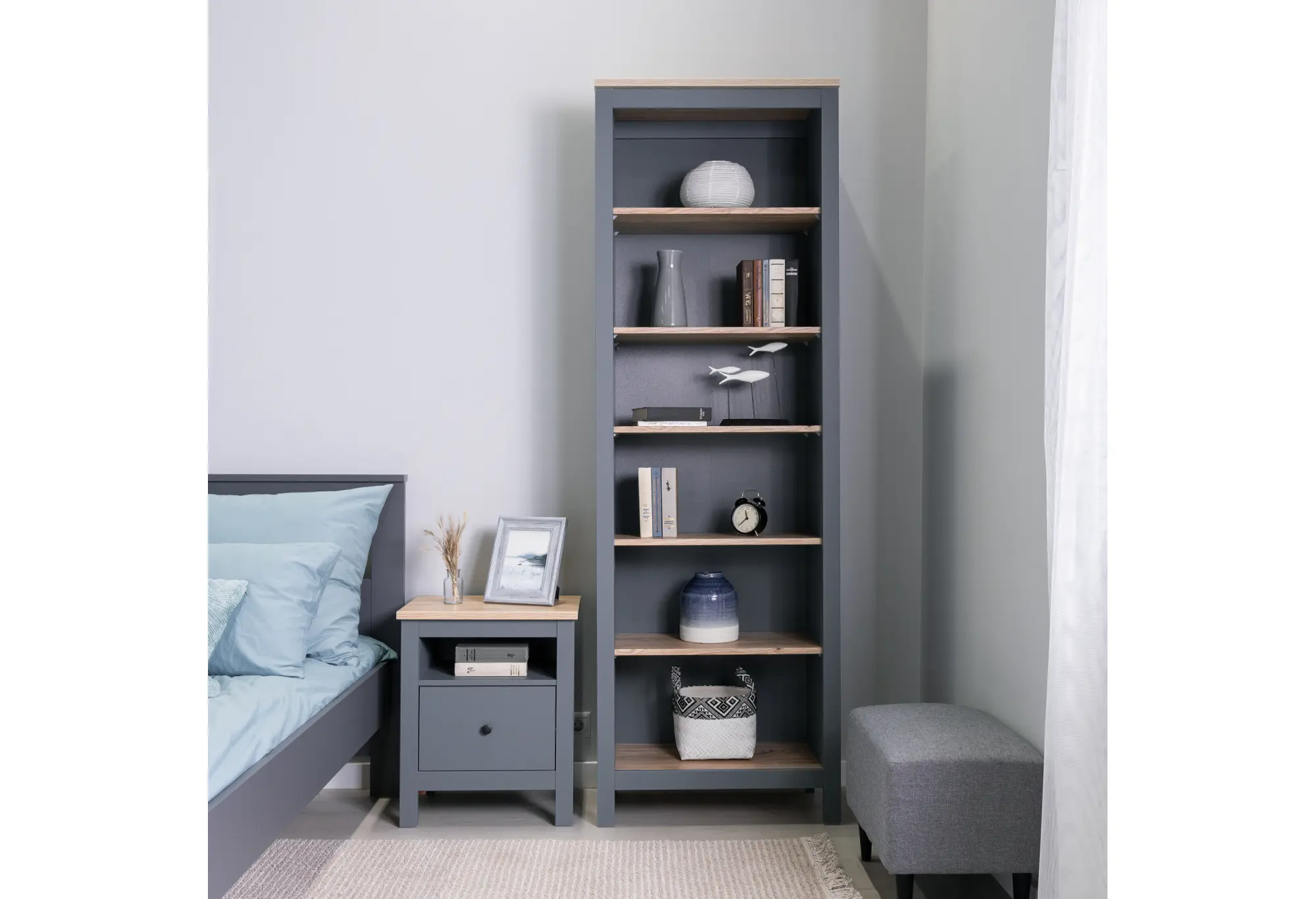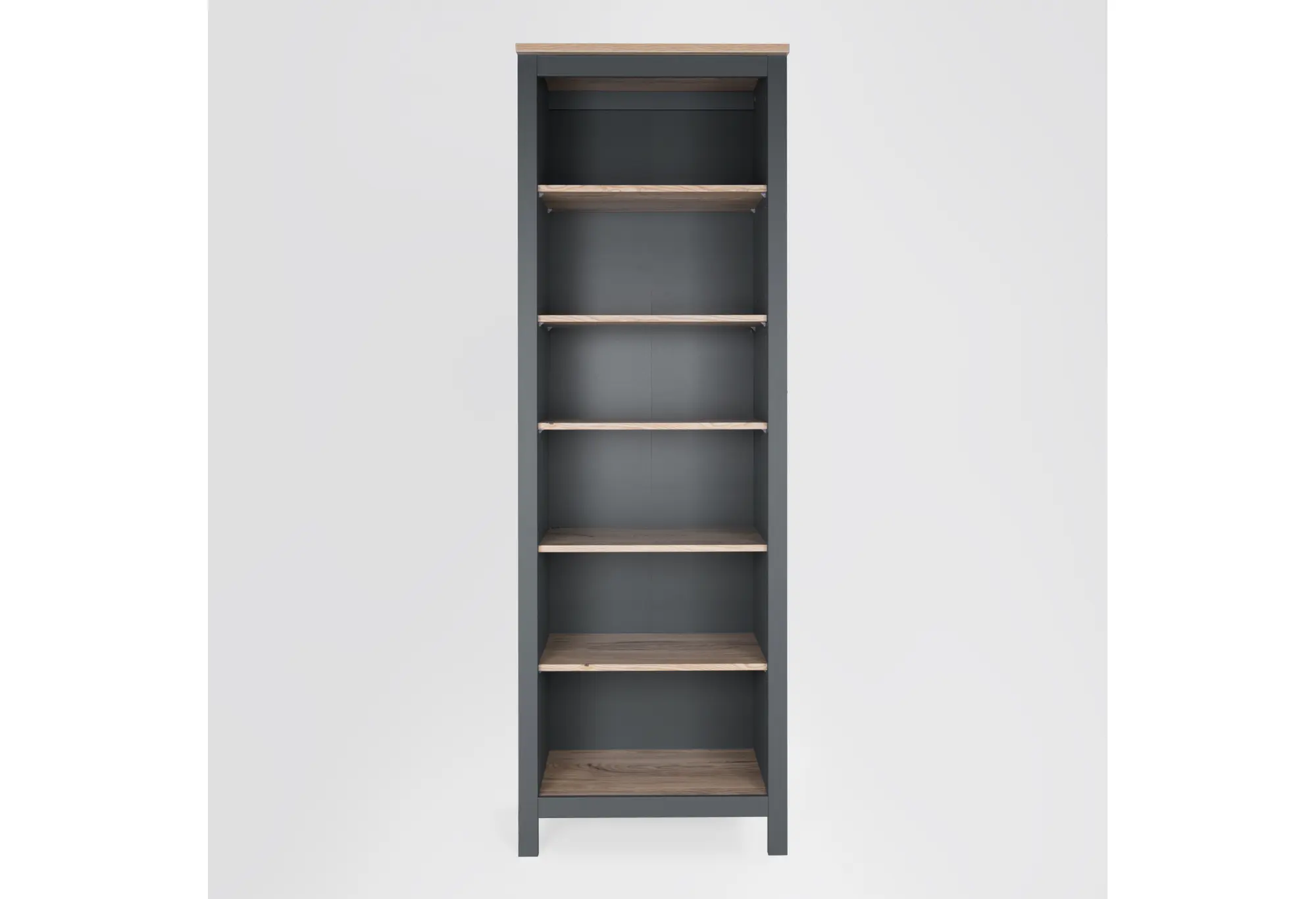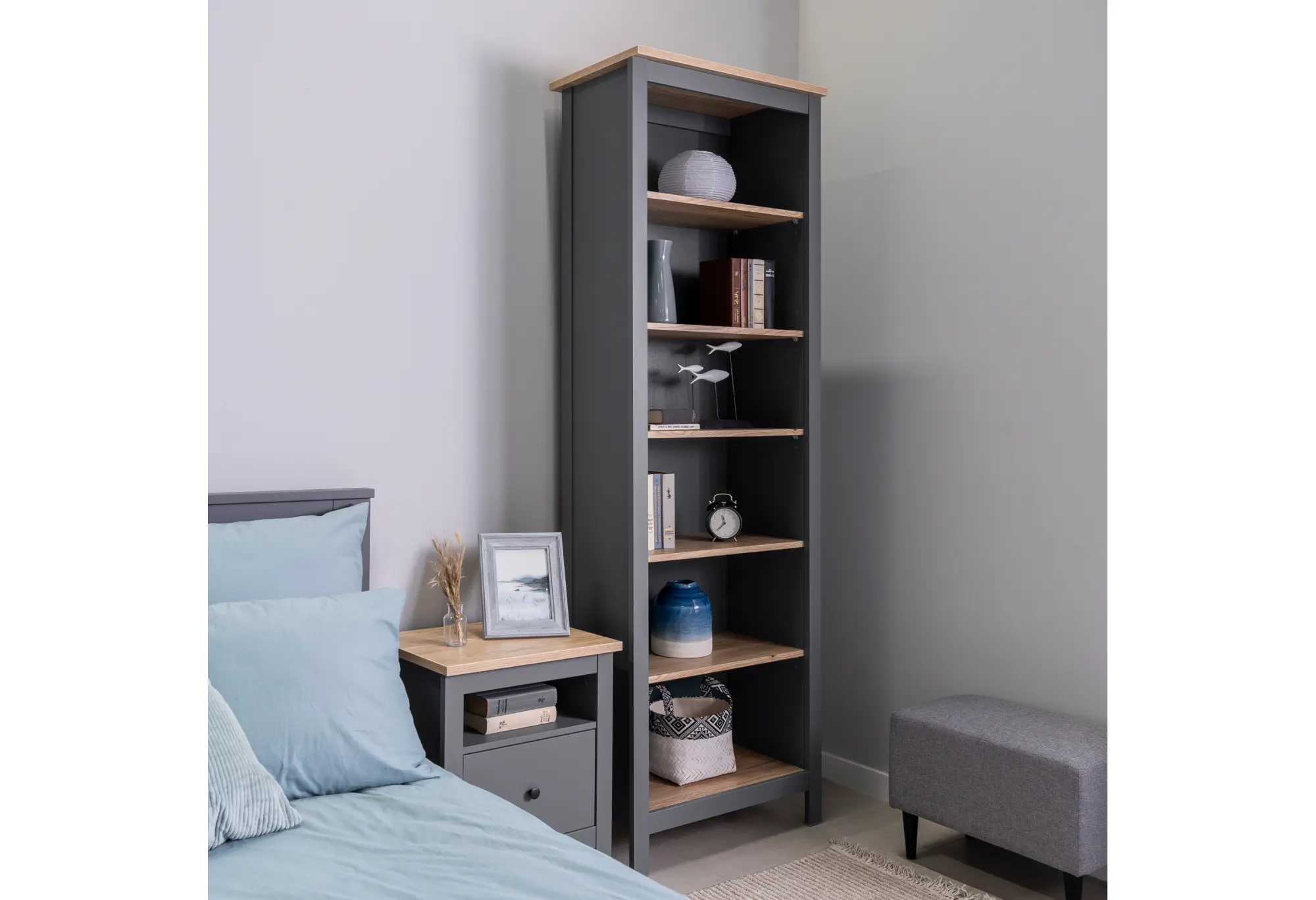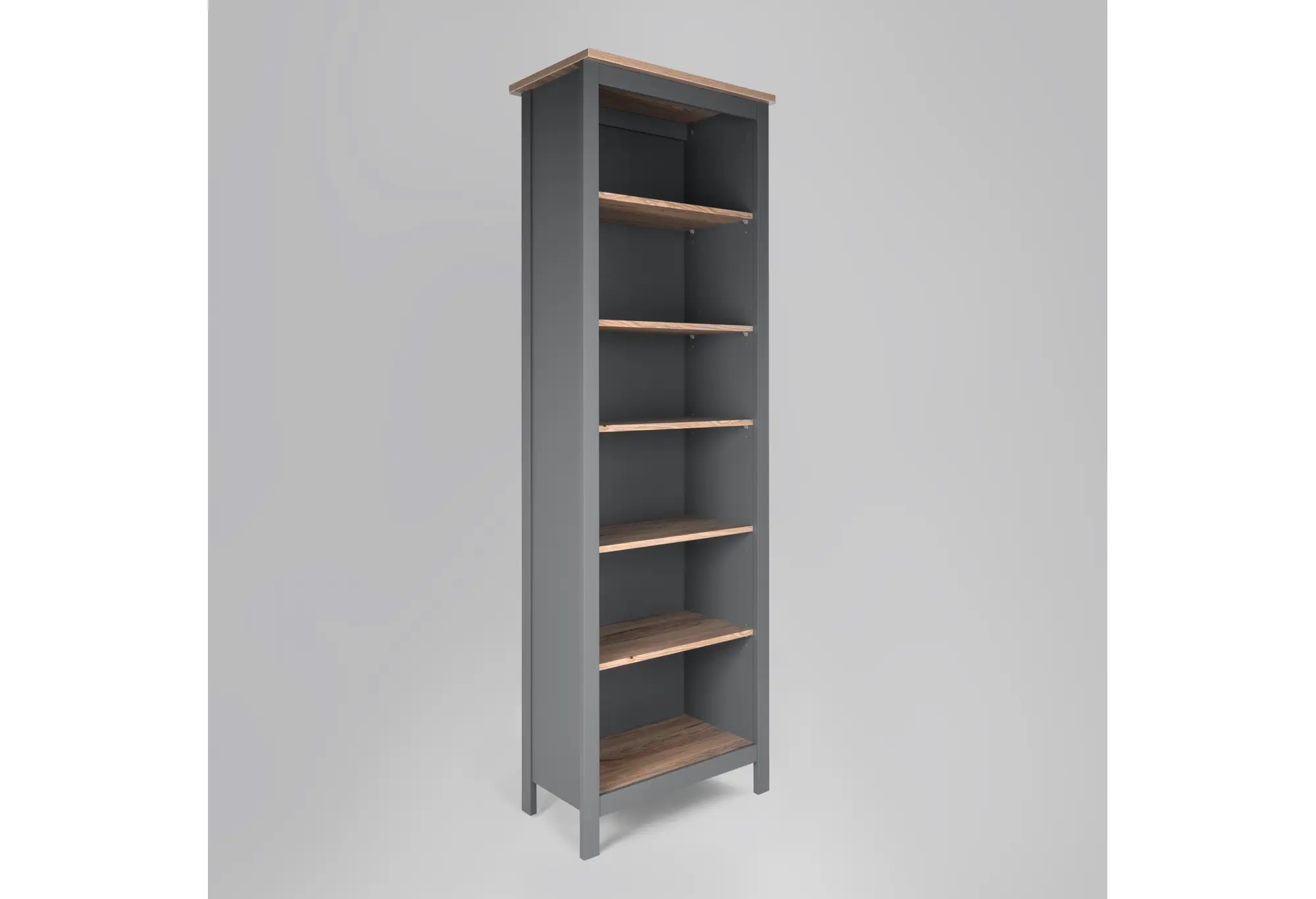 Лаконичный высокий стеллаж в сочетании серого цвета и оттенка «ясень» подойдёт как для современной гостиной, так и для домашнего кабинета или офиса. Продуманная высота и оптимальная глубина создают достаточно места для книг, папок, декоративных элементов и повседневных вещей, не перегружая пространство.