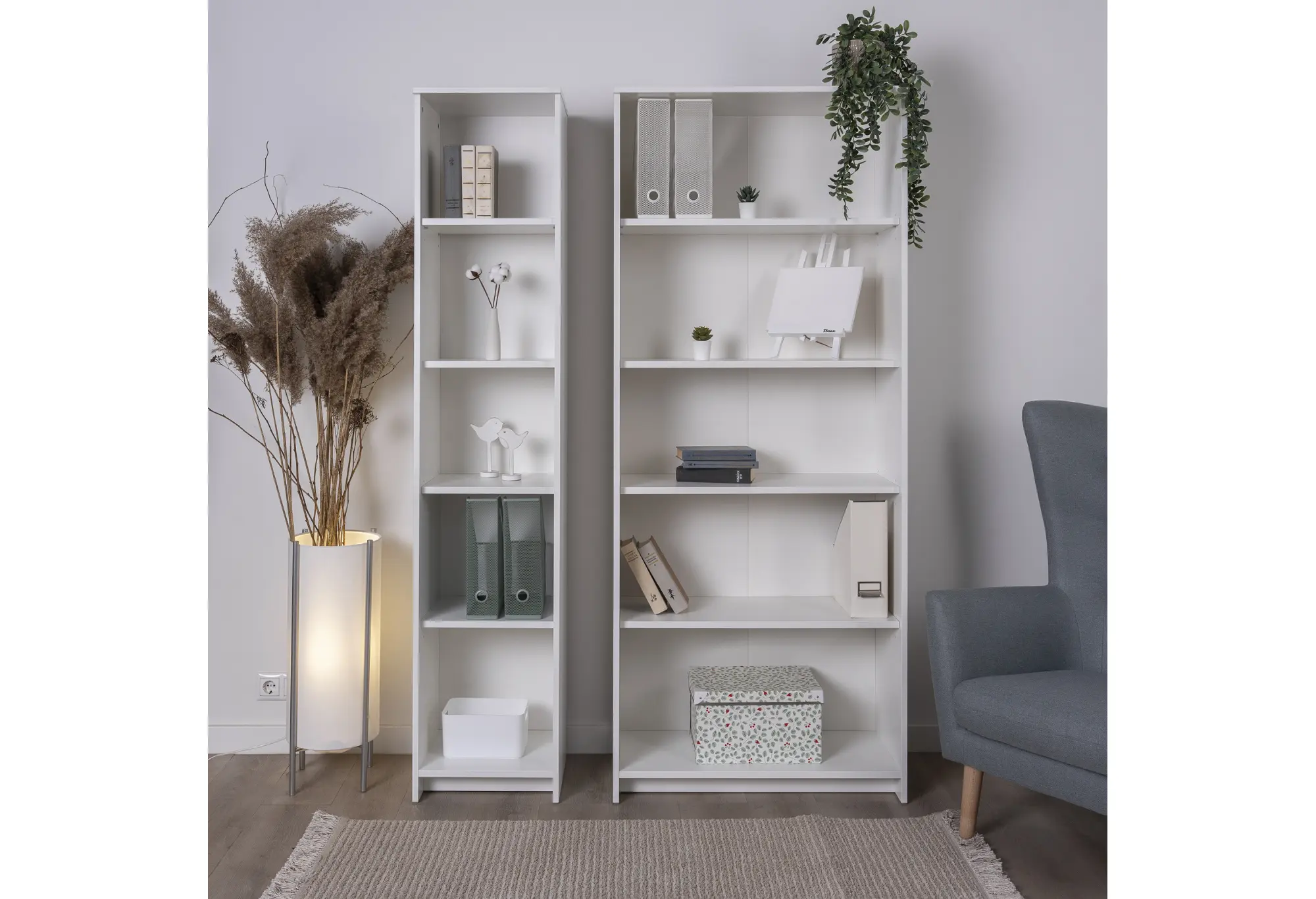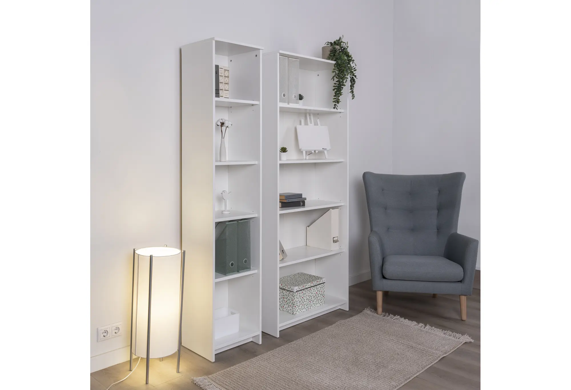 Универсальный высокий стеллаж для хранения дома и в офисе. Продуманная высота позволяет разместить большое количество вещей, при этом конструкция остается визуально легкой и аккуратной. Пять открытых полок образуют удобное рабочее пространство для книг, папок, декоративных элементов, коробов и повседневных мелочей.