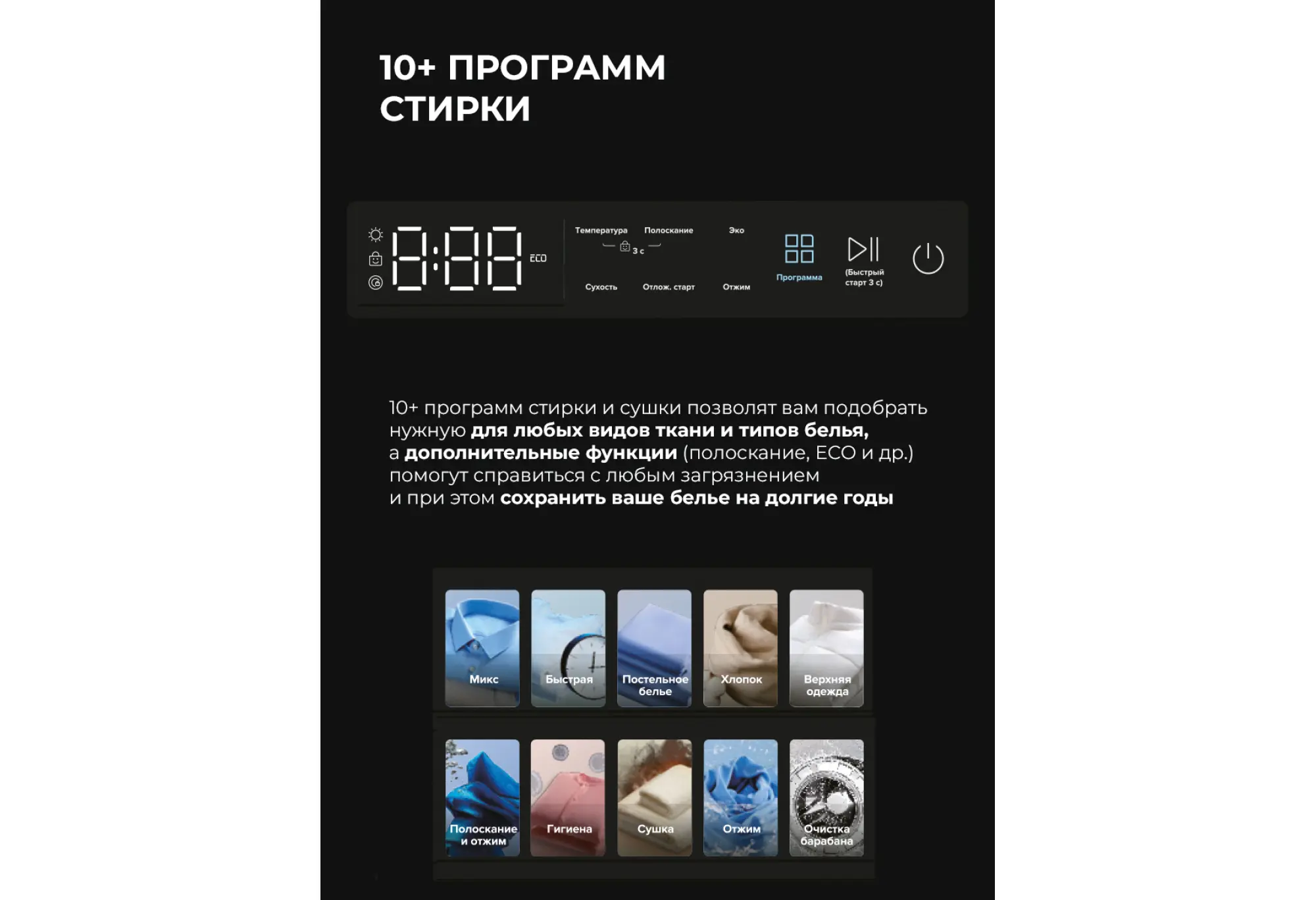 Модель LEX LWM 10612 GRID MAGNA — это отдельностоящая стирально-сушильная машина с сенсорным управлением и премиальным дизайном, доступная в сером и белом цветах.Важные преимущества:10 программ стирки: