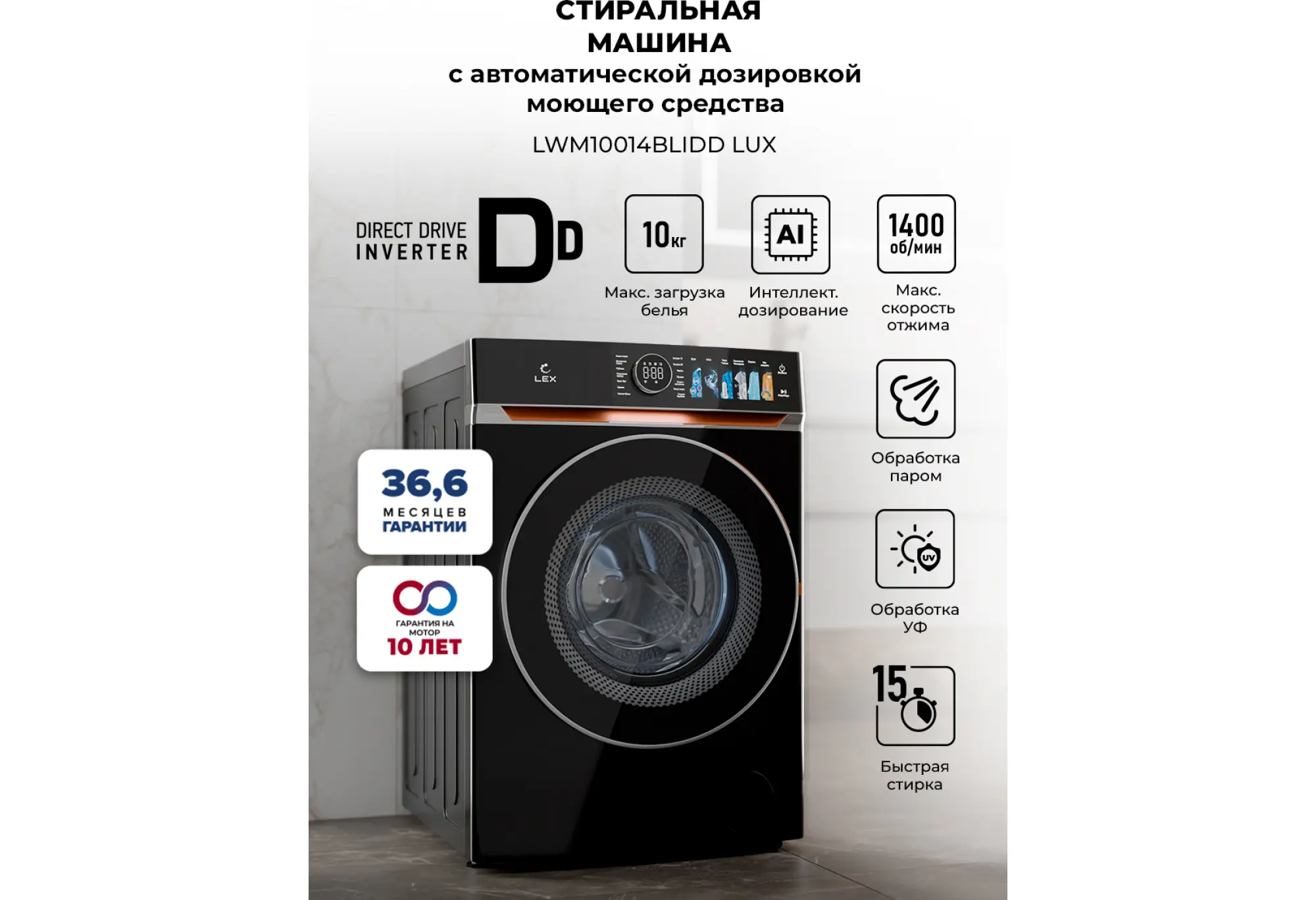 Модель LEX LWM10014 Lux — это отдельностоящая стиральная машина с сенсорным управлением и премиальным дизайном, доступная в черном и белом цветах.Важные преимущества:14+ программ стирки:А дополнительные функции (обработка ультрафиолетом, дополнительное полоскание и др.) помогут справиться с любым загрязнением и при этом сохранить ваше бельё на долгие годы.Кол-во программ: 14, Super spa, Воздушная стирка, Деликатная стирка, нижнее белье, Одеяла, Очистка барабана, Полоскание + отжим, Пуховик, Режим 15 мин, Режим 30 мин, Рубашки, Спортивная одежда, Только отжим, Умная стирка, Шерсть