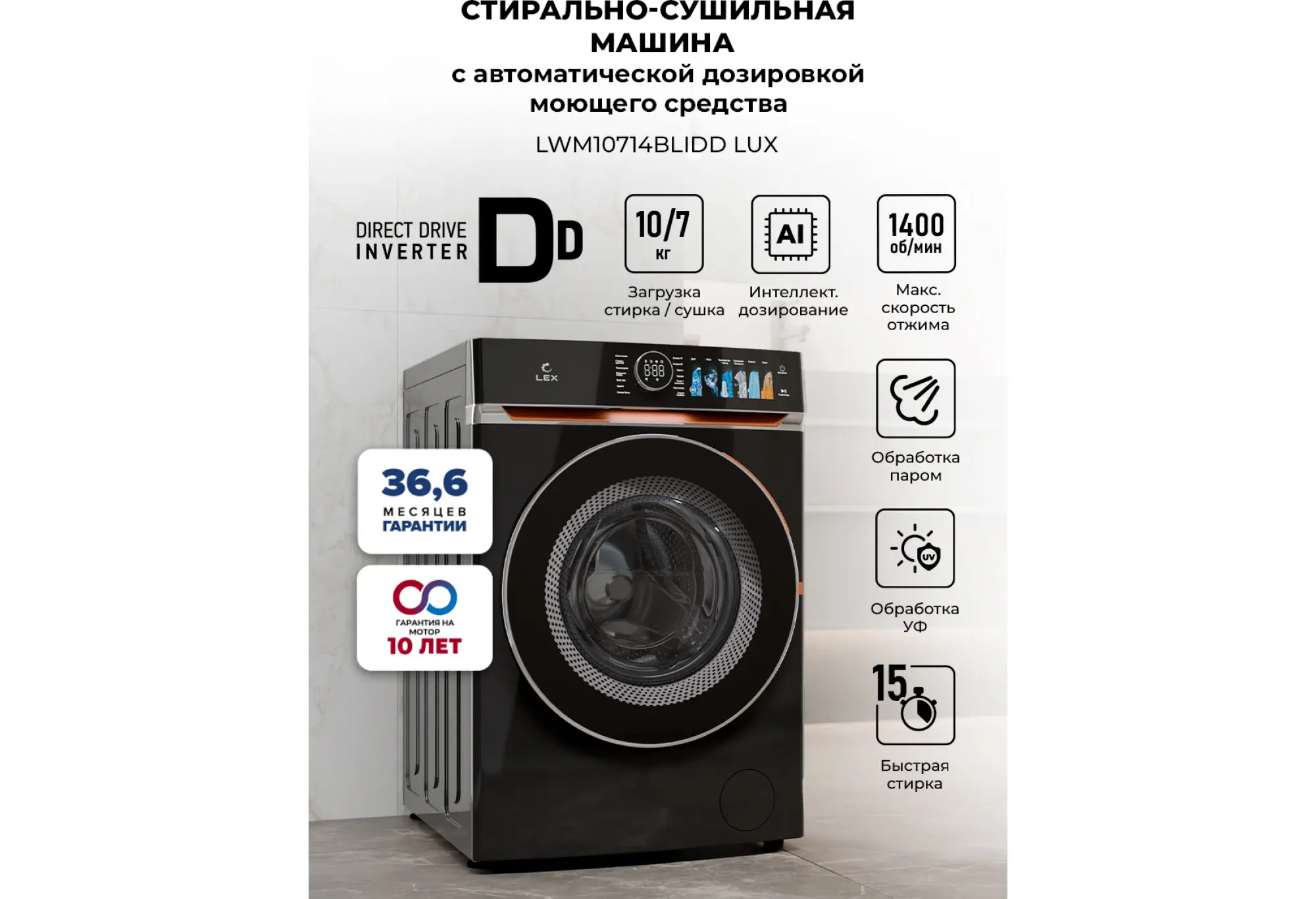Модель LEX LWM10714 Lux — это отдельностоящая стирально-сушильная машина с сенсорным управлением и премиальным дизайном, доступная в черном и белом цветах.Важные преимущества:14+ программ стирки:А дополнительные функции (обработка ультрафиолетом, дополнительное полоскание и др.) помогут справиться с любым загрязнением и при этом сохранить ваше бельё на долгие годы.