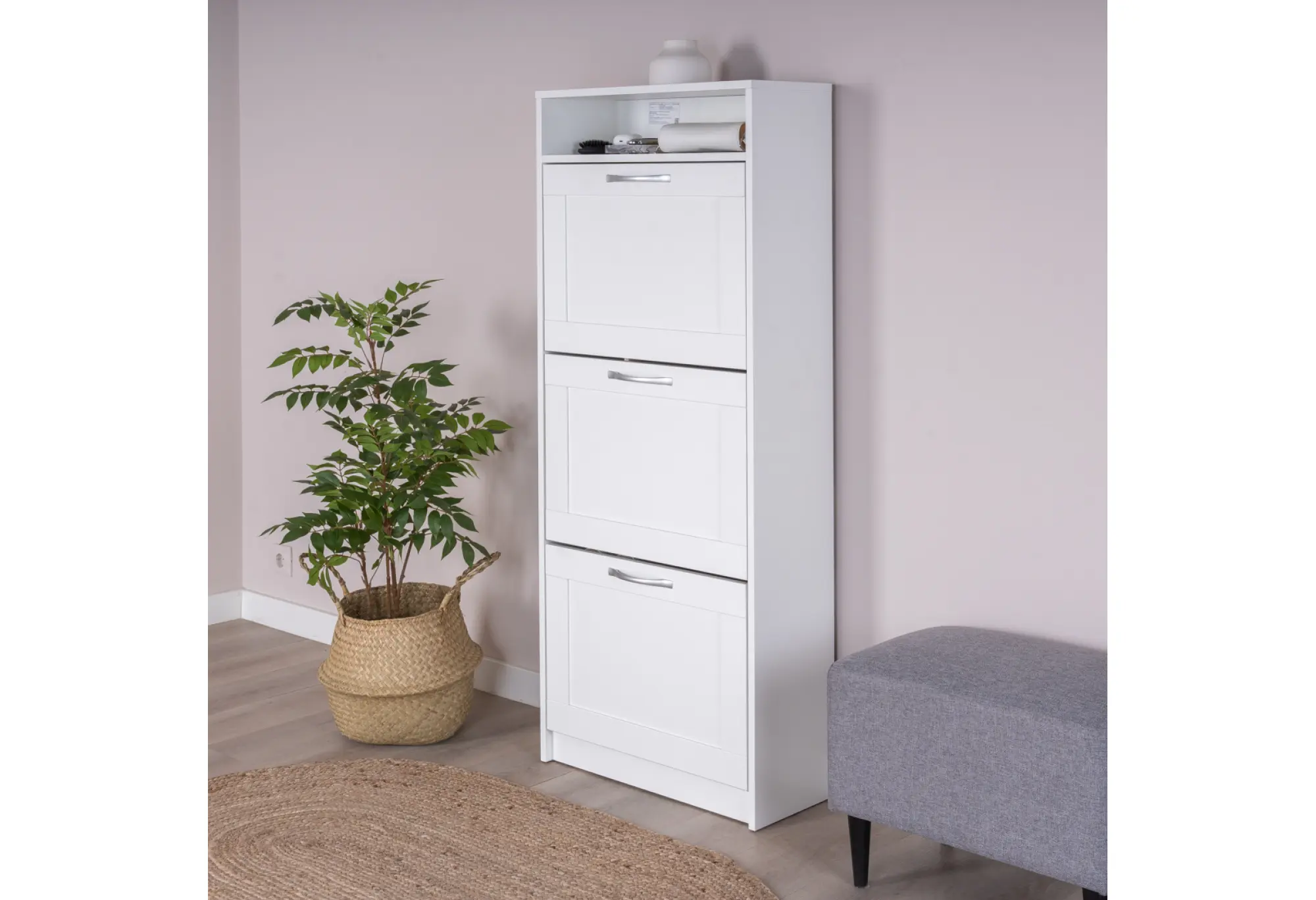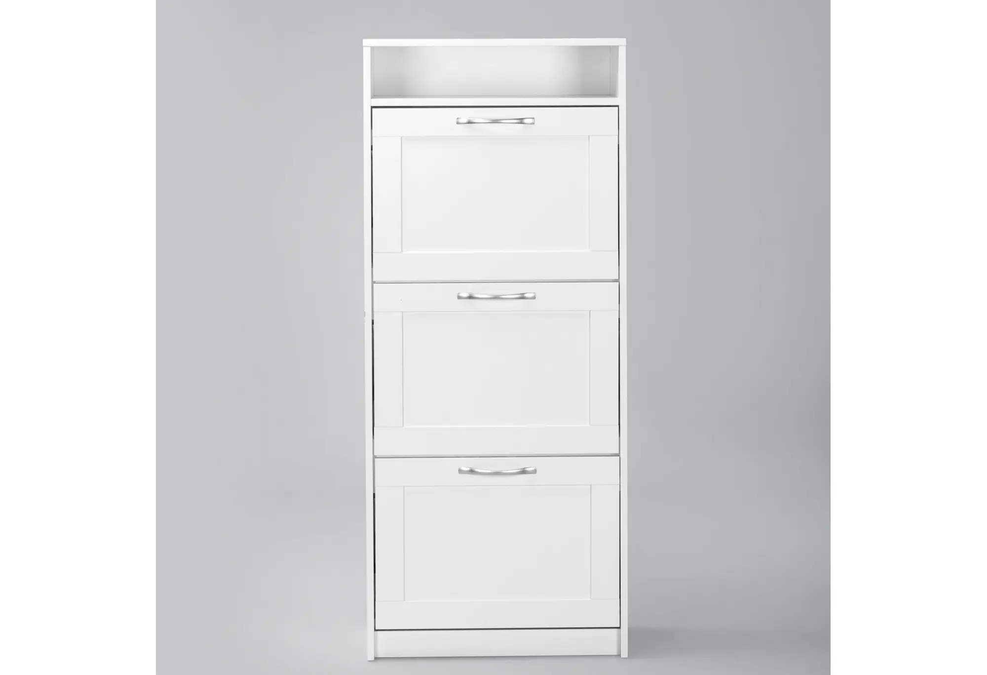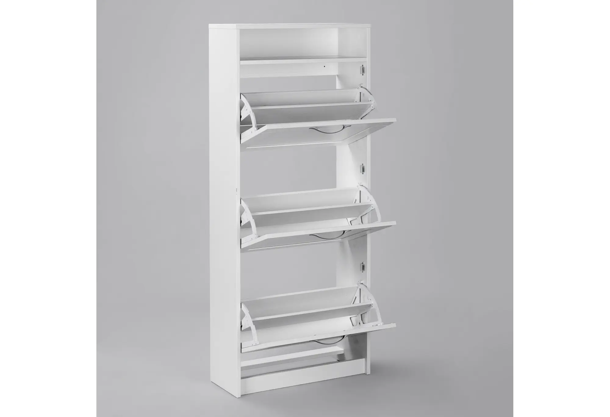 Модель оборудована тремя откидными полками для обуви, закрытыми фронтальными фасадами с продольными ручками, что упрощает доступ к содержимому. Конструкция рассчитана на хранение обуви в вертикальном формате, что помогает рационально использовать площадь. Над секциями для обуви предусмотрена открытая ниша, подходящая для повседневных мелочей, средств по уходу за обувью или декоративных аксессуаров. Для надежной фиксации и безопасности эксплуатации тумба крепится к стене, что особенно важно при её высокой и узкой форме.