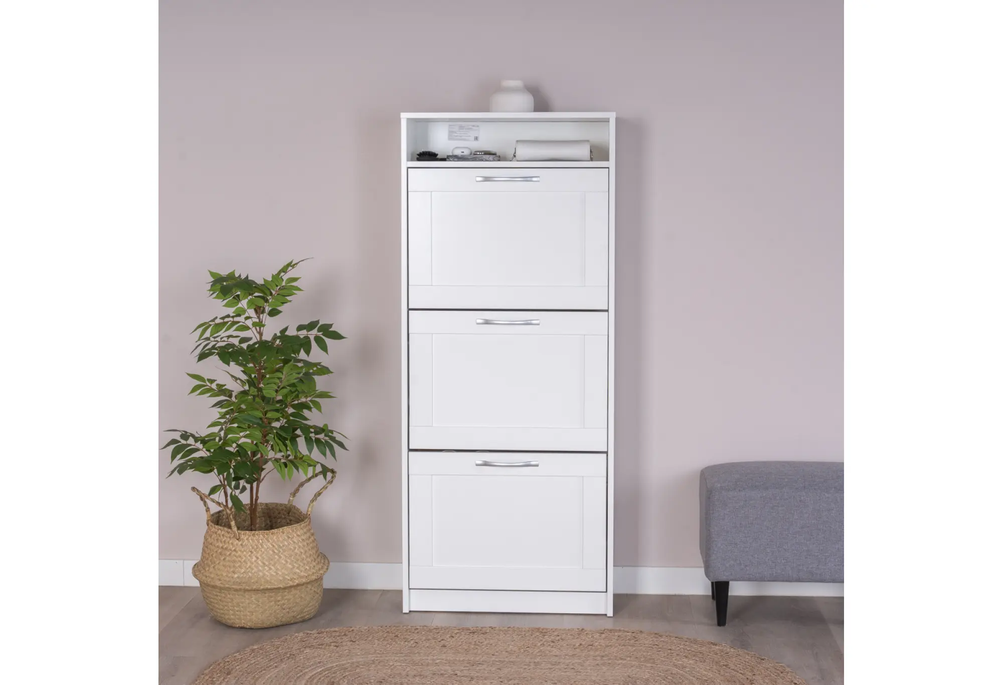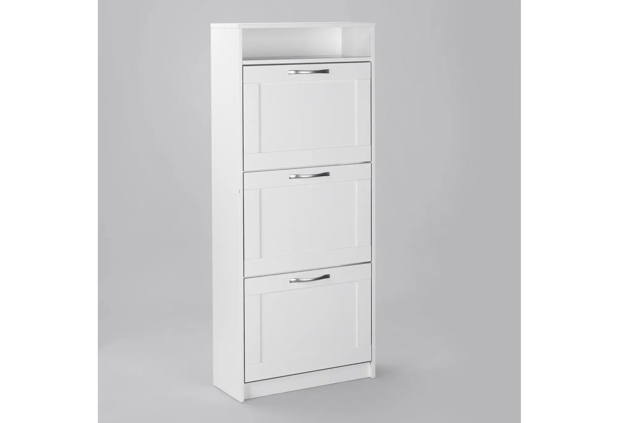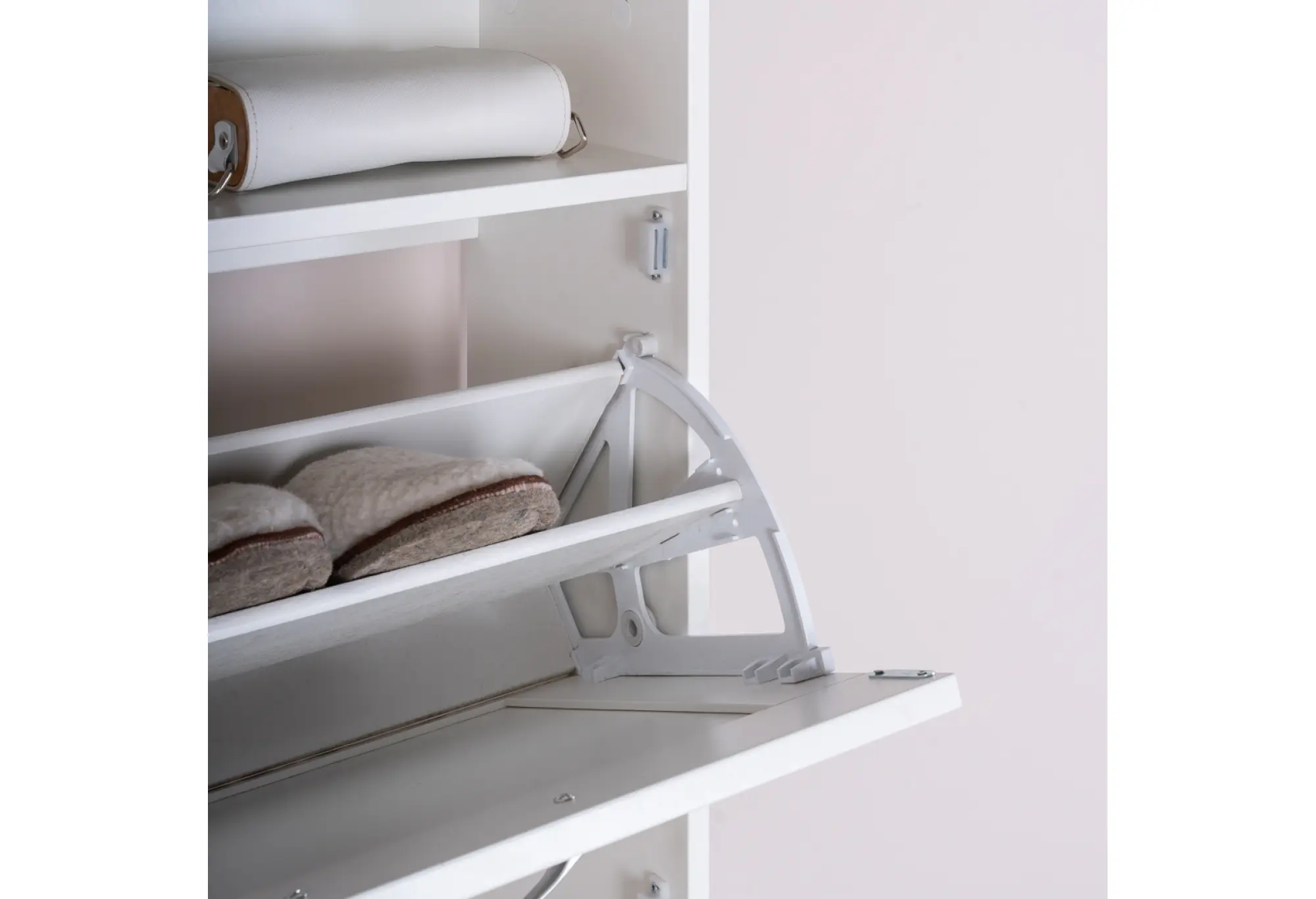Модель оборудована тремя откидными полками для обуви, закрытыми фронтальными фасадами с продольными ручками, что упрощает доступ к содержимому. Конструкция рассчитана на хранение обуви в вертикальном формате, что помогает рационально использовать площадь. Над секциями для обуви предусмотрена открытая ниша, подходящая для повседневных мелочей, средств по уходу за обувью или декоративных аксессуаров. Для надежной фиксации и безопасности эксплуатации тумба крепится к стене, что особенно важно при её высокой и узкой форме.