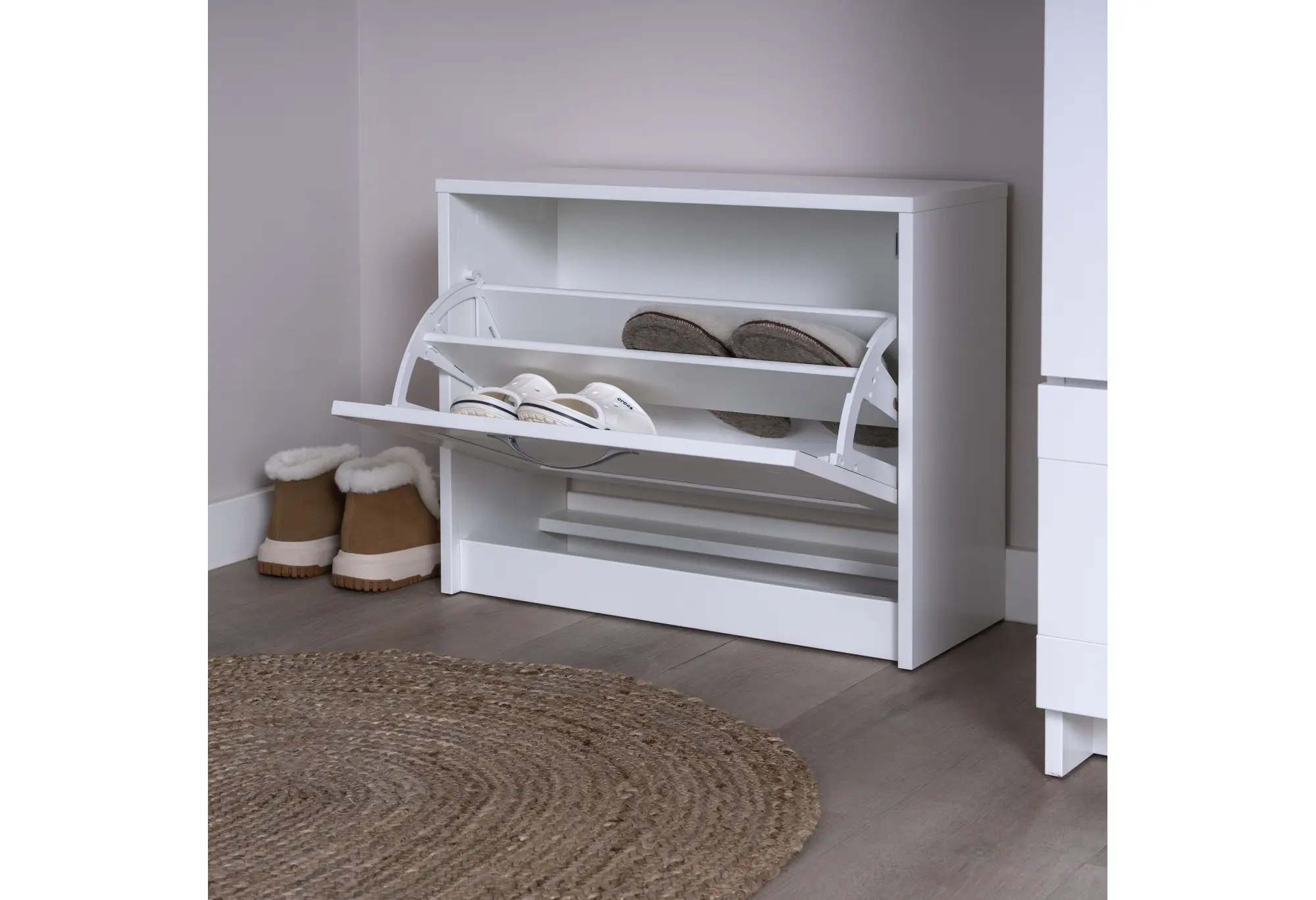 - Откидная полка для аккуратного размещения обуви внутри тумбы