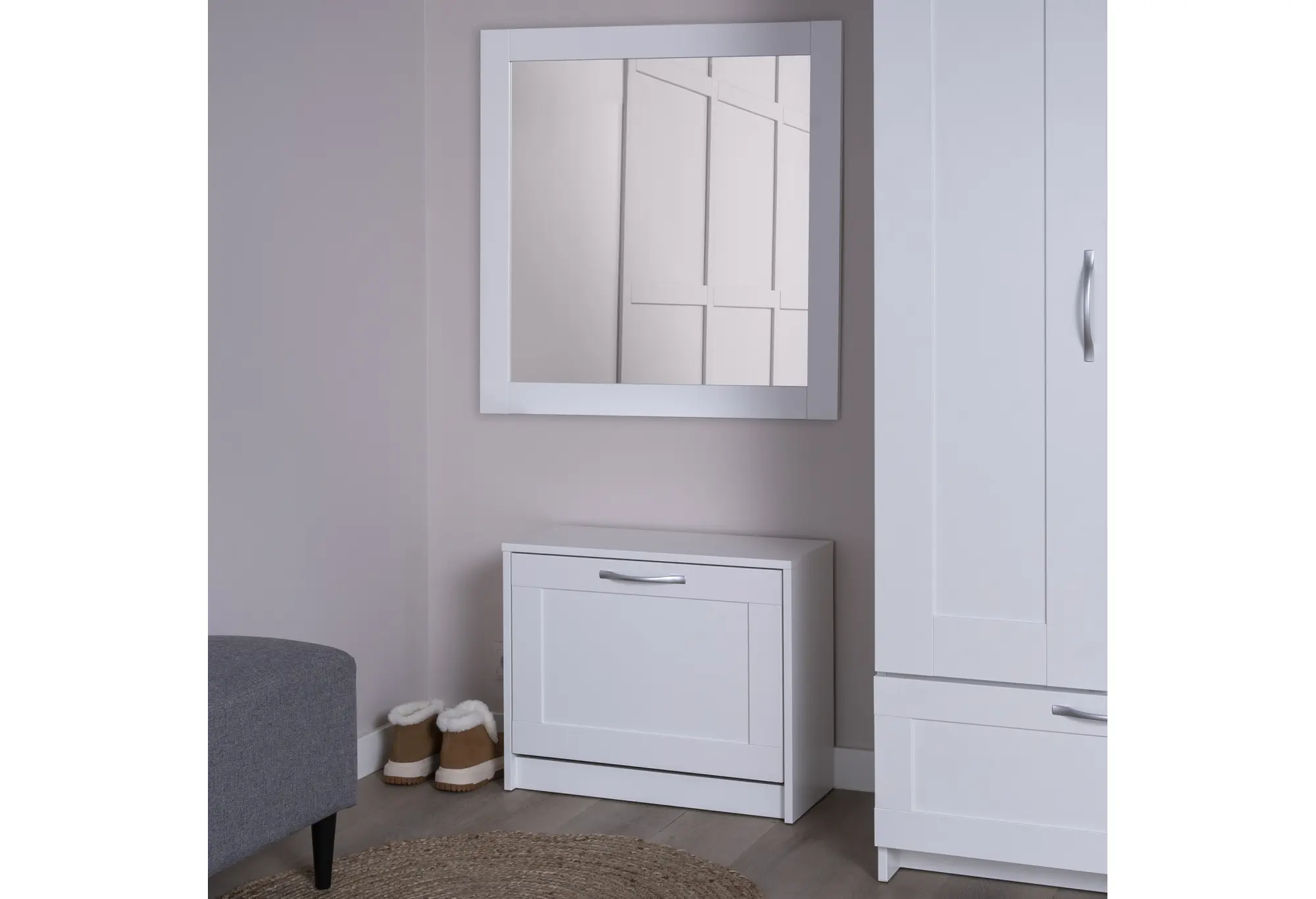 Компактная тумба для обуви «СИРИУС» в белом цвете создана для аккуратного хранения обуви в прихожей при минимальном расходе пространства. Корпус выполнен из кашированного ДСП толщиной 16 мм, что обеспечивает устойчивость конструкции и сохранение формы при регулярном использовании. Откидная полка позволяет разместить обувь внутри тумбы и закрыть фасад, поддерживая порядок и аккуратный внешний вид зоны у входа.