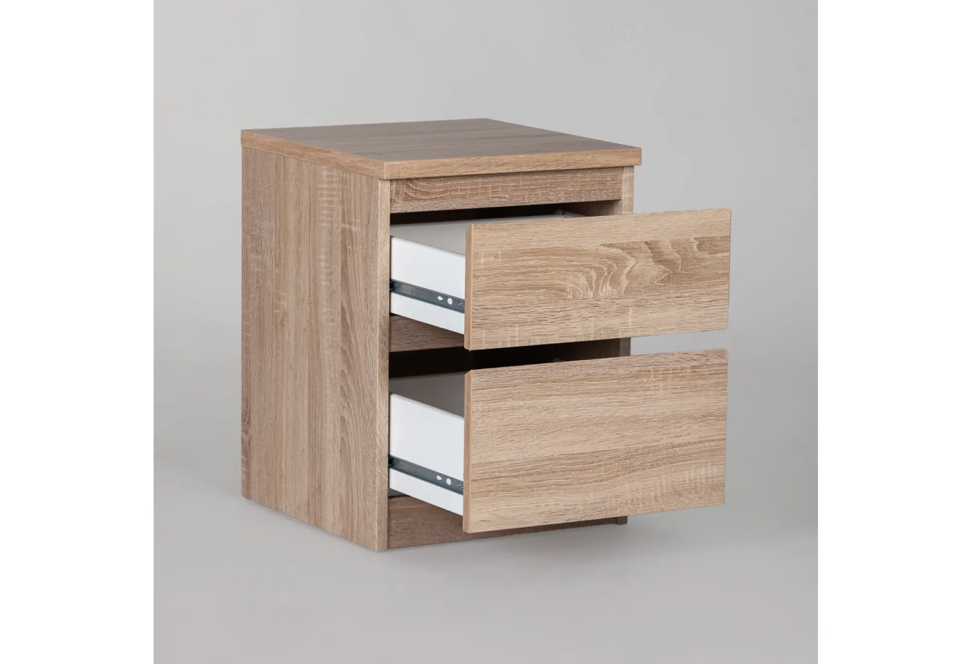 Компактная тумба с двумя выдвижными ящиками в оттенке дуб сонома создана для удобного хранения мелочей и документов в спальне, кабинете или гостиной. Нейтральный серовато-древесный тон легко сочетается с большинством современных интерьеров и не перегружает пространство.