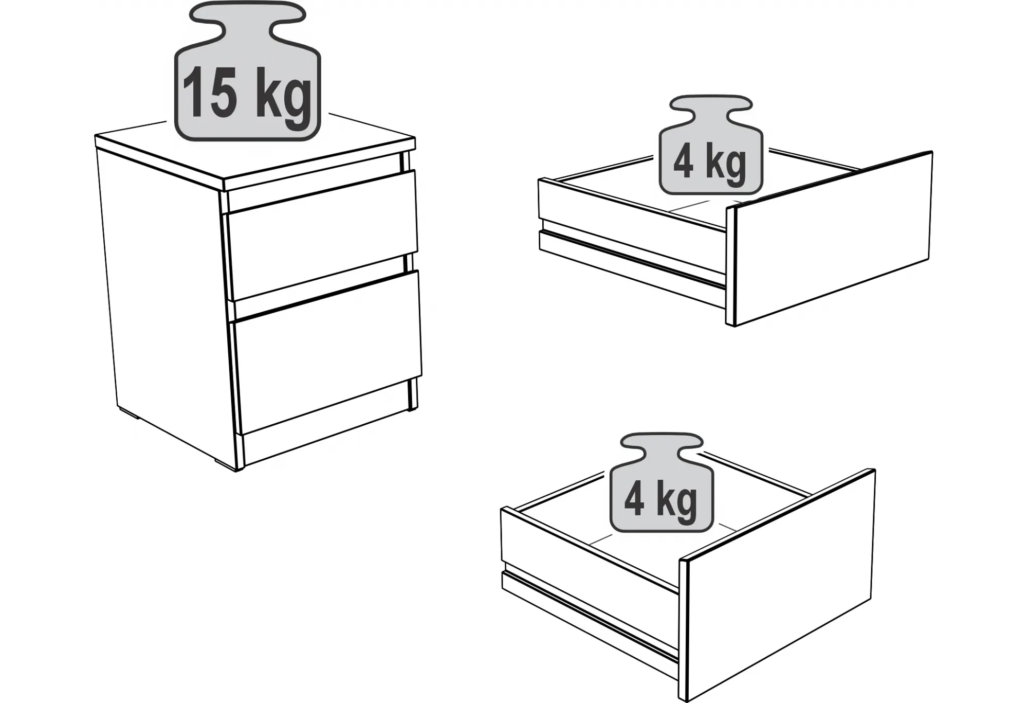 Корпус и фасады выполнены из кДСП, что обеспечивает устойчивость к повседневным нагрузкам и простоту в уходе. Поверхность достаточно протереть мягкой слегка влажной тканью. Два ящика рассчитаны на нагрузку до 4 кг каждый — это оптимально для хранения бумаг, аксессуаров, небольших вещей и канцелярии.