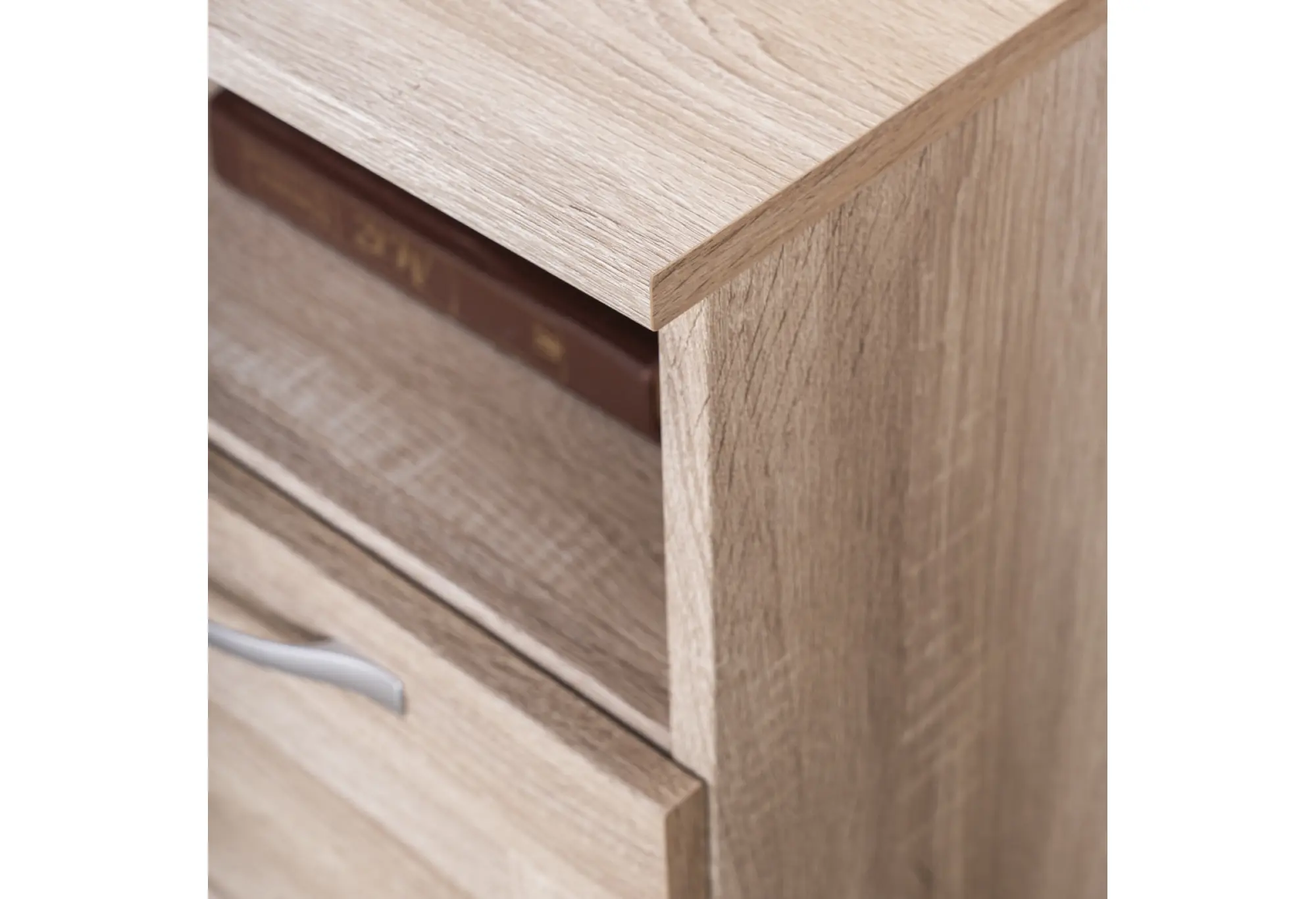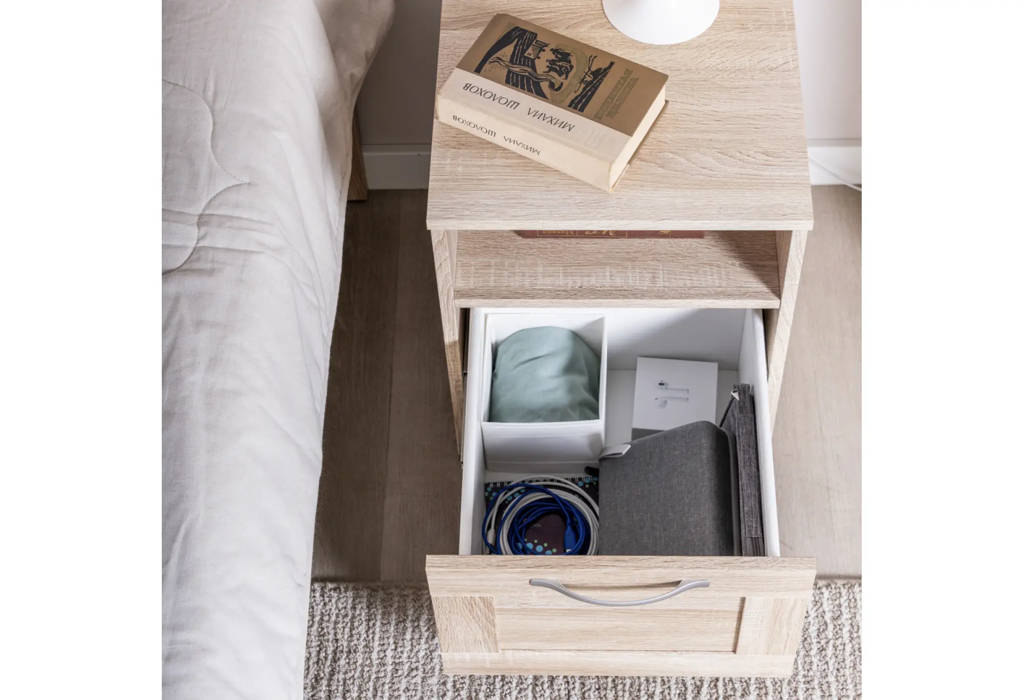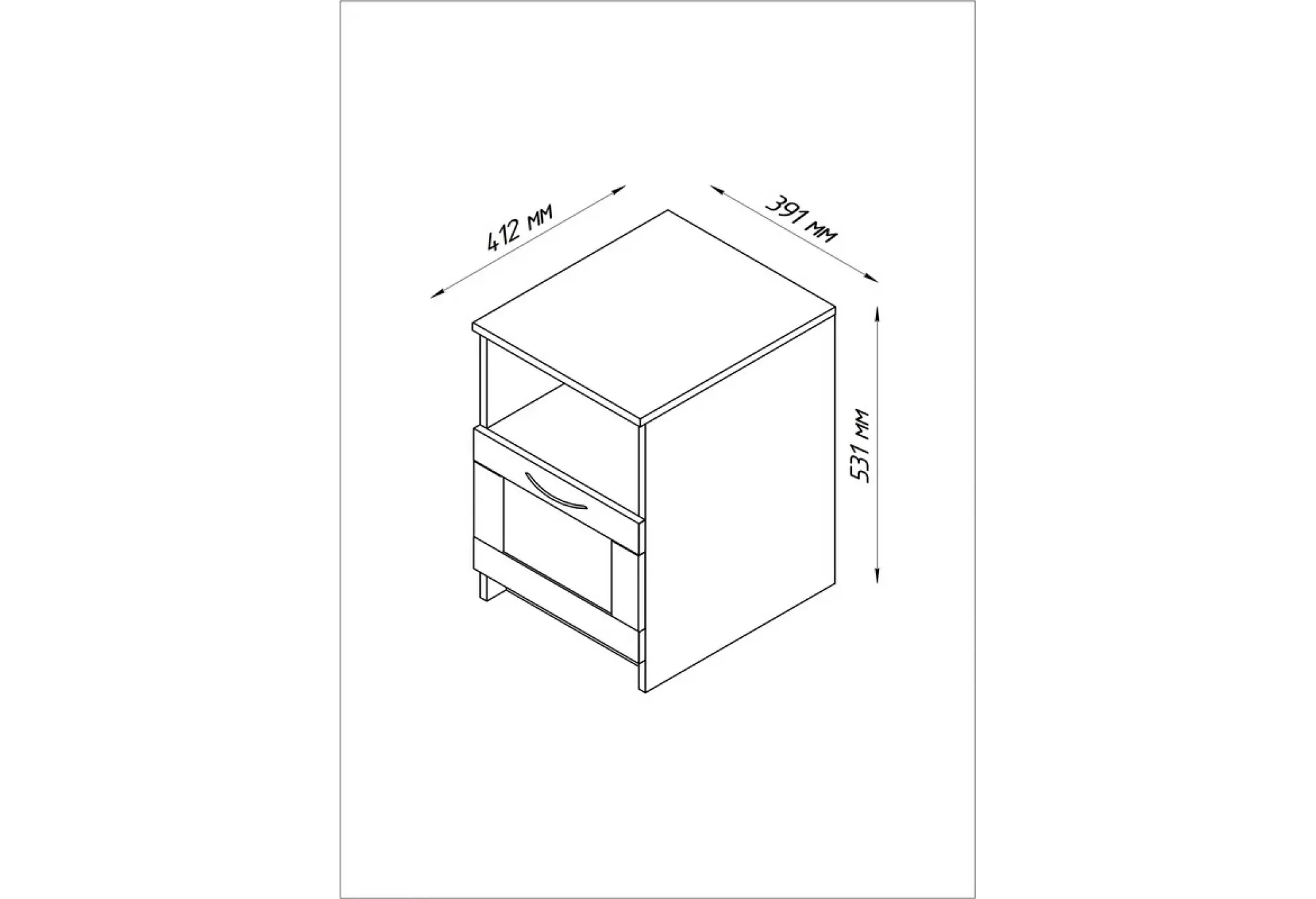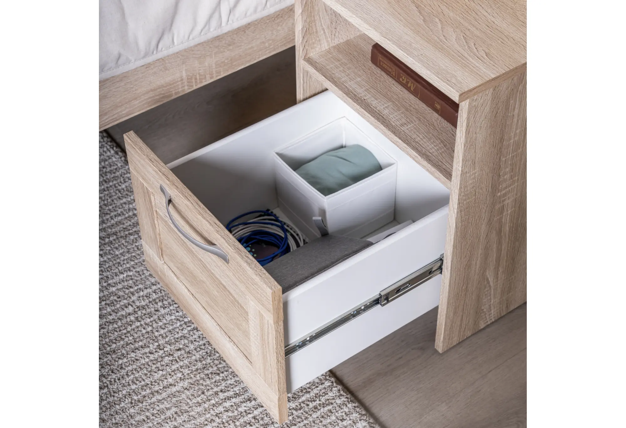 Продуманная конструкция включает открытую нишу для книг, техники или полезных мелочей, которые должны быть под рукой, и выдвижной ящик для более скрытого хранения. Ящик оснащен шариковыми направляющими, благодаря которым он выдвигается плавно и мягко, без рывков, а допустимая нагрузка до 8 кг позволяет хранить в нем достаточно тяжелые предметы — от документов до небольших аксессуаров.