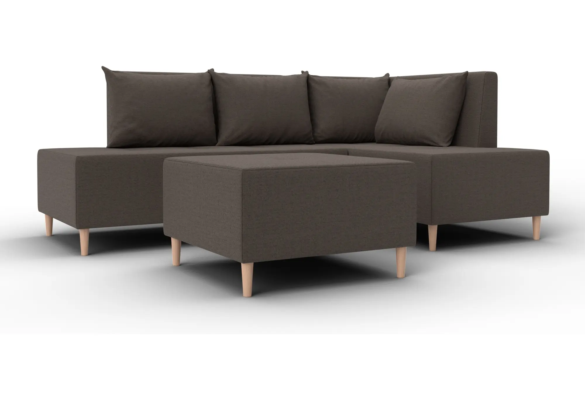 Модульный диван с пуфом Лига-126 – это современное решение для тех, кто ценит гибкость и функциональность. Модель состоит из двух основных модулей и отдельного пуфа. Вы можете собрать угловой диван, удобную зону отдыха или приставить пуф к дивану, чтобы удлинить спальное место. Прочный каркас из ДСП, ЛДСП, фанеры и бруса гарантирует надёжность и долгий срок службы. Мягкие съёмные подушки обеспечивают комфорт, а пуф (75×75×42 см) можно использовать как дополнительное сиденье, подставку для ног или небольшой столик. Высокие деревянные ножки придают дивану элегантный вид и облегчают уборку. Спальное место – 60×197 см. Широкий выбор расцветок.