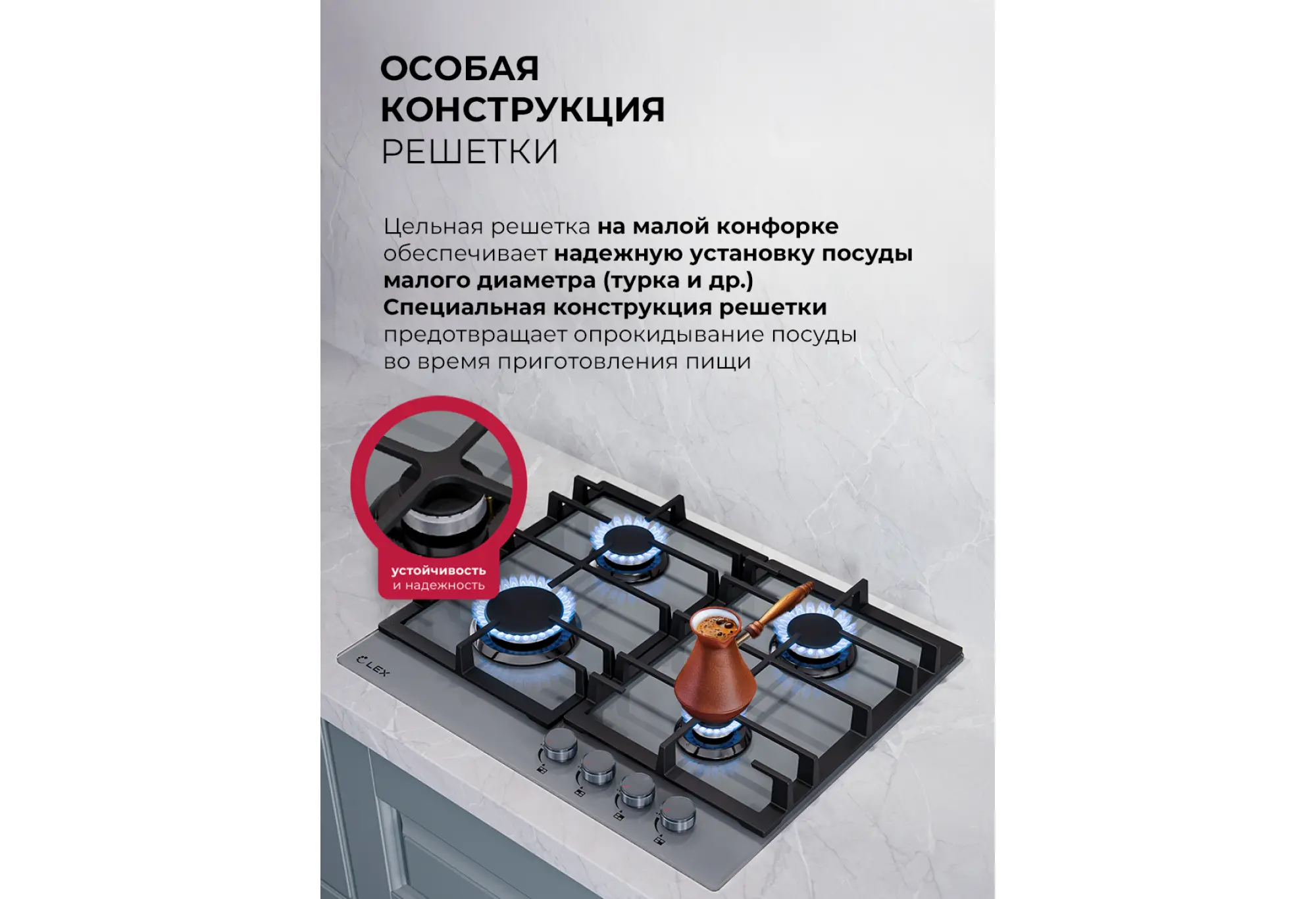 Газовая варочная поверхность GVG 642A с 4 конфорками и основой из белого или черного стекла поможет быстро и вкусно накормить всю семью. Большая конфорка хорошо подойдет для объемной кастрюли с супом, на двух средних можно одновременно готовить вторые блюда и гарнир, а на малой — сварить кофе по классическому рецепту. Благодаря продуманной конструкции решетки между посудой всегда останется достаточно места, а устойчиво расположить даже самую маленькую емкость не составит труда. Со встроенным электроподжигом приготовление будет максимально удобным.