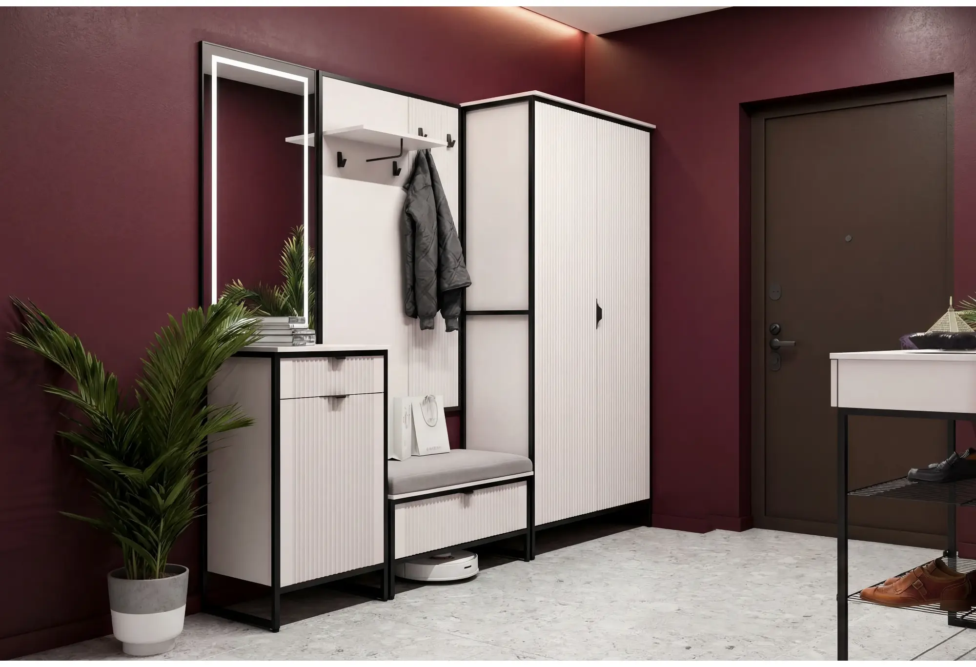 Преимущества:- Компактная глубина — удобно для узких коридоров