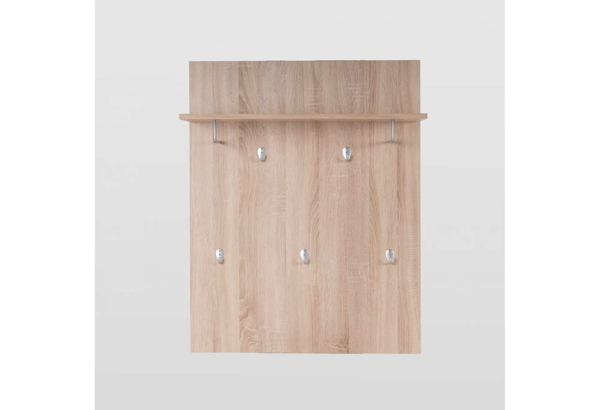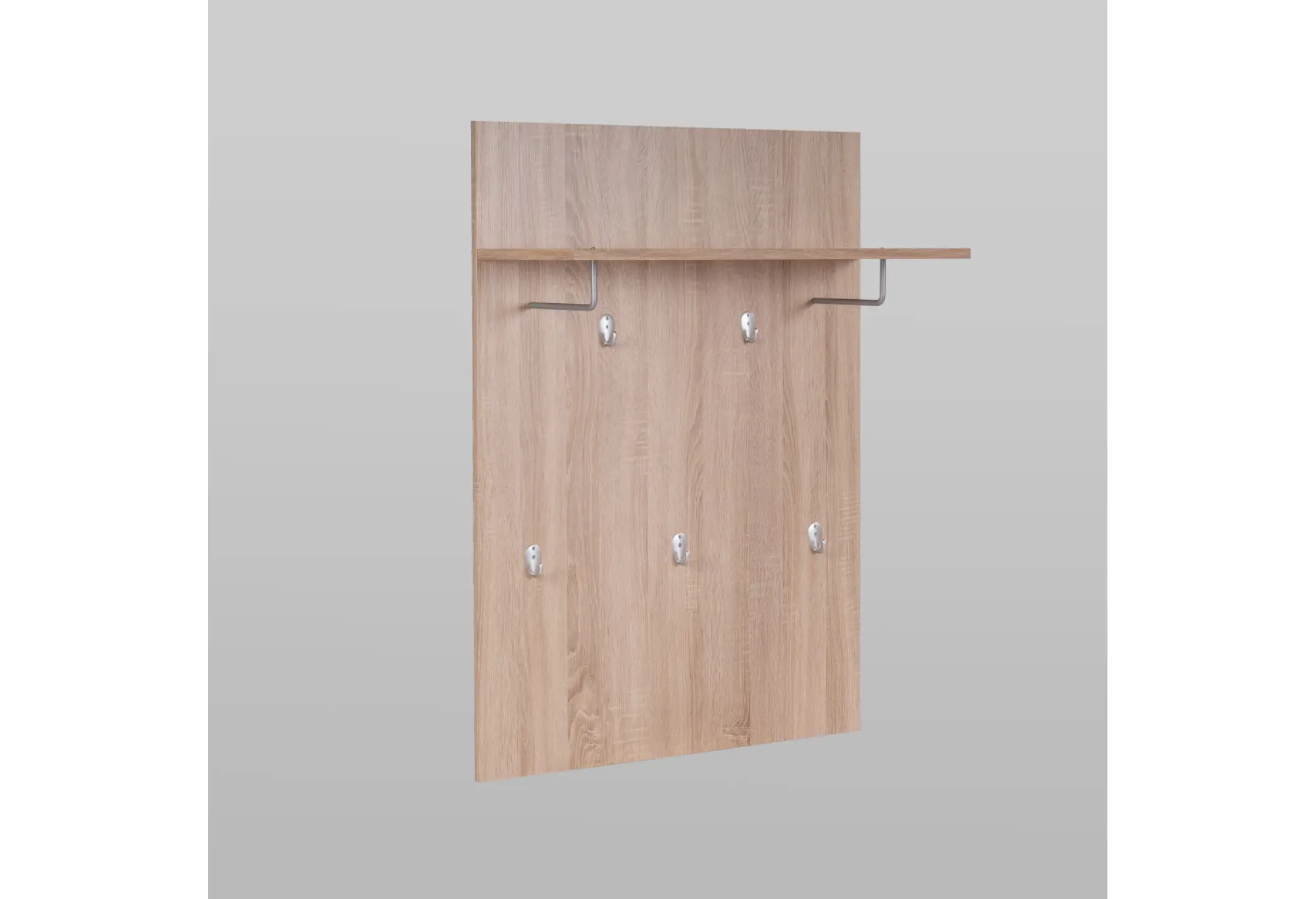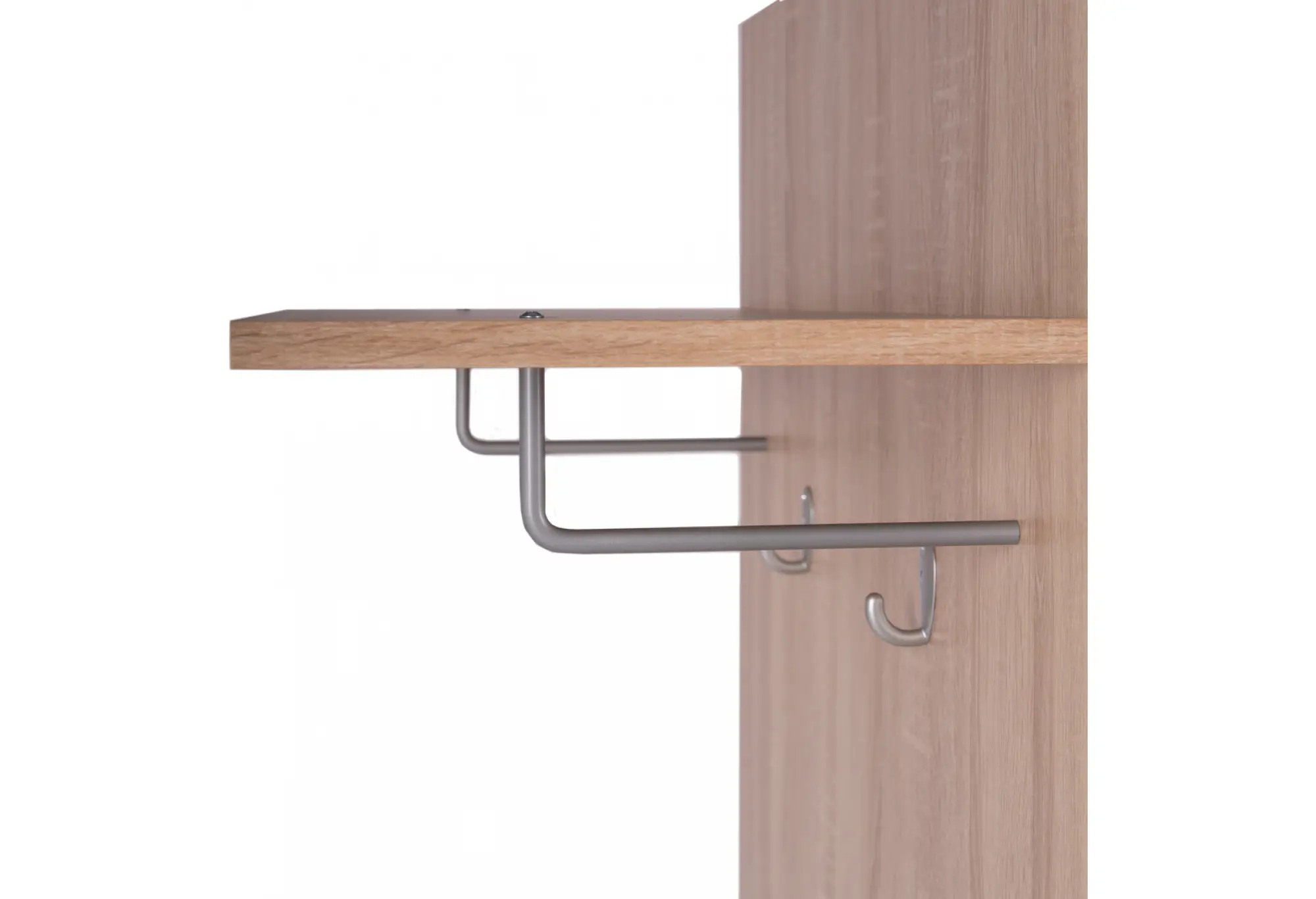 Основание выполнено из кашированного ДСП толщиной 16 мм с текстурой древесины, что добавляет интерьеру аккуратный и современный вид. Верхняя полка предназначена для головных уборов, шарфов, перчаток или коробок для хранения. Надежные крючки расположены по высоте так, чтобы одежда располагалась удобно и не мешала при проходе.