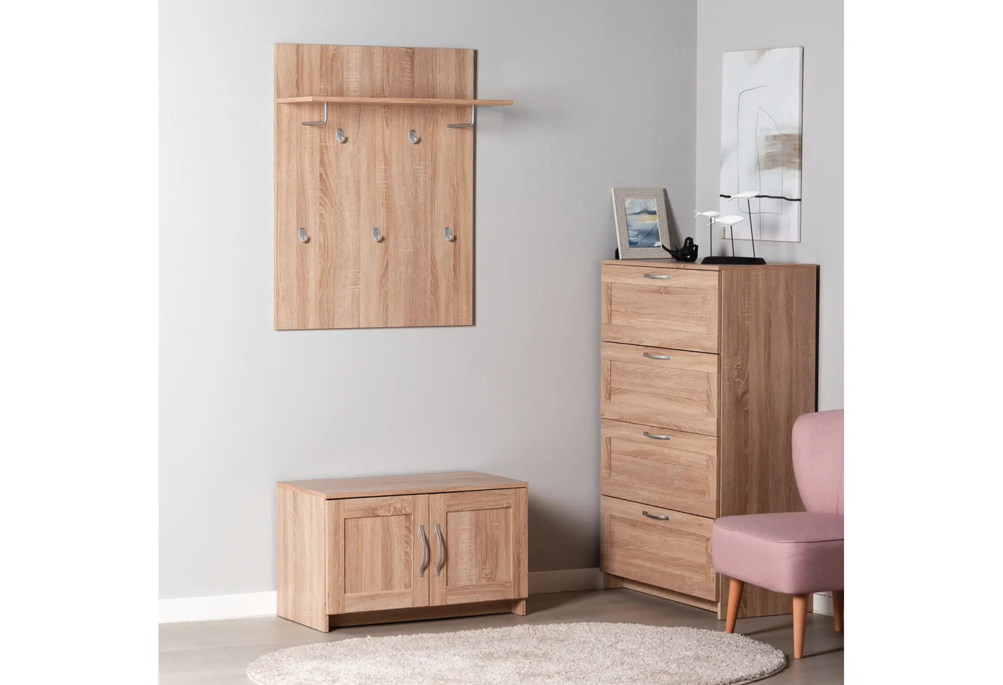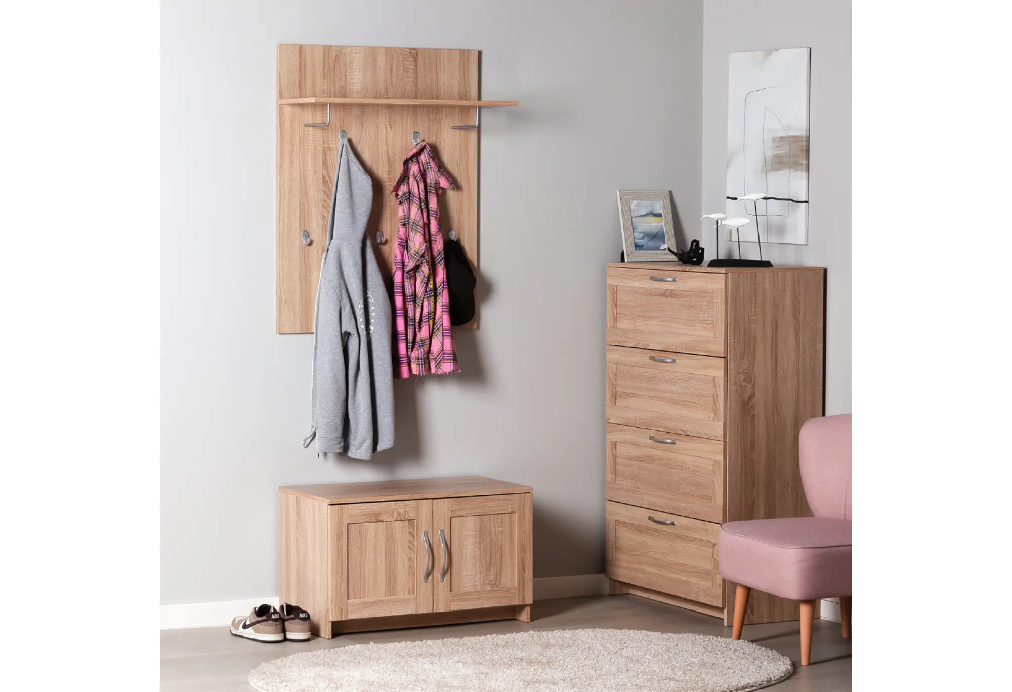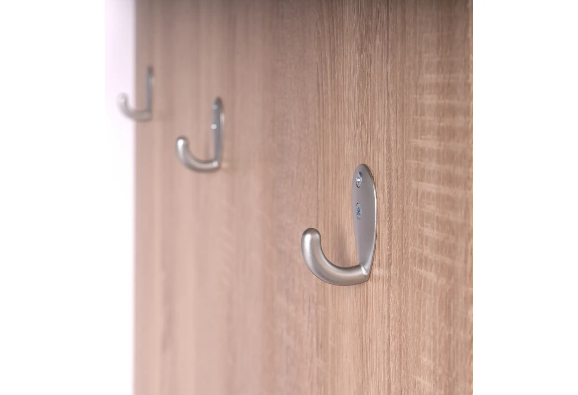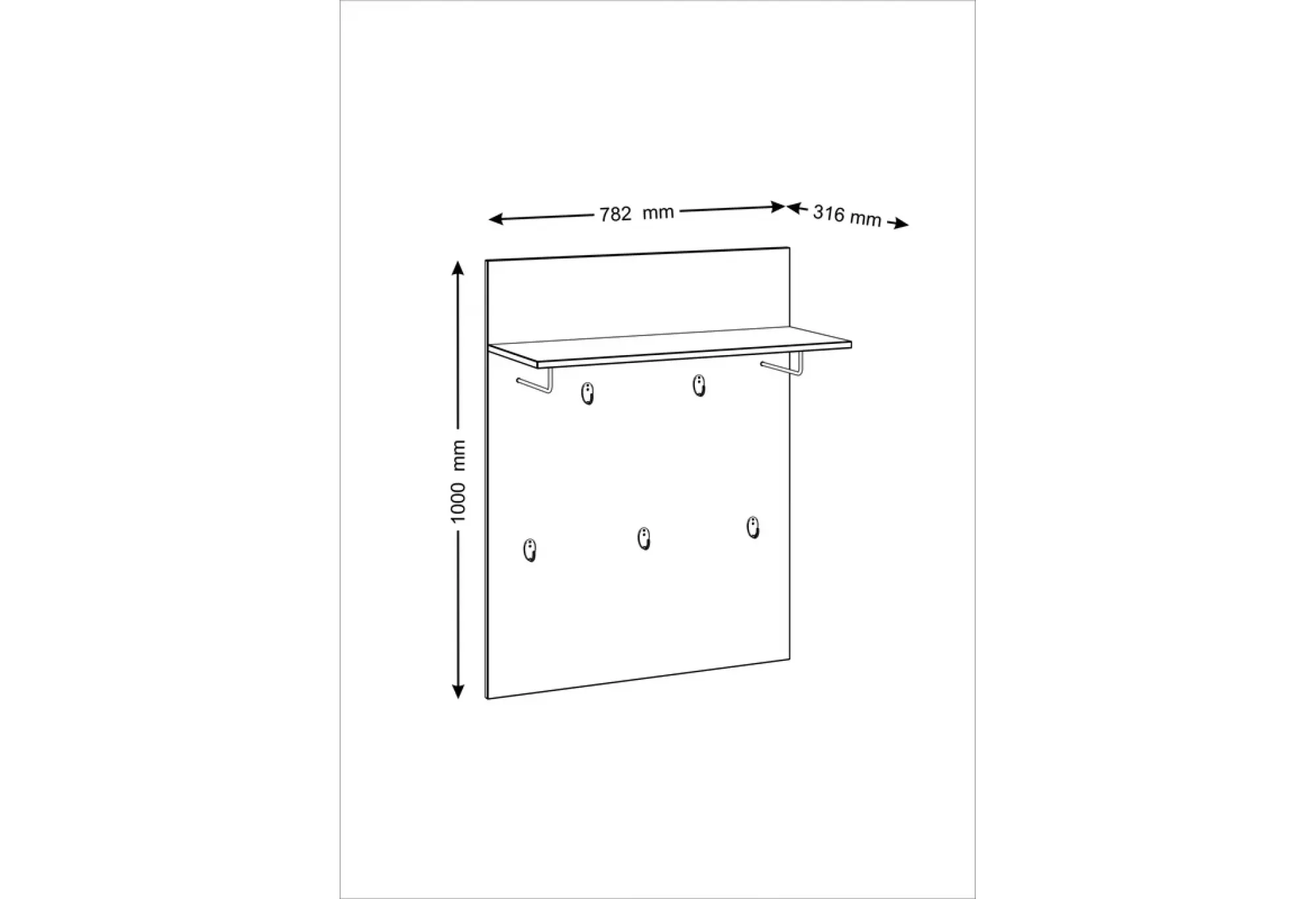 Основание выполнено из кашированного ДСП толщиной 16 мм с текстурой древесины, что добавляет интерьеру аккуратный и современный вид. Верхняя полка предназначена для головных уборов, шарфов, перчаток или коробок для хранения. Надежные крючки расположены по высоте так, чтобы одежда располагалась удобно и не мешала при проходе.