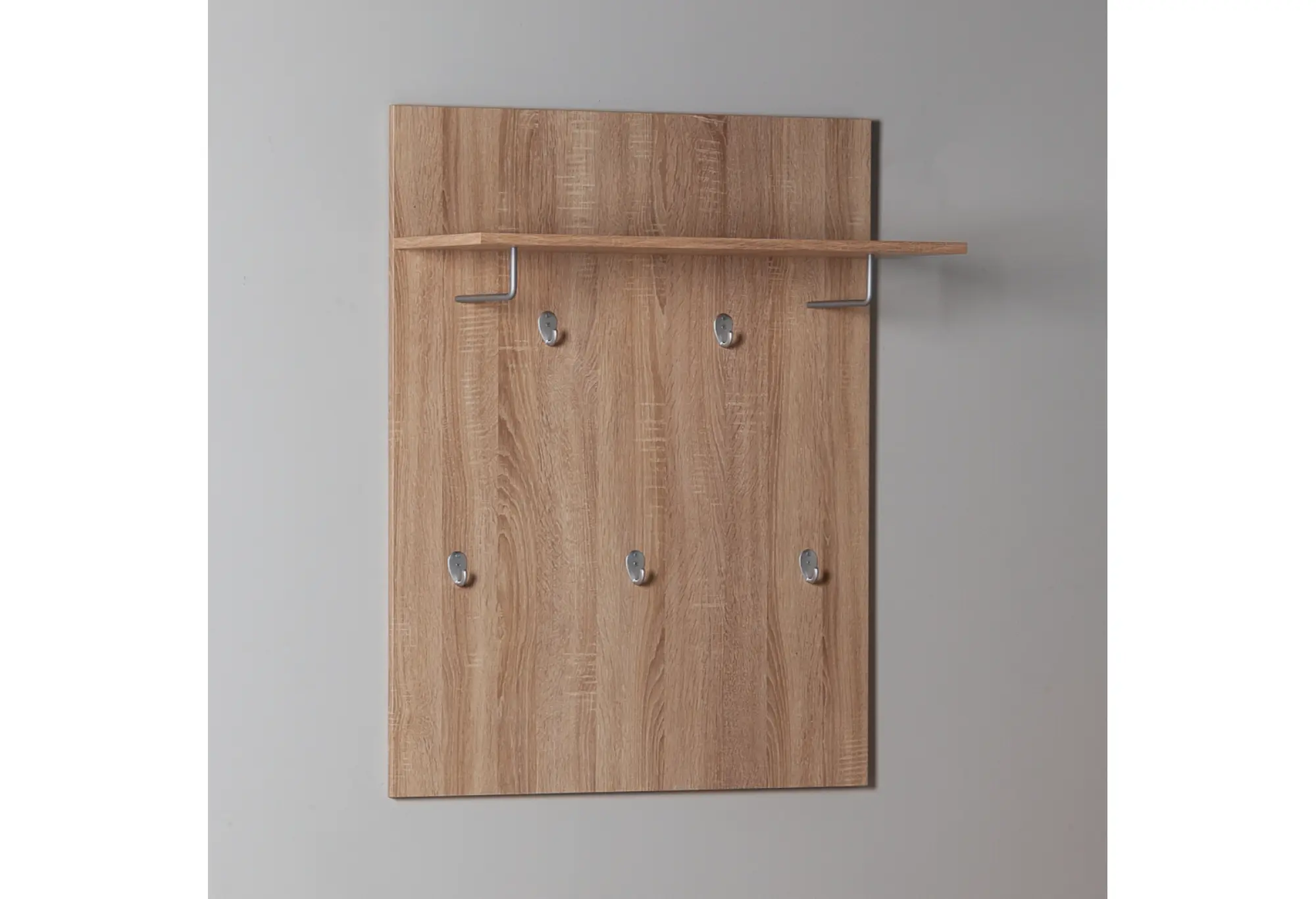 Настенный тип крепления позволяет установить вешалку на нужной высоте, подстраивая её под особенности помещения. Лаконичный дизайн и универсальный оттенок Дуб Сонома легко сочетаются с большинством мебельных серий и отделкой стен.