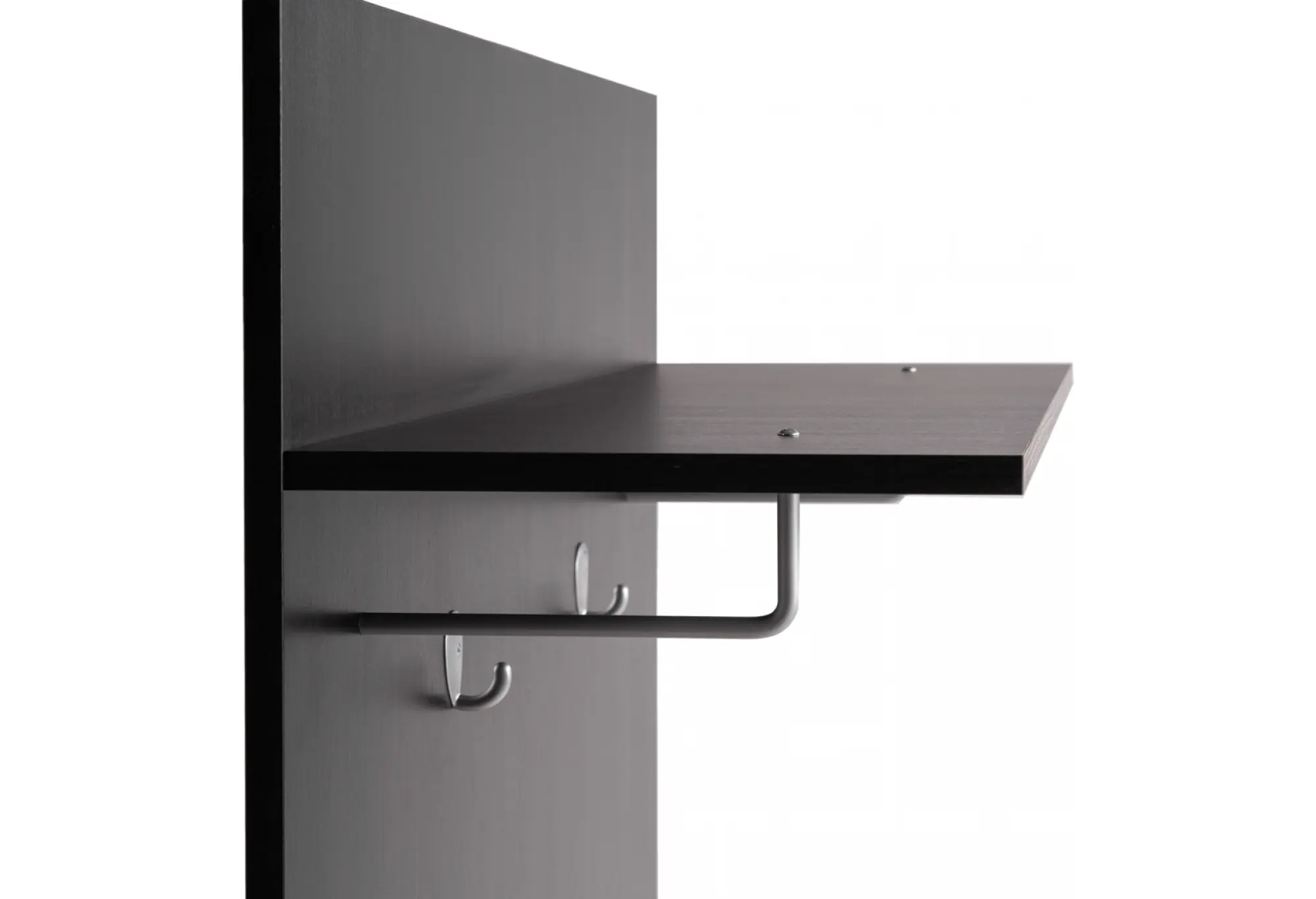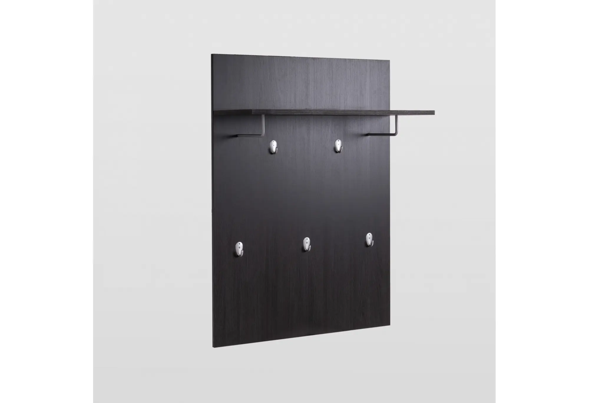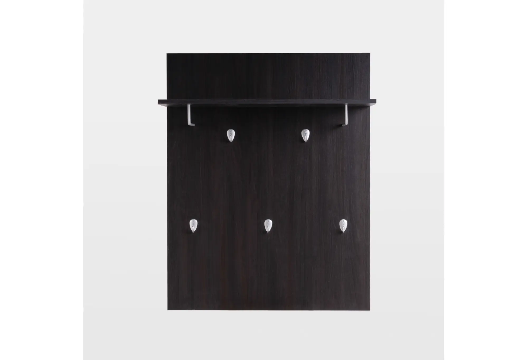 Настенная вешалка «СИРИУС» в цвете дуб венге — компактное решение для прихожей или офисного пространства. Основание из кашированного ДСП толщиной 16 мм образует строгую вертикальную панель глубиной 316 мм и шириной 782 мм, на которой равномерно расположены настенные крючки для верхней одежды и аксессуаров. Над крючками предусмотрена полка для головных уборов и лёгких вещей, что помогает рационально использовать вертикальное пространство.